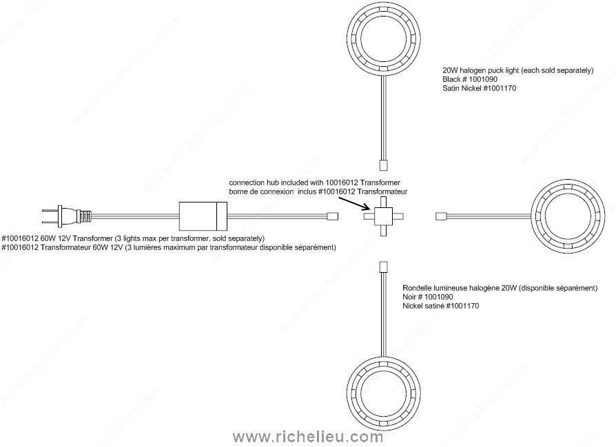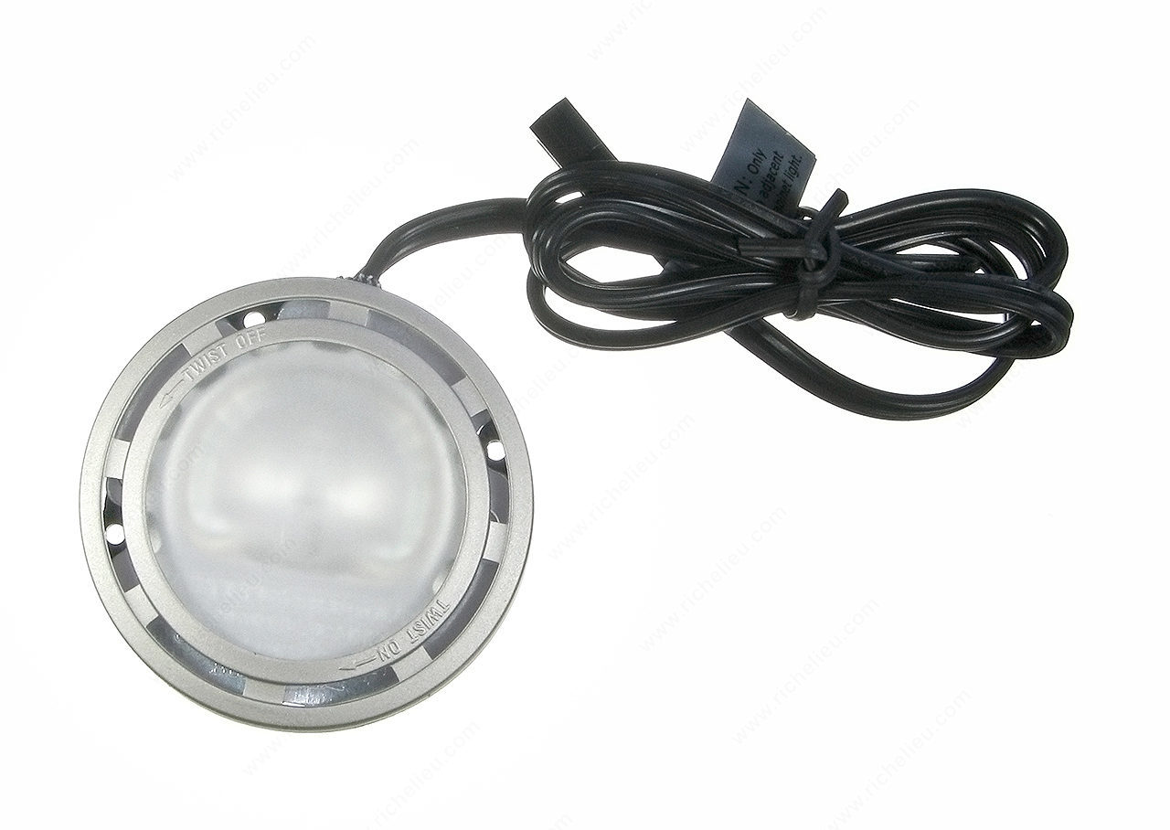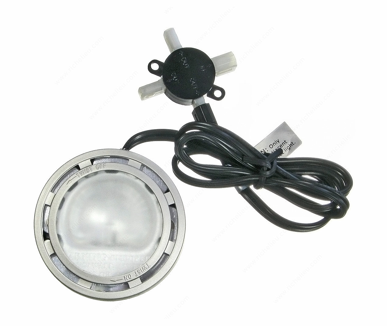 Richelieu 1001170 Richelieu's 20W Puck Light is designed to elevate your furniture with subtle yet effective illumination. This low-profile halogen puck light seamlessly integrates into your kitchen, office, or furniture projects, making it a versatile choice for enhancing any space. With a diameter of 2 5/8 inches and a recessed mounting depth of just 5/8 inch, it offers a sleek, contemporary look that won't disrupt your design. Available in a stylish satin nickel finish, this puck light features a warm white light color that creates an inviting atmosphere, perfect for task lighting. The dimmable capability allows you to adjust the brightness according to your needs, adding further customization to your lighting setup. Rated at 20 watts and operating at 12 volts, it delivers efficient performance while meeting UL standards for safety. Installation is straightforward, requiring a bore hole of 2 3/16 inches, and it can be conveniently shipped via UPS. Whether you're illuminating cabinets or highlighting furniture, Richelieu's 20W Puck Light offers a blend of functionality and style that makes it an elite choice for discerning homeowners and building professionals alike. Transform your spaces with this essential lighting solution.
