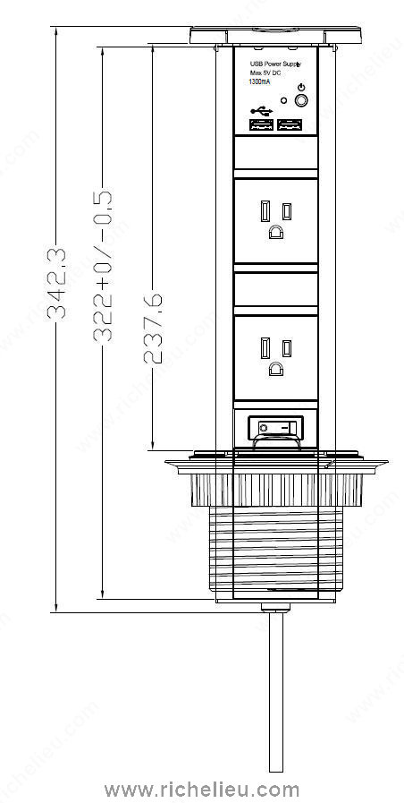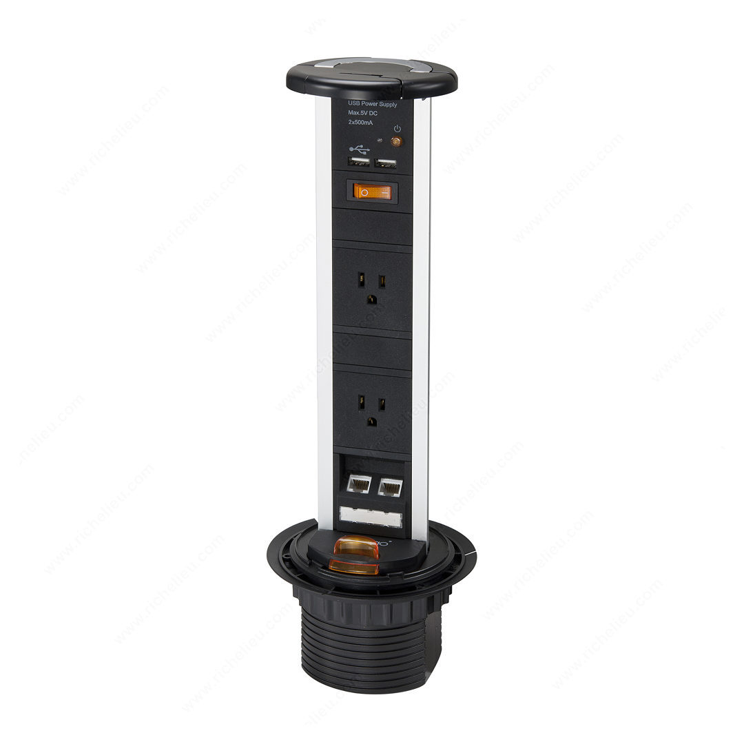 Richelieu 100492090 Richelieu 2-Plug Pop-Up Power Bar is the ideal solution for modern spaces seeking functionality without sacrificing style. This retractable power bar is designed for convenience, seamlessly integrating into your countertop or workspace when not in use. With a sleek black finish, it complements contemporary interiors while providing essential power access. Equipped with two power receptacles, a USB port, and an RJ45 connector, this pop-up power bar caters to a variety of electronic devices, making it perfect for both home and professional environments. Its recessed mounting ensures a clean and unobtrusive appearance, while the 12 7/8-inch height allows for easy accessibility. Certified by ETL for safety, the Richelieu pop-up power bar operates at 120 V, ensuring reliable performance. It offers an optimum price point, making it a smart investment for those who value quality and utility. Whether you're outfitting a kitchen, office, or workshop, the Richelieu 2-Plug Pop-Up Power Bar enhances productivity and keeps your space organized. Experience the perfect blend of practicality and modern design with this versatile power solution.