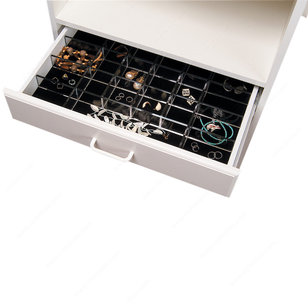 Richelieu 11120190 Jewelry Compartments offers an elegant and practical solution for organizing your precious jewels. Designed with functionality in mind, this set includes clear acrylic dividers that ensure your accessories are neatly separated and easily accessible. Accompanying these dividers is a customizable velvet mat, which can be trimmed to fit seamlessly into your existing drawer. Constructed from high-quality acrylic, this jewelry organizer features a sophisticated black finish that complements any décor, adding a touch of luxury to your storage space. With dimensions of 22 inches in width, 12 11/16 inches in depth, and a height of 2 inches, it fits comfortably in most standard drawers, maximizing your storage capacity without compromising on style. Ideal for both professionals and discerning homeowners, the Richelieu Jewelry Compartments are particularly well-suited for those who appreciate the beauty of their collections and want to keep them organized. Shipping via UPS ensures a reliable delivery process, bringing this essential accessory right to your doorstep. Elevate your jewelry storage with Richelieu’s expertly designed compartments, where practicality meets elegance.