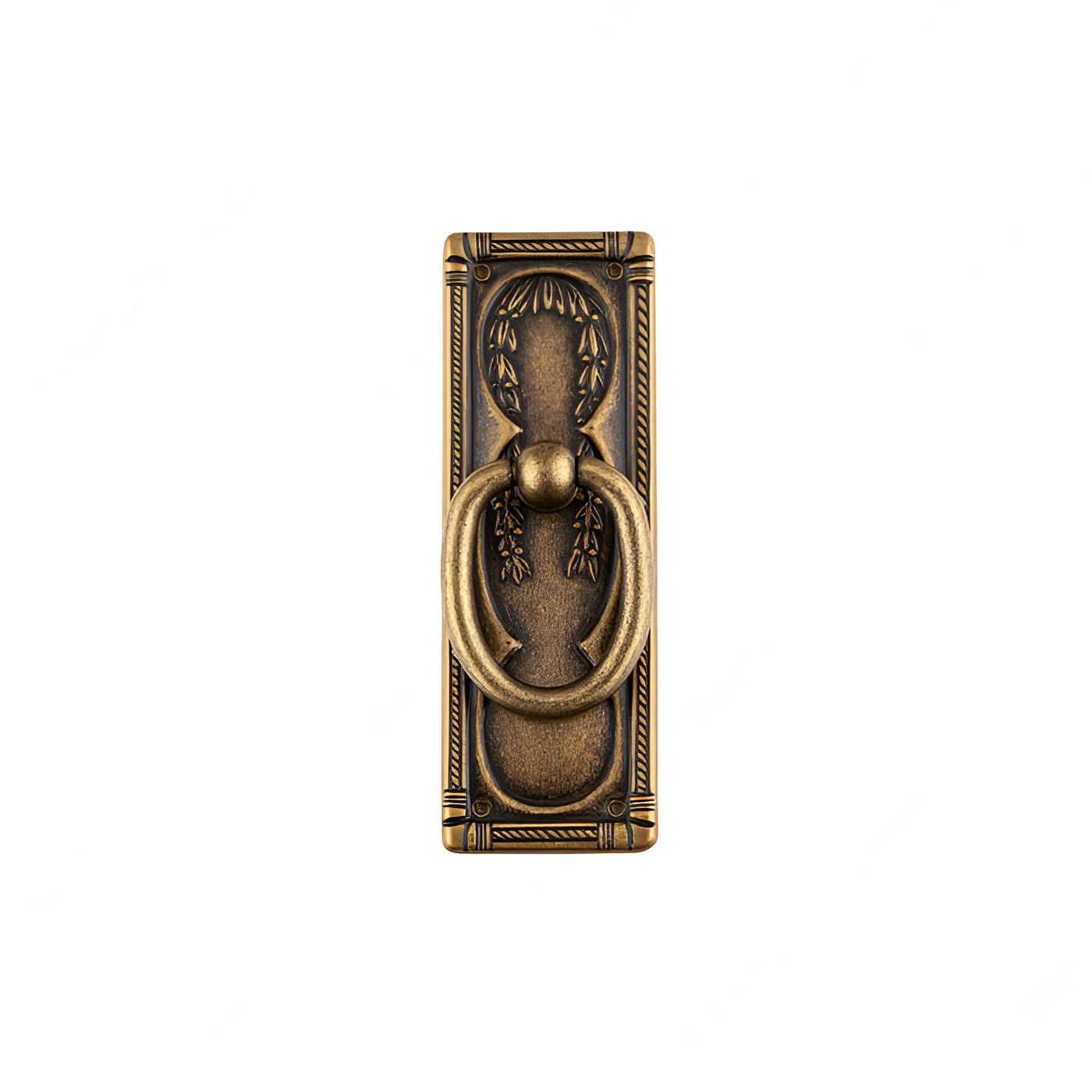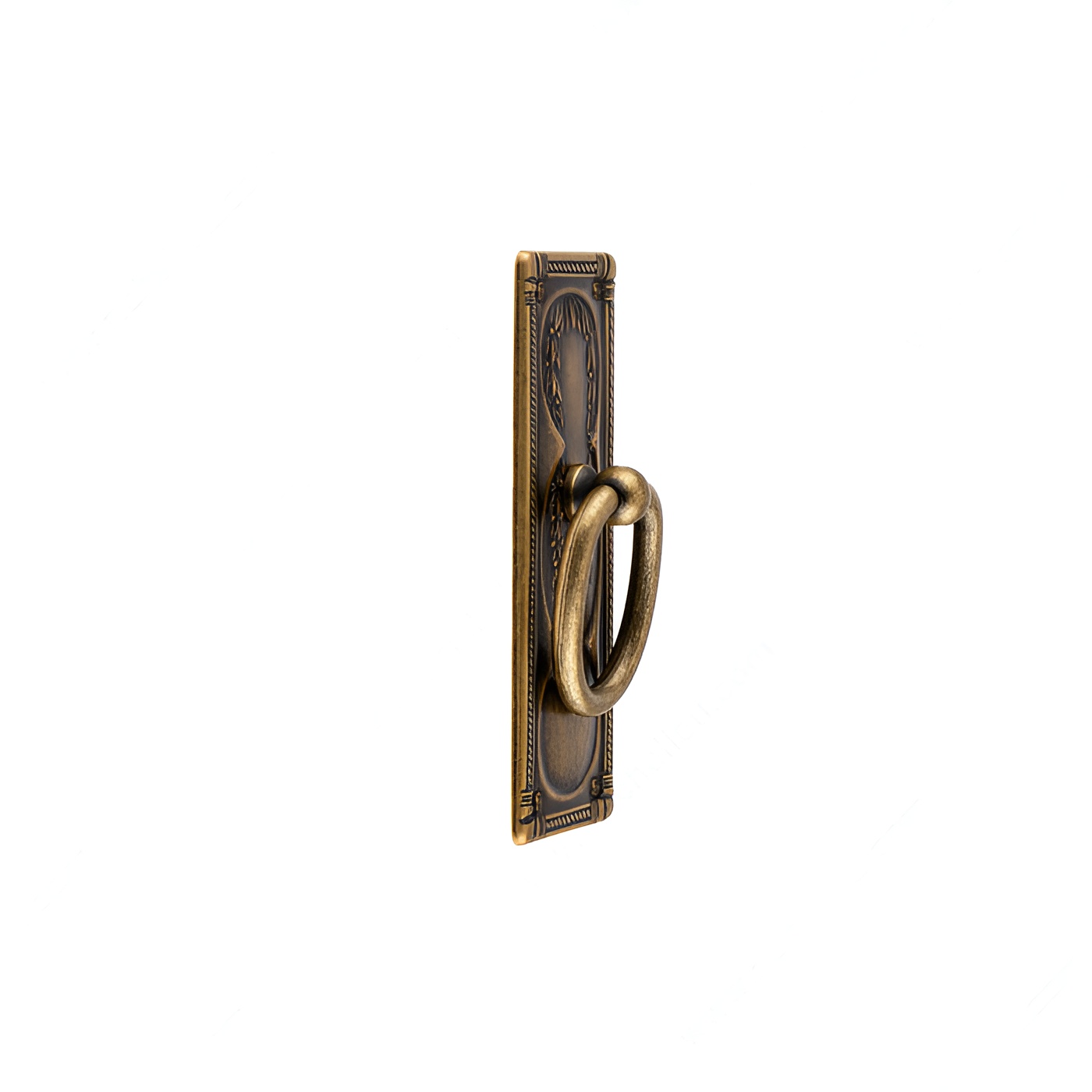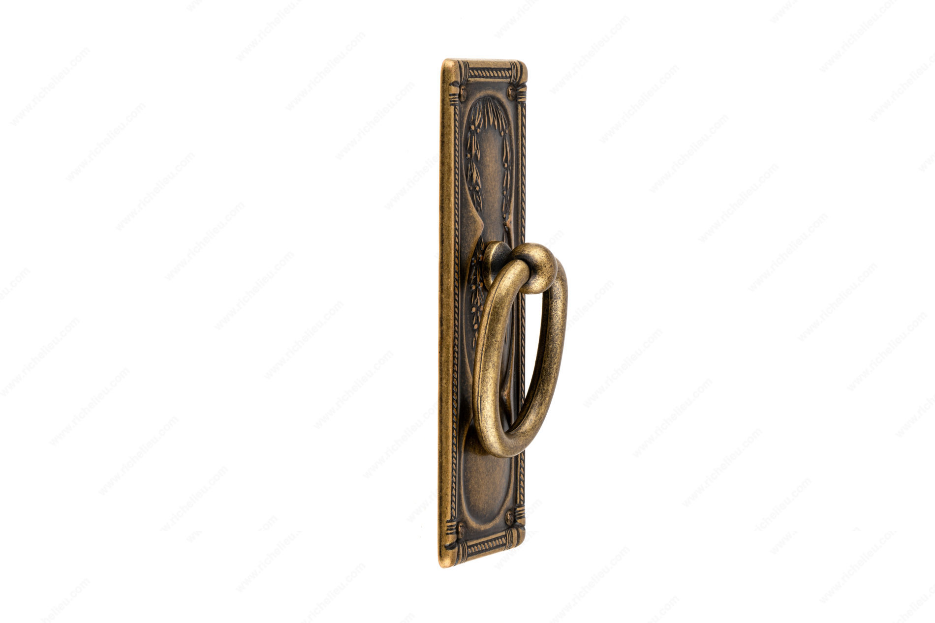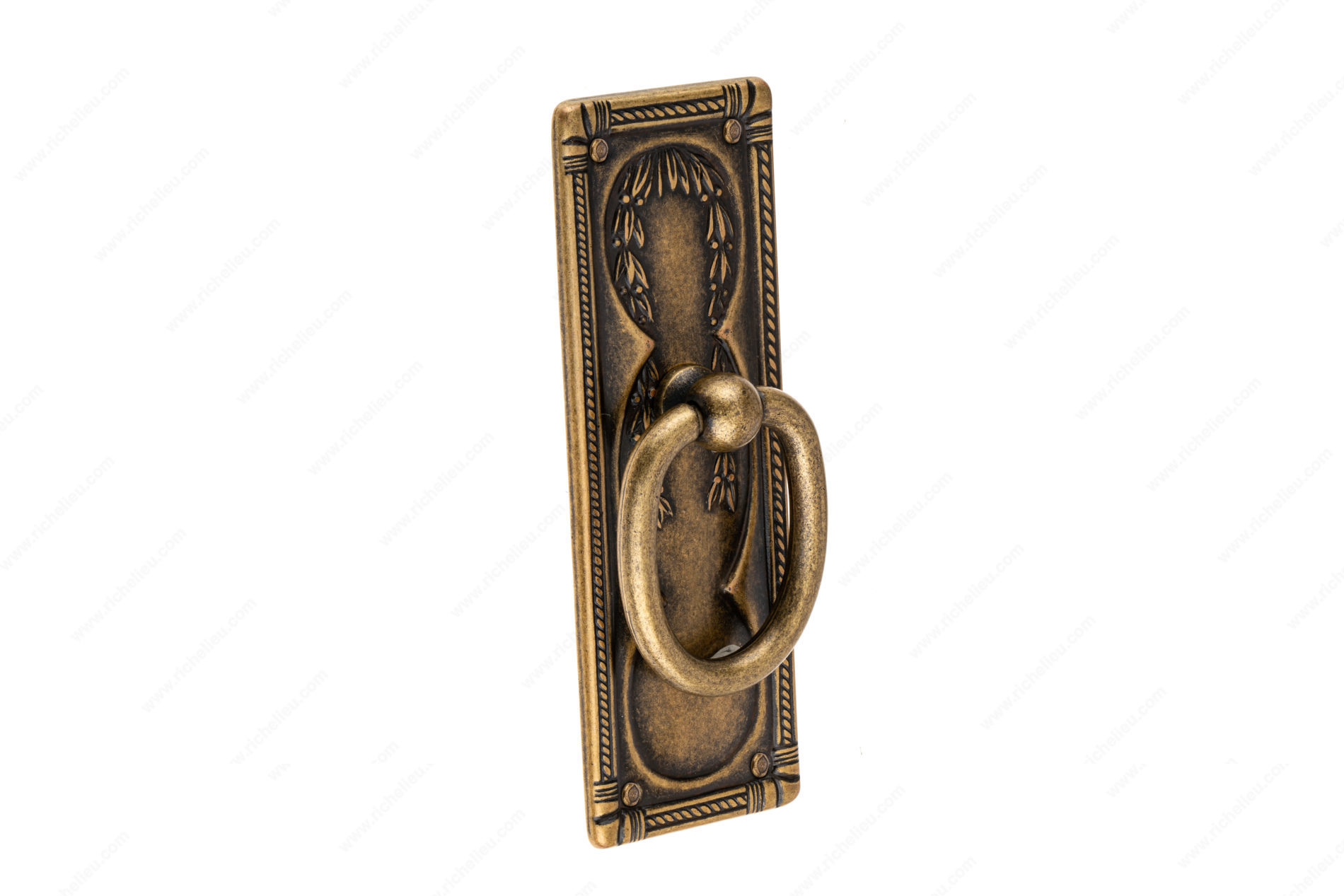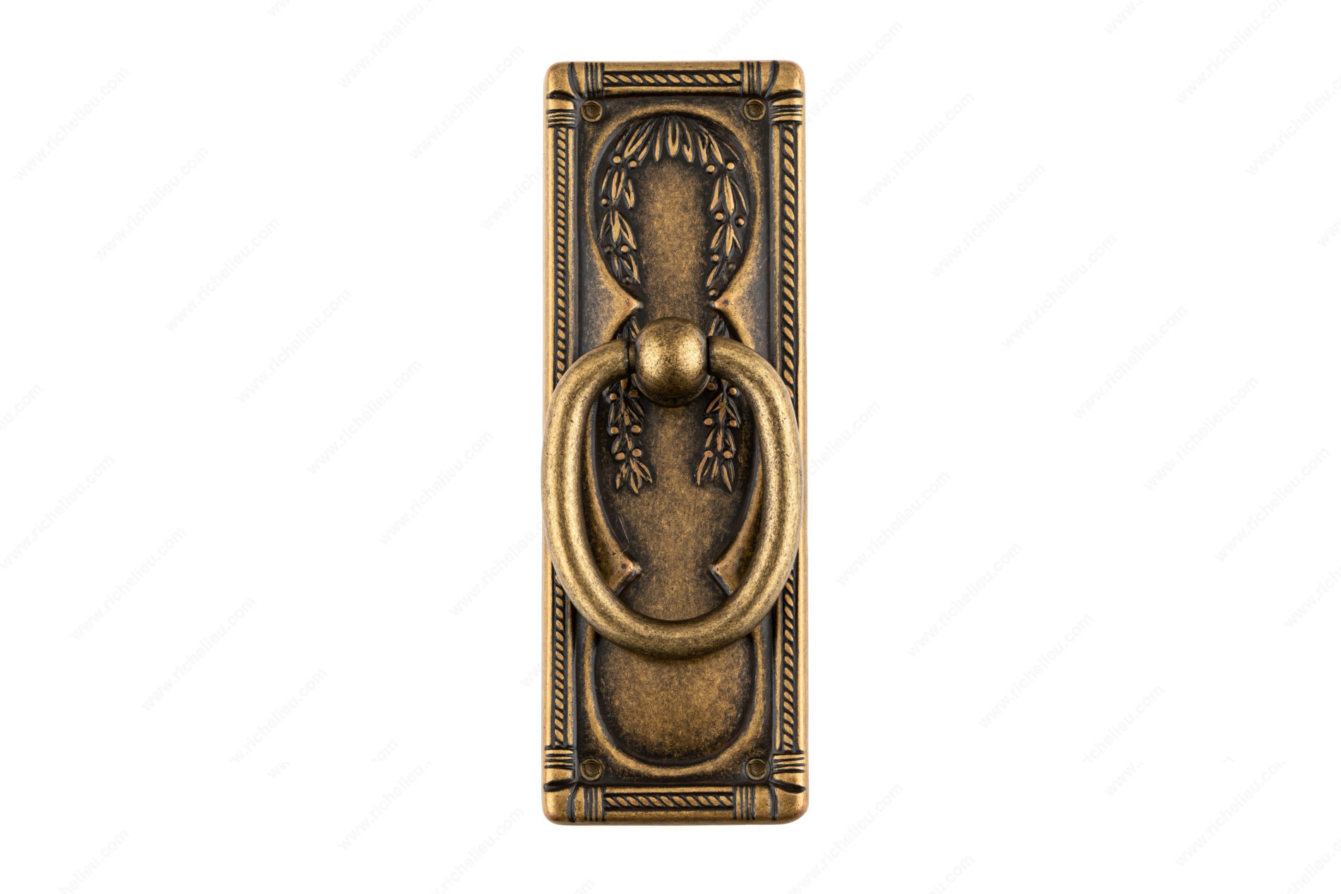 Richelieu 12233167 Traditional Brass Pull - 1223 adds a touch of vintage charm to your cabinetry and furniture with its exquisite design. This ring pull features an ornate vertical backplate that beautifully complements traditional styles, making it an ideal choice for those looking to enhance the elegance of their interiors. Crafted from durable brass, this pull showcases a stunning Floral Brass finish, radiating warmth with its yellow and brass color palette. Measuring 3 13/16 inches in length, 1 5/16 inches in width, and a projection of 5/8 inches, it provides a substantial grip while maintaining a refined appearance. The pull's design is part of the Art Deco collection, embodying a classic aesthetic that seamlessly integrates with various decor styles. Included with the pull are M4 screws and cigar box nails, ensuring a hassle-free installation. The Traditional style of this pendant and ring pull enhances both functionality and style, making it a versatile addition to any renovation or furniture project. Richelieu’s commitment to quality craftsmanship shines through in this product, making it a perfect choice for builders, designers, and homeowners aiming to elevate their spaces with timeless hardware.