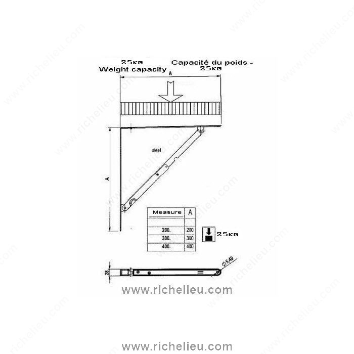 Richelieu 13151690 Folding Support offers a practical and efficient solution for maximizing space in any environment. Crafted from durable steel, this folding shelf support is designed to withstand a maximum load capacity of 55.1 lbs per shelf, making it ideal for a variety of applications, from kitchen cabinets to garage storage. With overall dimensions of 16 1/4 inches in height, 16 1/2 inches in projection, and a width of 1 3/32 inches, this support is compact yet robust. It accommodates shelves with a thickness ranging from 5/8 to 3/4 inches, ensuring versatility in your shelving solutions. The sleek black finish adds a modern touch, seamlessly blending with any décor. One of the standout features of the Richelieu Folding Support is its visible, anti-tip design, providing peace of mind whether you're storing heavy items or simply showcasing decorative pieces. Additionally, it ships conveniently via UPS, ensuring a hassle-free delivery experience. Enhance your space with the Richelieu 13151690 Folding Support, a reliable choice for those who prioritize both functionality and aesthetics in their shelving solutions. Whether you're a building professional or a discerning homeowner, this product promises quality and performance you can trust.