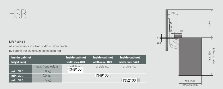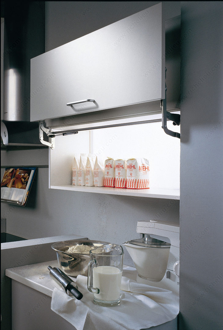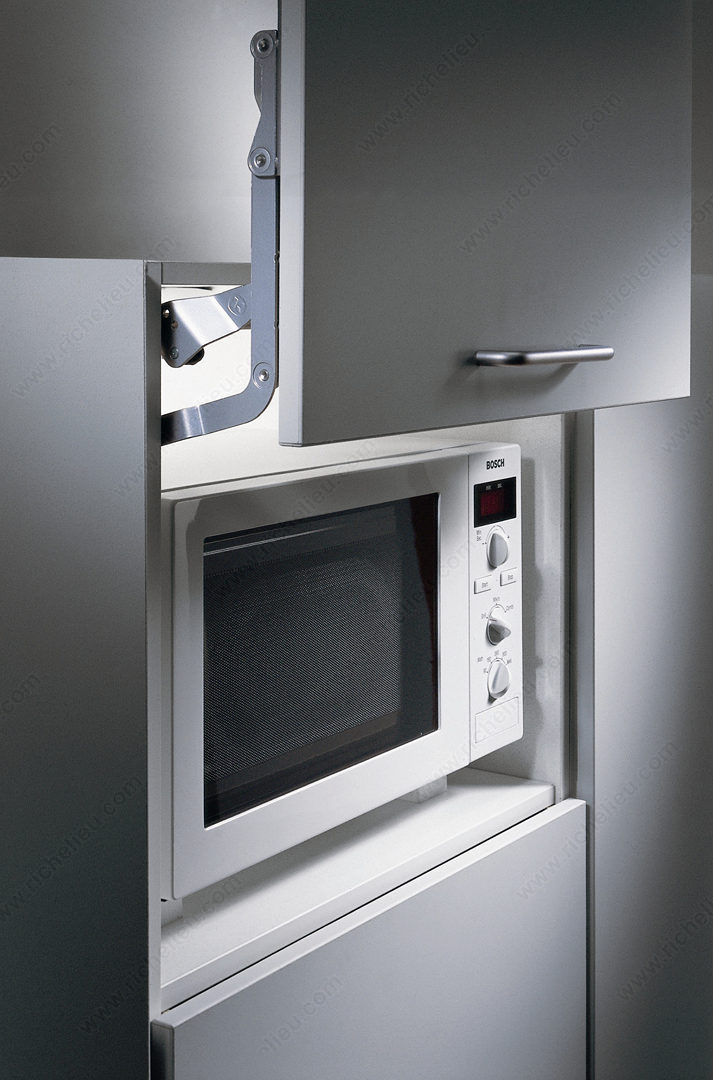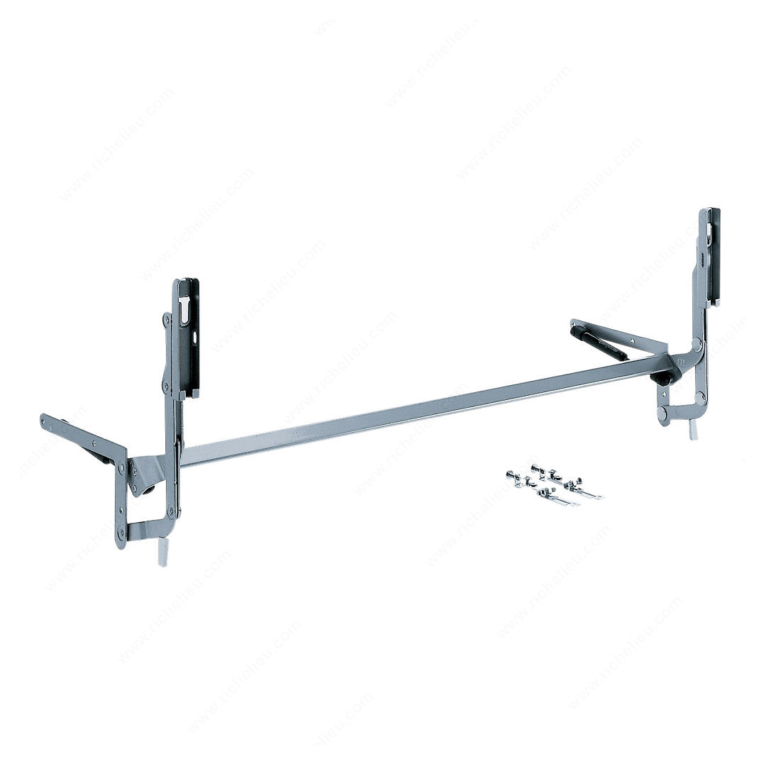 Richelieu 1349100 SO-TECH Lift System offers a seamless solution for upper cabinet doors, enhancing both functionality and aesthetics. Designed with convenience in mind, this system features door fixing brackets that mount separately, making installation straightforward and efficient. The three-dimensional door adjustment capability ensures a precise fit, accommodating any adjustments required for optimal performance. This lift system is equipped with a compressed spring and stop control, providing smooth operation while securely holding the door in place. Ideal for wood doors with a height of 13 7/8 inches and a weight capacity of 15.4 pounds, the SO-TECH Lift System is available in three versions, allowing you to select the model that best matches your specific door width and weight. Crafted from durable metal with a sleek light gray finish, this system integrates effortlessly into various kitchen designs. The aluminum connector bar is also customizable, easily cut to the required size for a perfect fit. Note that screws and nails are not included with the system, allowing for flexibility in installation. Elevate your cabinetry with the Richelieu SO-TECH Lift System, where functionality meets modern design.