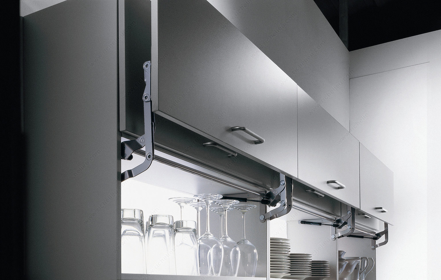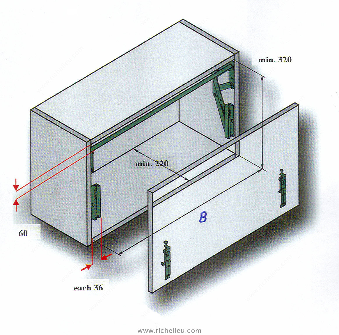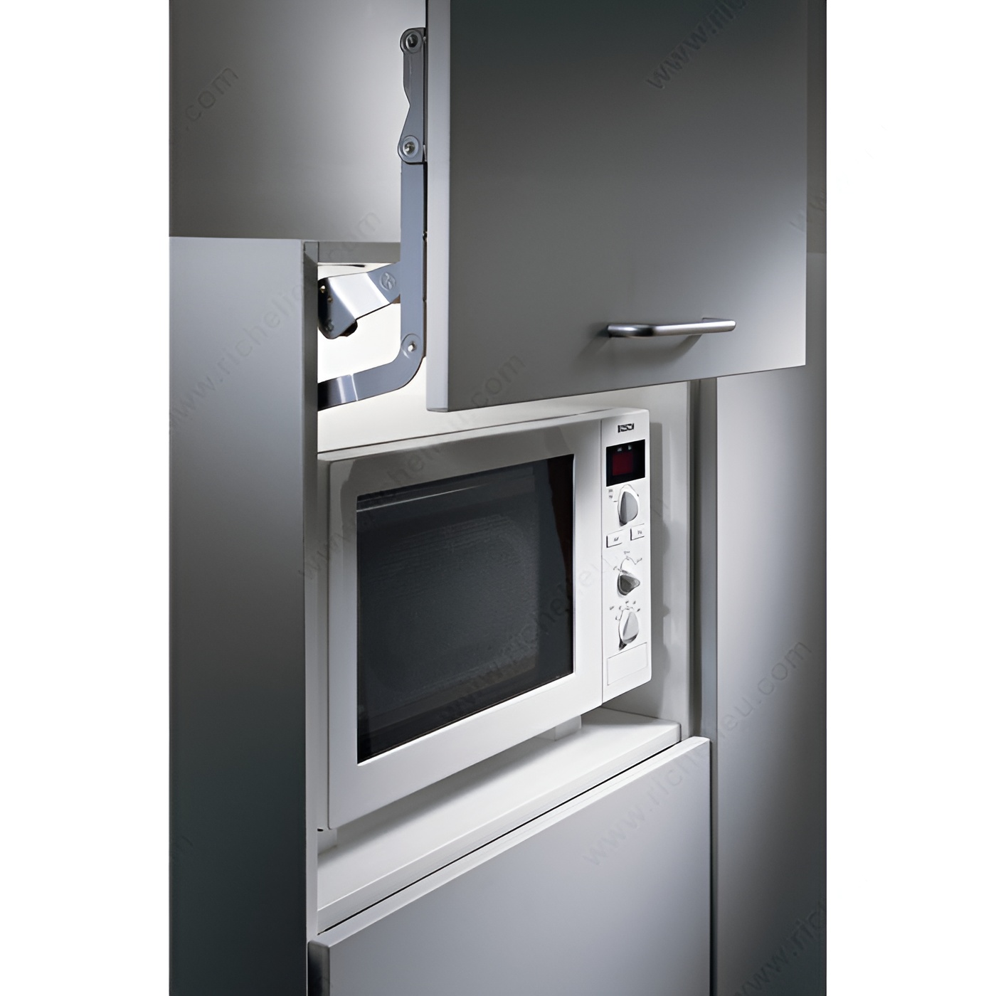 Richelieu 1349100 SO-TECH Lift System offers a seamless solution for upper cabinet doors, enhancing both functionality and aesthetics. Designed with convenience in mind, this system features door fixing brackets that mount separately, making installation straightforward and efficient. The three-dimensional door adjustment capability ensures a precise fit, accommodating any adjustments required for optimal performance. This lift system is equipped with a compressed spring and stop control, providing smooth operation while securely holding the door in place. Ideal for wood doors with a height of 13 7/8 inches and a weight capacity of 15.4 pounds, the SO-TECH Lift System is available in three versions, allowing you to select the model that best matches your specific door width and weight. Crafted from durable metal with a sleek light gray finish, this system integrates effortlessly into various kitchen designs. The aluminum connector bar is also customizable, easily cut to the required size for a perfect fit. Note that screws and nails are not included with the system, allowing for flexibility in installation. Elevate your cabinetry with the Richelieu SO-TECH Lift System, where functionality meets modern design.