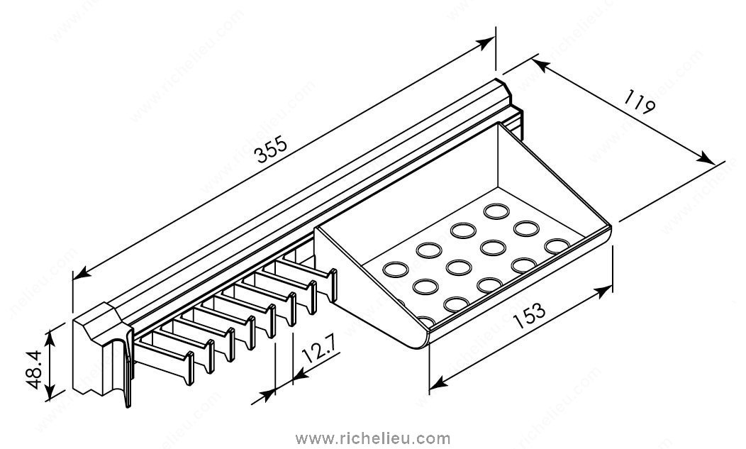 Richelieu 1408210 Tie Rack and Multi-Use Tray offers a stylish and functional solution for organizing your accessories. This full extension pull-out tie rack is expertly crafted from aluminum, ensuring durability and a sleek appearance. The integrated spacious tray is perfect for stowing away loose items such as your wallet, change, watch, and jewelry, keeping your space tidy and clutter-free. Designed for practicality, this tie rack features eight hooks, allowing you to neatly hang your ties while maintaining easy access. The product's dimensions are thoughtfully designed, with a depth of 14 inches, a height of 1 29/32 inches, and a width of 4 11/16 inches, making it an ideal fit for various interior applications. The contemporary black finish adds a modern touch to your organizational needs. The Richelieu 1408210 is part of the Orlando collection, which emphasizes both functionality and style. It is made from a combination of metal and plastic, ensuring a robust yet lightweight solution for your storage needs. With the convenience of shipping via UPS, this product is an excellent choice for building professionals and discerning homeowners looking to enhance their organizational systems.