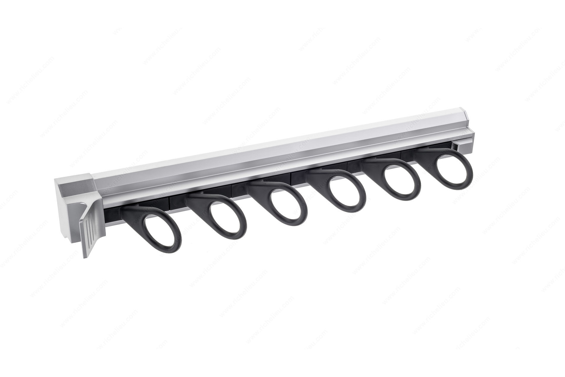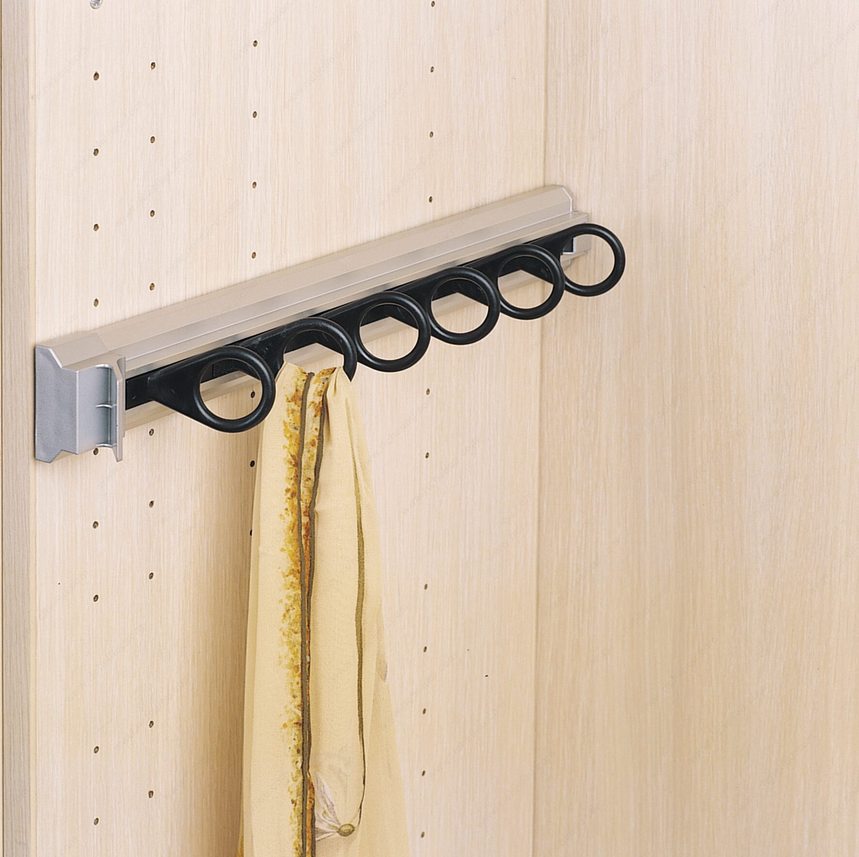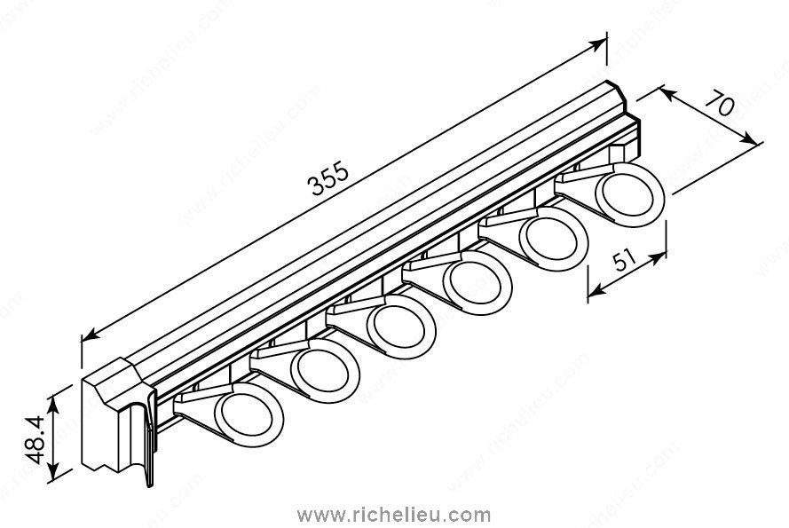 Richelieu 1408510 Scarf Rack is the ideal solution for organizing your scarves while maintaining a sleek and tidy closet space. This pull-out rack features six round hooks designed to securely hold scarves of various sizes, ensuring they remain neatly in place and easily accessible. With a convenient front handle, you can effortlessly pull out the rack to grab your favorite accessory without hassle. Constructed from durable aluminum, the scarf rack combines strength with a modern aesthetic, making it a versatile addition to any closet. Its compact dimensions of 14 inches in depth, 2 inches in height, and 2.5 inches in width allow for easy installation in tight spaces, making it practical for any wardrobe setup. The rack can be easily mounted with just two screws, simplifying the installation process. Part of the Orlando collection, the Richelieu 1408510 Scarf Rack not only enhances organization but also adds a touch of style to your closet. Whether you're a building professional or a discerning homeowner, this scarf support is a must-have for achieving a clean and efficient storage solution. Enjoy the convenience of a well-organized space with this exceptional product from Richelieu, designed for effortless functionality and lasting quality.