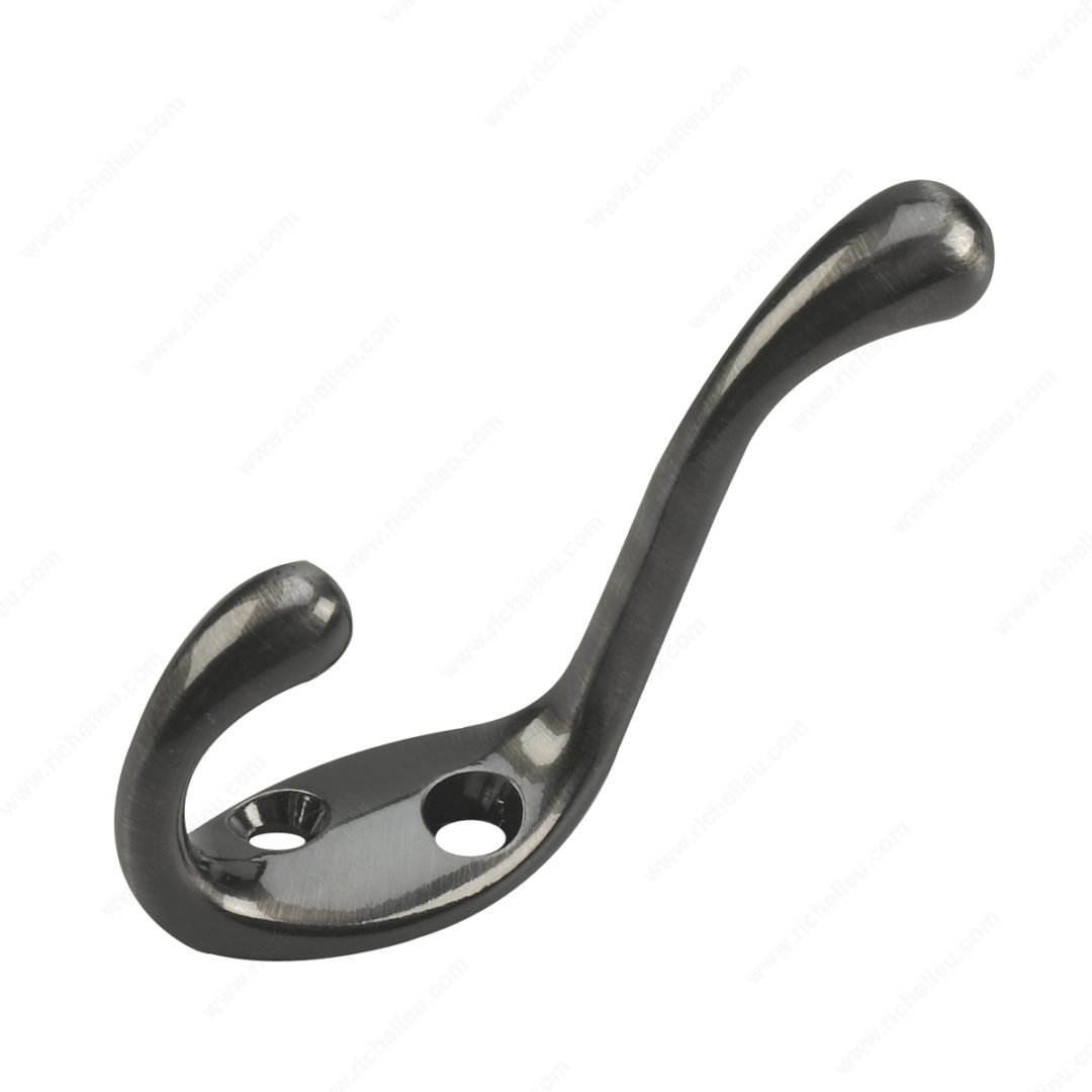 Richelieu 235ANV 3-1/2 in Heavy Duty Coat Hook combines style and functionality to elevate your space. Finished in an elegant Antique Nickel, this coat hook features a dual arm design that effectively doubles your storage potential, making it an excellent choice for maximizing space in any room. With a load capacity of 22 pounds, it is robust enough to handle a variety of items, from coats to bags. Measuring 3 3/8 inches in height and projecting 2 5/16 inches from the wall, the hook's compact size allows for versatile installation on walls or doors, making it an ideal addition to entryways, mudrooms, closets, bedrooms, or bathrooms. The utility-style, simple two-arm hook is designed with round ends for a polished look that complements various decor styles. Installation is straightforward, with screws included for your convenience. The center-to-center measurement of 5/8 inch ensures a secure fit, while the overall width of 25/32 inch makes it a subtle yet effective storage solution. Whether you need a place to hang jackets or organize accessories, the Richelieu Heavy Duty Coat Hook is a durable and stylish choice that meets your needs.