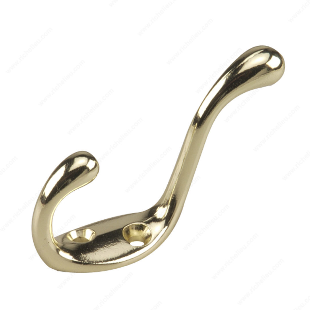 Richelieu 235BV 3-1/2 in Heavy Duty Coat Hook offers a stylish and functional solution for your storage needs. Crafted from durable metal, this coat hook is designed to withstand daily use, boasting a load capacity of 22 lbs. Its dual arm design effectively doubles your storage potential, making it a perfect space-saving addition to any environment. Featuring a sleek brass finish, the hook not only provides utility but also adds an elegant touch to bedrooms, bathrooms, entryways, mudrooms, closets, and more. The overall dimensions of 3 3/8 inches in height, 2 5/16 inches in projection, and 25/32 inches in width make it an unobtrusive yet practical choice. Installation is straightforward, as the hook can be mounted on walls or doors, and all necessary screws are included for your convenience. The center-to-center measurement of 5/8 inch ensures compatibility with standard installations. With its simple yet effective design and eye-catching yellow and brass color, the Richelieu 235BV Heavy Duty Coat Hook is not just a functional accessory but a stylish enhancement to your living space. Whether you need it for hanging coats or other accessories, this hook is sure to meet your expectations.