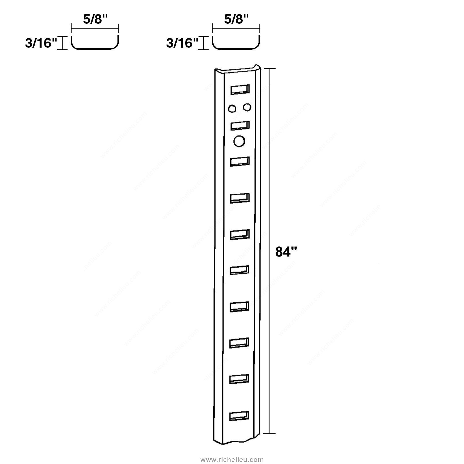 Richelieu 2551084 5/8" U-Shaped Aluminum Pilaster offers a versatile solution for your shelving needs, seamlessly integrating with both walls and cabinetry. Designed for easy installation, this pilaster can be mounted on the surface or recessed with a dado cut, providing flexibility in design. Whether you opt for nails, 1/4" narrow crown staples, or #4 flat head screws, the mounting process remains straightforward, making it an ideal choice for both professionals and skilled DIYers. Crafted from durable aluminum, this pilaster boasts an unfinished surface that can be customized to suit various décor styles. With a length of 84 inches and a 5/8 inch width, it is designed to support pilaster shelf clips effectively. The 17-gauge construction ensures robust strength, while the 3/16 inch projection and 1/2 inch slot adjustment allow for precise shelf positioning. Richelieu's commitment to quality is evident in this product, which meets ANSI/BHMA A156.9-2003 standards and certifications. Enhance your shelving system with the reliability and adaptability of the Richelieu 2551084 U-Shaped Aluminum Pilaster, a product that combines functionality with professional-grade performance.