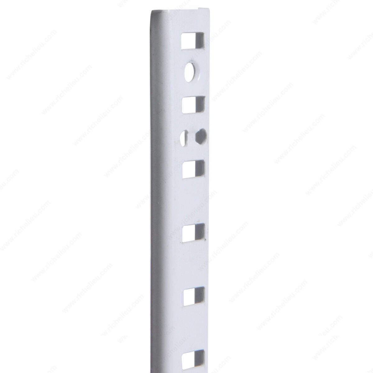 Richelieu 2553072 U-Shaped Steel Pilaster offers a versatile solution for both surface and recessed mounting applications. This U-shaped pilaster is designed to be installed easily, either directly on the surface or flush with walls or cabinets by making a dado cut, providing a seamless and professional finish. Constructed from high-quality 23-gauge steel, this durable pilaster measures 72 inches in length with a projection of just 3/16 inches, making it an ideal choice for various installation needs. The white finish complements a wide range of environments, ensuring it blends effortlessly into your design scheme. Installation is straightforward and flexible, as it can be mounted using nails, 1/4 inch narrow crown staples, or #4 flat head screws. Notably, the adjustment holes are spaced in 1/2 inch increments, allowing for precise positioning to accommodate your specific requirements. Whether you're a building professional or a knowledgeable homeowner, the Richelieu 2553072 U-Shaped Steel Pilaster is an essential component for enhancing the structural integrity and aesthetic appeal of your space. With its quality construction and user-friendly installation options, this pilaster is a reliable choice for any project.
