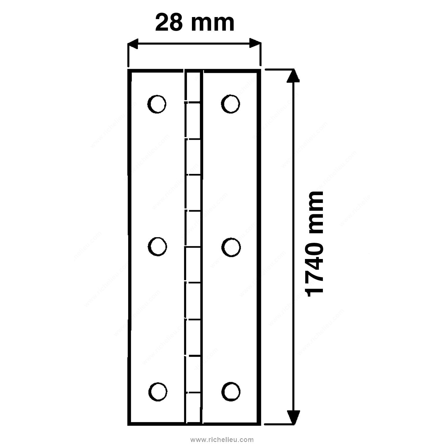 Richelieu 281740180 Piano Hinges - 1-1/8" in Width are engineered for durability and seamless functionality, making them an ideal choice for a variety of applications. Crafted from high-quality steel, these hinges boast a robust construction that ensures long-lasting performance. With a substantial length of 68 1/2 inches, they provide excellent support for larger doors and panels, making installation straightforward and efficient. The nickel finish adds a modern touch, enhancing the aesthetic appeal of your projects while also offering resistance to corrosion. Designed with #5 screw fasteners, these hinges are easy to install and provide a secure fit, ensuring reliability in everyday use. The thickness of 0.0276 inches contributes to their sturdiness, making them suitable for heavy-duty tasks. Richelieu's piano hinges come with pre-drilled holes, allowing for quick and hassle-free installation. Their versatility makes them a practical choice for both professional builders and knowledgeable homeowners looking to enhance the functionality of their spaces. Whether you’re working on cabinetry, doors, or specialized projects, these hinges deliver the strength and style you need. Trust Richelieu for reliable hardware solutions that stand the test of time.