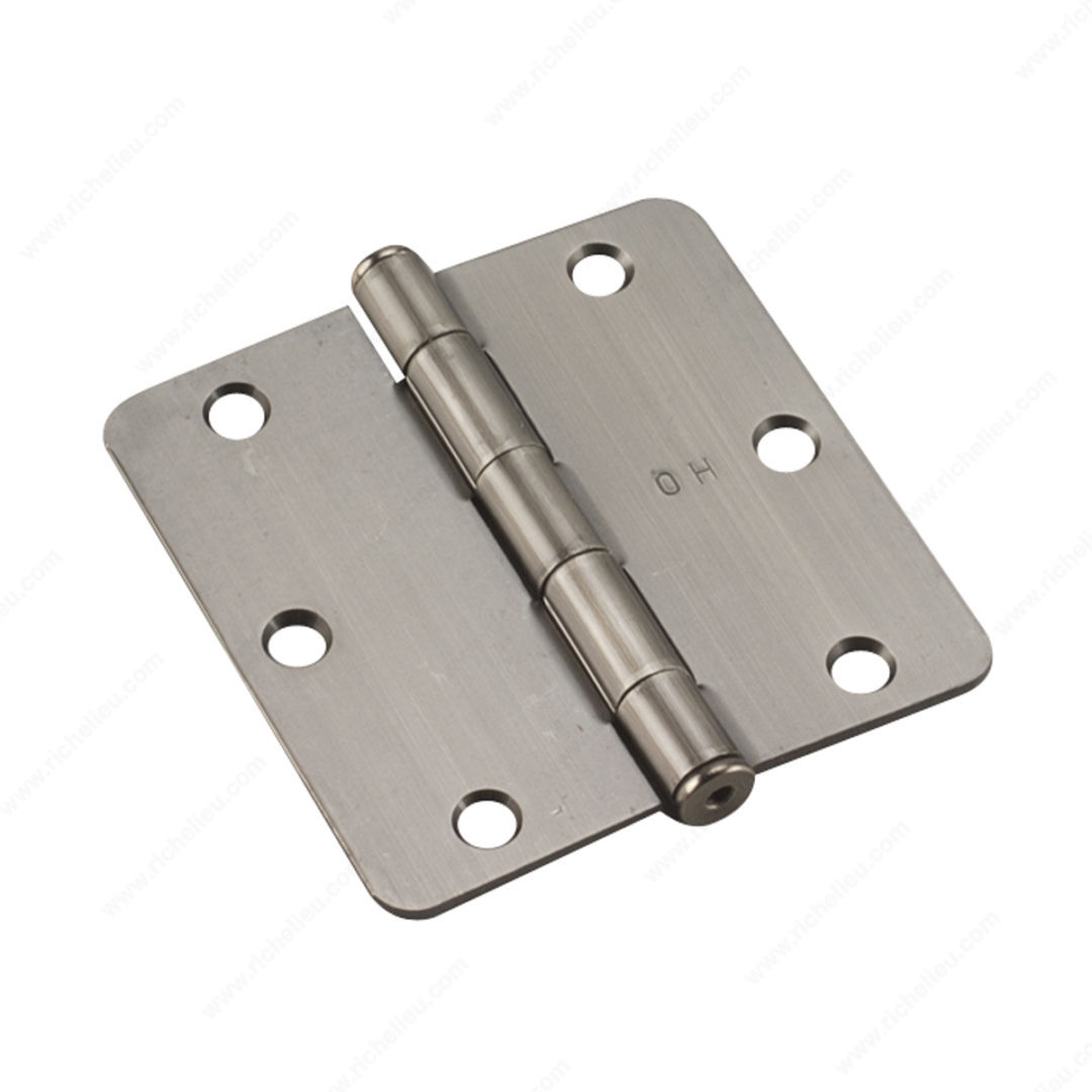 Richelieu 2821ANB 3-1/2" Full Mortise Butt Hinge - 1/4" Radius is a versatile and stylish addition to any home, designed to enhance your projects with a polished and sleek finish. Made from durable steel, this hinge is built to last and supports a load capacity of up to 45 pounds when using three hinges, making it ideal for standard doors. Measuring 3-1/2 inches in height and width, this full mortise hinge features a 1/4" radius corner, ensuring a seamless fit for various door styles. The antique nickel finish not only brings a touch of elegance but also complements a wide range of design aesthetics. The removable pin allows for easy maintenance and installation, while the included screws ensure a hassle-free setup. Packaged in a box of two, the Richelieu 2821ANB hinge is perfect for both building professionals and knowledgeable homeowners looking for reliable hardware. With its combination of functionality and style, this hinge is a must-have for any renovation or construction project. Elevate your doors with this essential component that promises both durability and an appealing look.