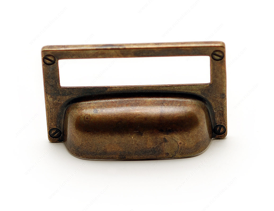 Richelieu 33332163 Traditional Metal Pull - 3333 offers a nostalgic touch to your cabinetry with its elegant cup pull design. This functional piece features faux screw embellishments, enhancing its traditional aesthetic, while the side slot allows for easy labeling, making it perfect for organizing drawer contents efficiently. Crafted from durable metal, this pull is built to withstand daily use, ensuring longevity in both residential and commercial applications. With a center-to-center measurement of 1 1/4 inches, it fits seamlessly into various drawer styles. The oxidized brass finish adds a warm, vintage appeal, paired beautifully with its yellow and brass color scheme. Overall dimensions measure 3 5/32 inches in length, 2 1/16 inches in width, and a projection of 3/4 inches, making it a versatile choice for drawers of all sizes. Installation is made simple with the included M4 screws, allowing for a quick and hassle-free setup. Part of the Povera collection, the Richelieu 33332163 combines style and functionality, making it an ideal choice for those seeking to enhance their space with a refined, traditional element. Experience the perfect blend of utility and charm with this exquisite cup pull.