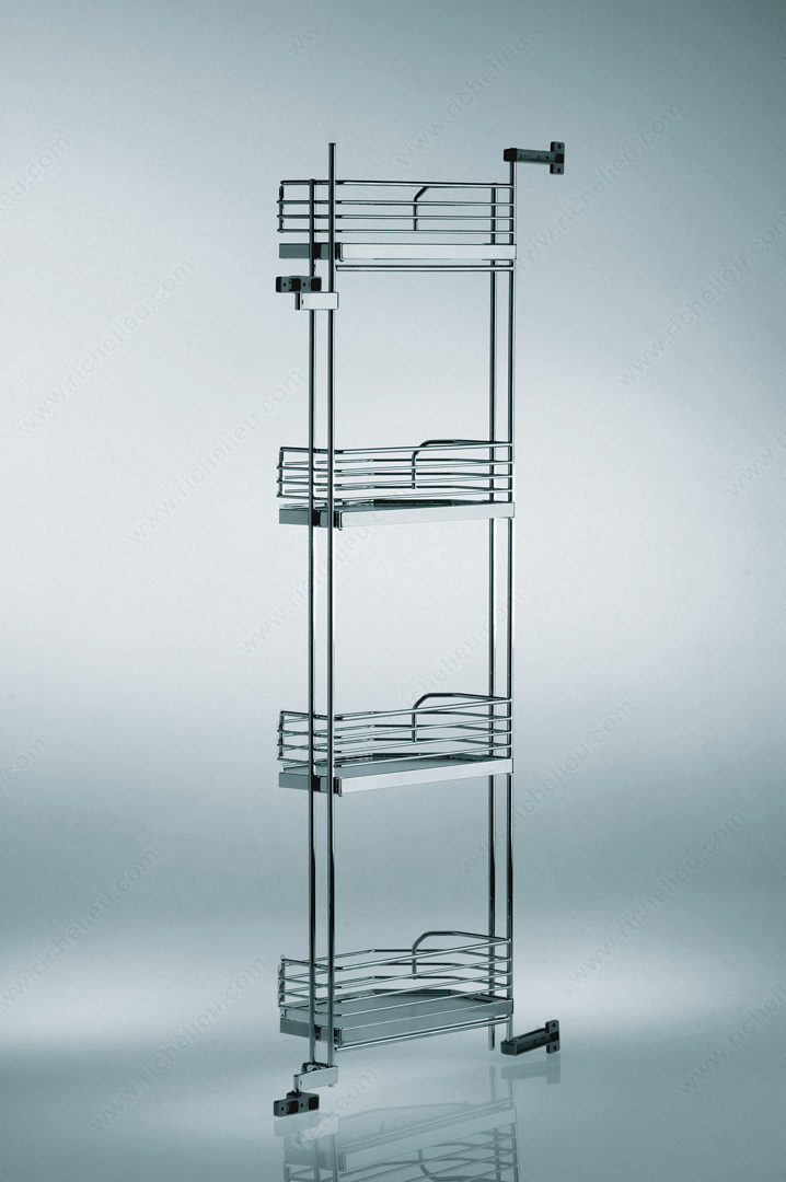 Richelieu 3441140100 Arena Door Baskets for Tandem Depot System provide an innovative storage solution designed for modern kitchens and pantry cabinets. This set includes four expertly crafted metal baskets featuring a non-slip melamine surface, ensuring items remain securely in place during use. The sleek gray and chrome finish not only enhances the aesthetic appeal but also contributes to the durability and functionality of the product. Designed for easy integration into Tandem Depot systems, these baskets require a minimum interior height of 43 1/4 in, a width of 22 1/8 in, and a depth of 19 5/8 in, making them suitable for various storage needs. Each basket has an overall depth of 7 3/32 in and a height of 42 1/8 in, providing ample space for organizing food items and other essentials efficiently. Ideal for food storage and pantry organization, the Arena door baskets help streamline your kitchen's workflow while maximizing available space. Their robust design is perfect for wall units and pantry cabinets, allowing you to maintain a clutter-free environment. With the convenience of UPS shipping, upgrading your storage solution has never been easier. Experience the blend of functionality and style with Richelieu’s Arena Door Baskets.
