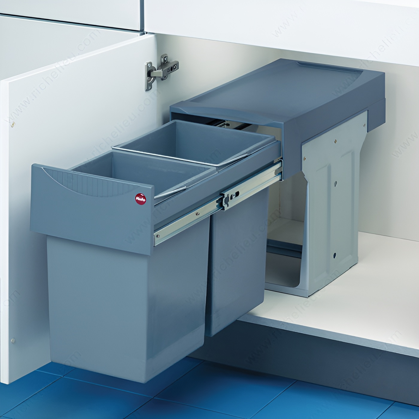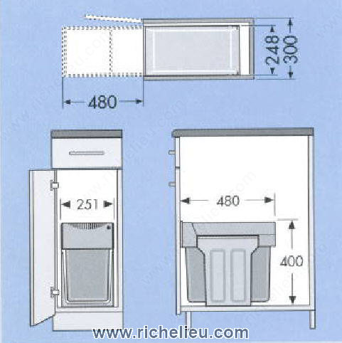 Richelieu 3666100 Heavy-Duty Pull-Out Waste Bin offers a practical and efficient solution for managing waste in your kitchen or workspace. Designed to fit seamlessly into base and under-sink cabinets, this bin features a dual compartment system with a combined capacity of 31.7 quarts, allowing for easy separation of waste and recyclables. Each bin holds 15.8 quarts (15 L), ensuring ample space for your disposal needs. Constructed from durable metal and plastic, this waste bin is built to withstand daily use while maintaining its sleek gray finish. The dimensions of the unit are 19 1/8 in depth, 16 in height, and 9 7/8 in width, requiring a minimum cabinet interior of 19 1/8 in depth, 16 1/8 in height, and 10 7/8 in width for proper installation. Ideal for cleaning and preparation areas, the Richelieu pull-out waste bin promotes a tidy environment by keeping waste out of sight and easily accessible. Its heavy-duty design ensures reliable performance, making it a perfect addition to any kitchen or utility space. Simplify your waste management with this functional and stylish solution from Richelieu, where quality meets innovative design.