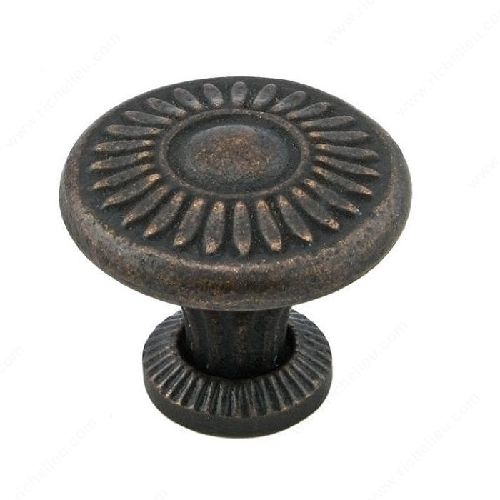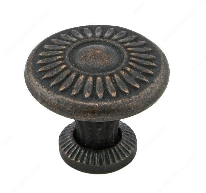 Richelieu 388838FB Traditional Cast Iron Knob - 3888 offers a timeless touch to your cabinetry and furniture with its beautifully engraved sunflower design. Crafted from sturdy cast iron, this knob not only exudes elegance but also promises durability, making it an ideal choice for traditional styling. The knob features a removable backplate, allowing for easy installation and maintenance. Measuring 1 1/2 inches in diameter and projecting 1 1/4 inches, the knob fits comfortably in hand, offering a solid grip for effortless use. Its Florentine Bronze finish enhances its vintage appeal, making it a perfect complement to classic interiors. This knob is part of the Empire collection, ensuring a cohesive look when paired with other items from the same line. Included with the knob is an M4 screw for straightforward installation, allowing you to quickly enhance the aesthetics of your space. The warm brown and bronze tones of the Richelieu 388838FB provide versatility, seamlessly integrating with various color palettes and styles. Elevate your home’s character with this exquisite traditional knob, combining functionality with a touch of sophistication.