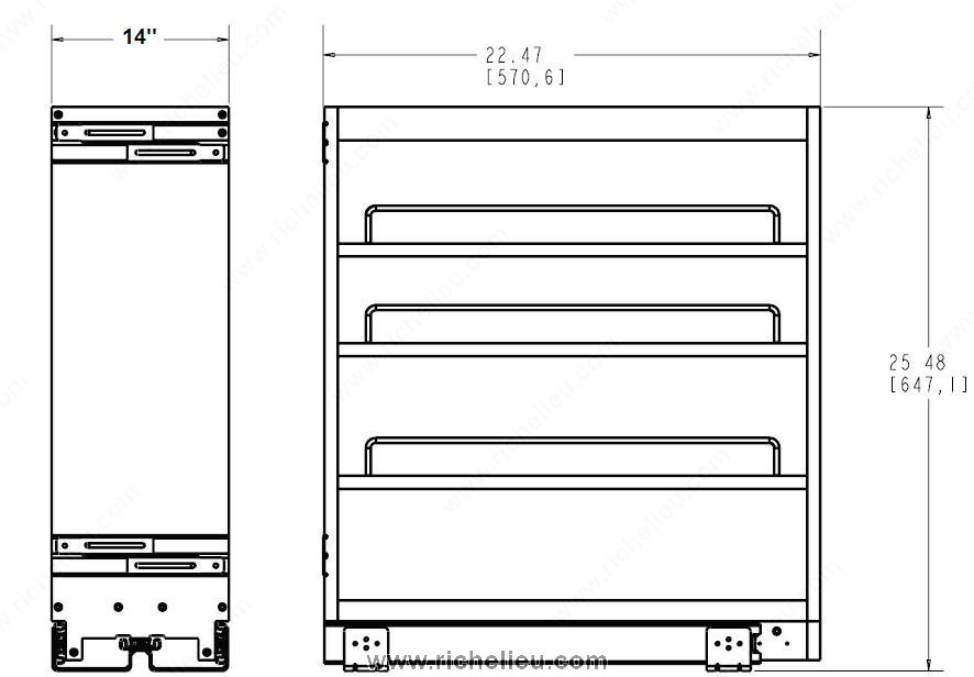 Richelieu 448BC14C Rev-A-Shelf pull-out organizer for base cabinets offers a seamless blend of functionality and style, making it an essential addition to any kitchen. Crafted from durable birch/maple wood and finished with a clear UV coating, this organizer complements various kitchen décors while enhancing the overall aesthetic. The chrome-plated rails not only add a polished look but also ensure a smooth sliding experience. Designed for maximum stability, the organizer features full-extension triple slides that minimize side-to-side motion, allowing you to effortlessly access your stored items. With a high load rating of up to 100 lbs, it efficiently utilizes your cabinet space, while adjustable shelves provide customizable storage for all your kitchen essentials. Measuring 14 inches in width, 22 7/16 inches in depth, and 25 7/16 inches in height, this pull-out organizer requires a minimum cabinet opening height of 25 5/8 inches and a frame width of 14 1/2 inches. Ideal for food storage and preparation, the Richelieu 448BC14C is designed for mounting on sliding doors, making it a versatile solution for base cabinets. Experience enhanced organization and style in your kitchen with this exceptional product.