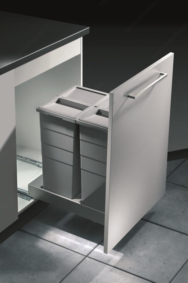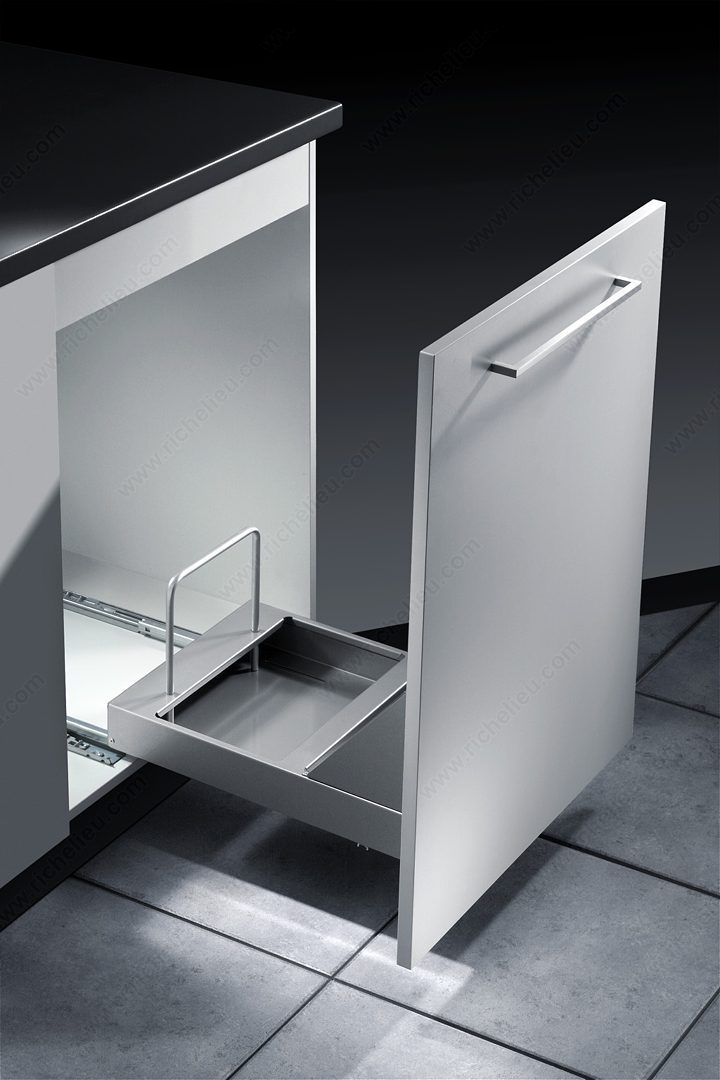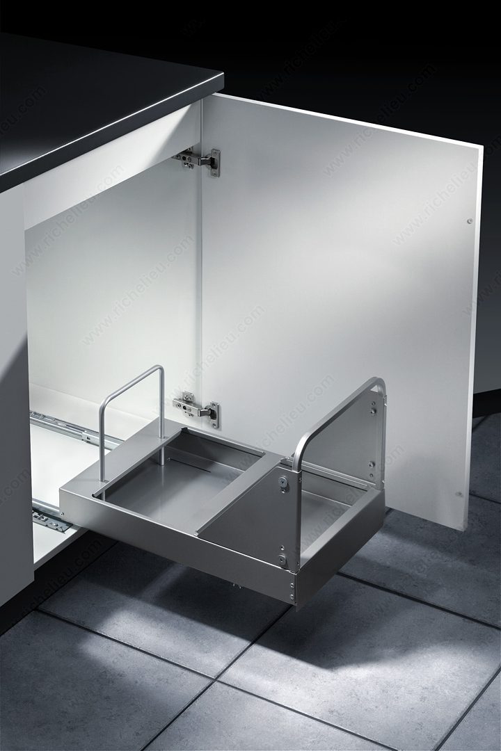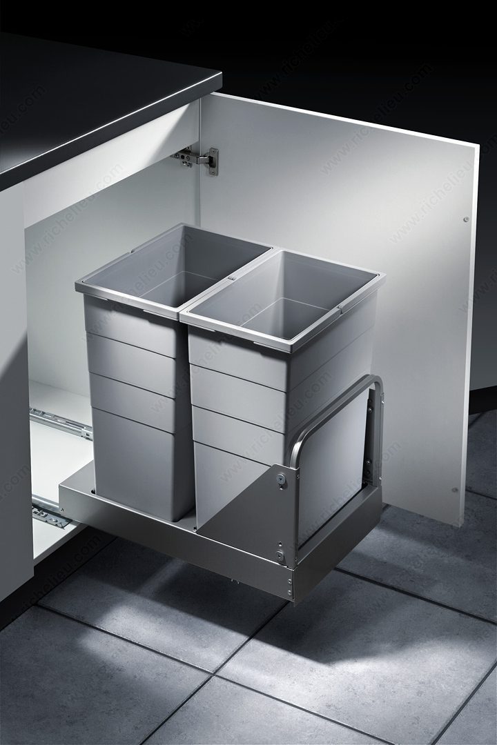 Richelieu 461640100 Bottom-Mounted Recycling Center offers a practical and efficient solution for waste management in your kitchen. Designed for easy installation, this recycling center is compatible with both hinged doors and door-mounting applications, making it versatile for various cabinet setups. With a high-volume capacity of 2 x 29 liters (2 x 31 quarts), it provides ample space for separating recyclables, ensuring your home stays organized and eco-friendly. The system features a user-friendly design, complete with an integrated handle on the frame that allows for effortless opening. Each bin is equipped with ergonomic handles, making it simple to lift and transport. Additionally, the tight-fitting lids play a crucial role in deterring odors, keeping your kitchen fresh. Constructed with a sleek gray finish, the recycling center blends seamlessly into your cabinetry. It requires minimum interior dimensions of 20 7/8 inches in depth, 20 3/4 inches in height, and a width between 14 1/4 to 22 3/8 inches, ensuring it fits comfortably in your designated space. The included soft-motion system enhances usability, providing a smooth operation every time. Choose the Richelieu 461640100 for a clutter-free and environmentally conscious home.