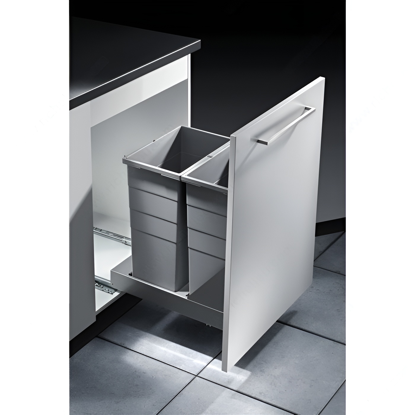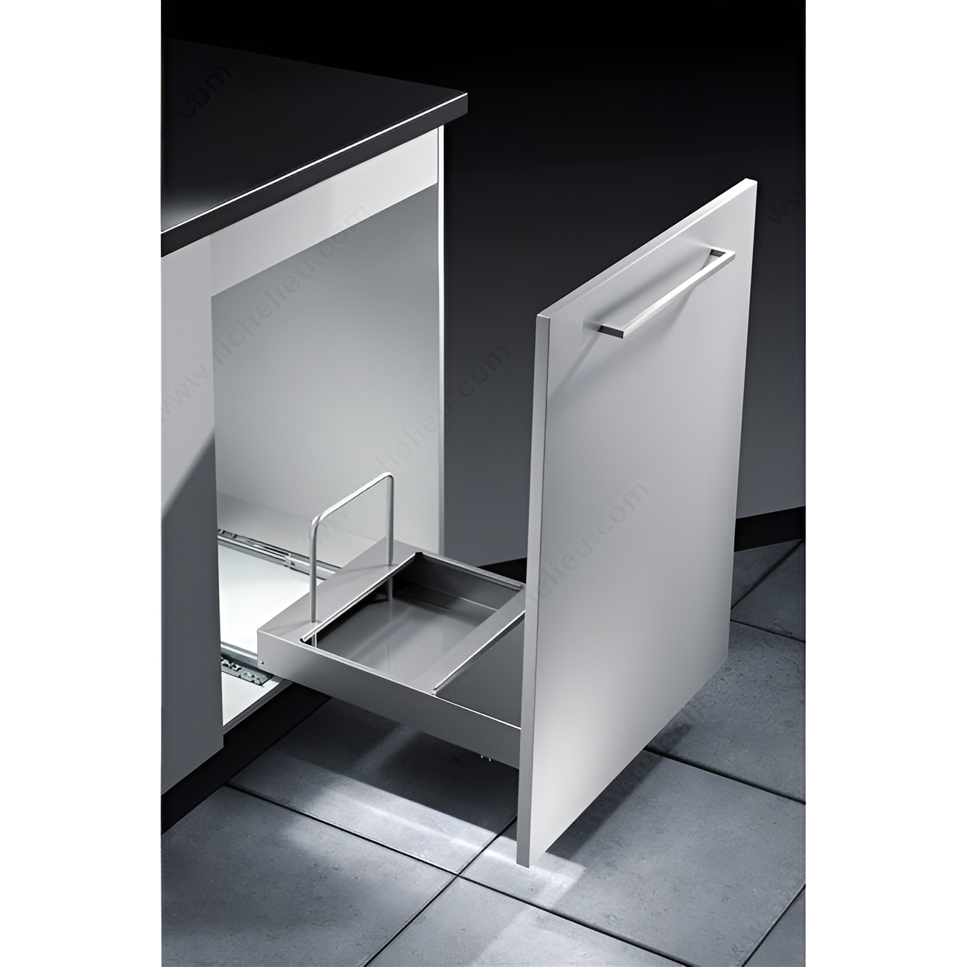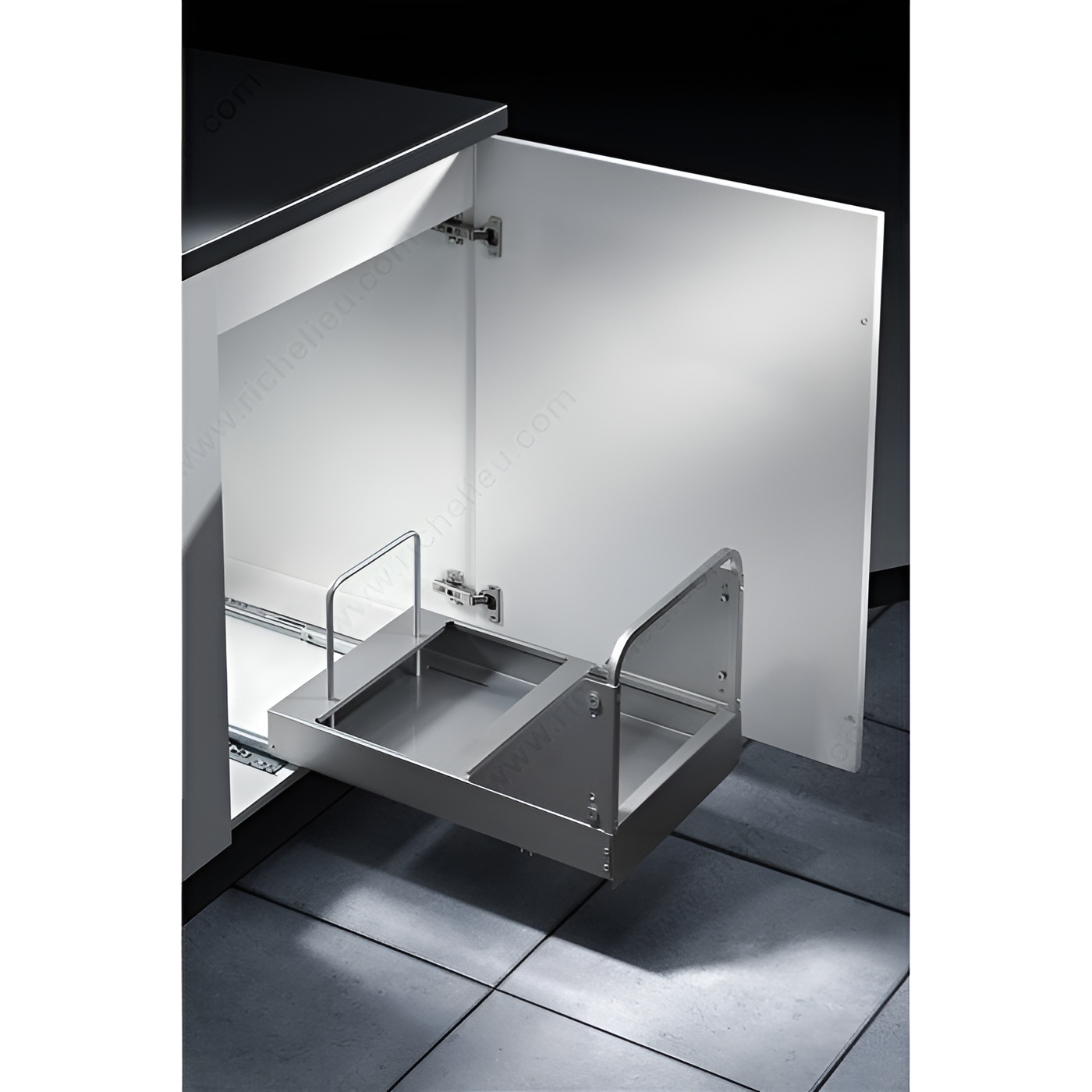 Richelieu 461640100 Bottom-Mounted Recycling Center offers a practical and efficient solution for waste management in your kitchen. Designed for easy installation, this recycling center is compatible with both hinged doors and door-mounting applications, making it versatile for various cabinet setups. With a high-volume capacity of 2 x 29 liters (2 x 31 quarts), it provides ample space for separating recyclables, ensuring your home stays organized and eco-friendly. The system features a user-friendly design, complete with an integrated handle on the frame that allows for effortless opening. Each bin is equipped with ergonomic handles, making it simple to lift and transport. Additionally, the tight-fitting lids play a crucial role in deterring odors, keeping your kitchen fresh. Constructed with a sleek gray finish, the recycling center blends seamlessly into your cabinetry. It requires minimum interior dimensions of 20 7/8 inches in depth, 20 3/4 inches in height, and a width between 14 1/4 to 22 3/8 inches, ensuring it fits comfortably in your designated space. The included soft-motion system enhances usability, providing a smooth operation every time. Choose the Richelieu 461640100 for a clutter-free and environmentally conscious home.