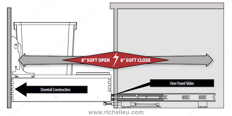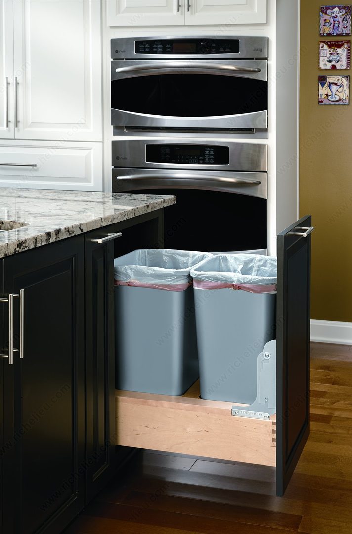 Richelieu 4WCBM2150DM2 Rev-A-Shelf bottom-Mounting Pull-Out Waste Container offers a streamlined solution for managing waste and recycling in your kitchen. Designed with a fully concealed undermount system, this innovative unit maintains a clean and elegant appearance while maximizing functionality. The soft-closing feature, enhanced by a gas spring mechanism, ensures smooth operation even with heavy loads, making it a reliable addition to your cabinetry. This recycling center is equipped with overtravel slides, allowing for effortless insertion and removal of waste containers. With a generous capacity of 100 quarts and the ability to accommodate two bins, it is an efficient choice for any busy kitchen. The unit requires specific interior dimensions of 21 7/8 inches depth, 23 1/2 inches height, and 17 1/2 inches width, ensuring a perfect fit within your cabinetry. Crafted from durable polymer and wood, the Richelieu waste container is finished in a stylish metallic silver and natural tone, blending seamlessly with various kitchen designs. While a lid is not included, the practicality and elegance of this bottom-mounting system make it an essential element for maintaining cleanliness and organization in your home. Choose Richelieu for a sophisticated waste management solution.