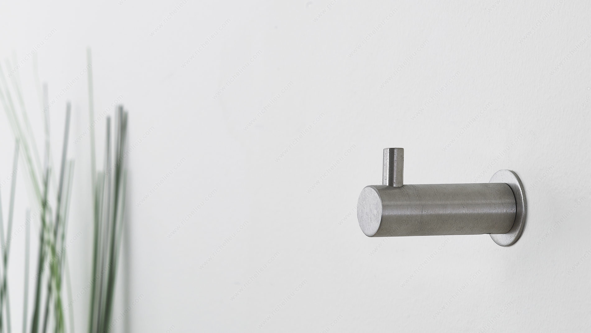 Richelieu 51128170 Modern Stainless Steel Hook - 51128 offers a sleek and contemporary solution for organizing your space while enhancing your interior design. With its clean lines and natural aesthetic, this simple hook beautifully complements modern rooms, embodying the essence of simplicity and functionality. Crafted from high-quality 304 stainless steel, this hook not only boasts a stunning gray and chrome finish but also ensures durability and resistance to wear. Measuring 25/32 inches in both height and width, with a projection of 2 3/8 inches, it is designed to fit seamlessly into various applications without overwhelming your decor. The Richelieu Modern Hook has an impressive load capacity of 11 pounds, making it ideal for hanging coats, bags, or towels. Installation is straightforward, with screws included for your convenience. Whether you're enhancing a kitchen, hallway, or bathroom, this hook strikes the perfect balance between form and function. Elevate your space with the Richelieu 51128170 Modern Stainless Steel Hook, where style meets practicality, making it a must-have accessory for any building professional or discerning homeowner.
