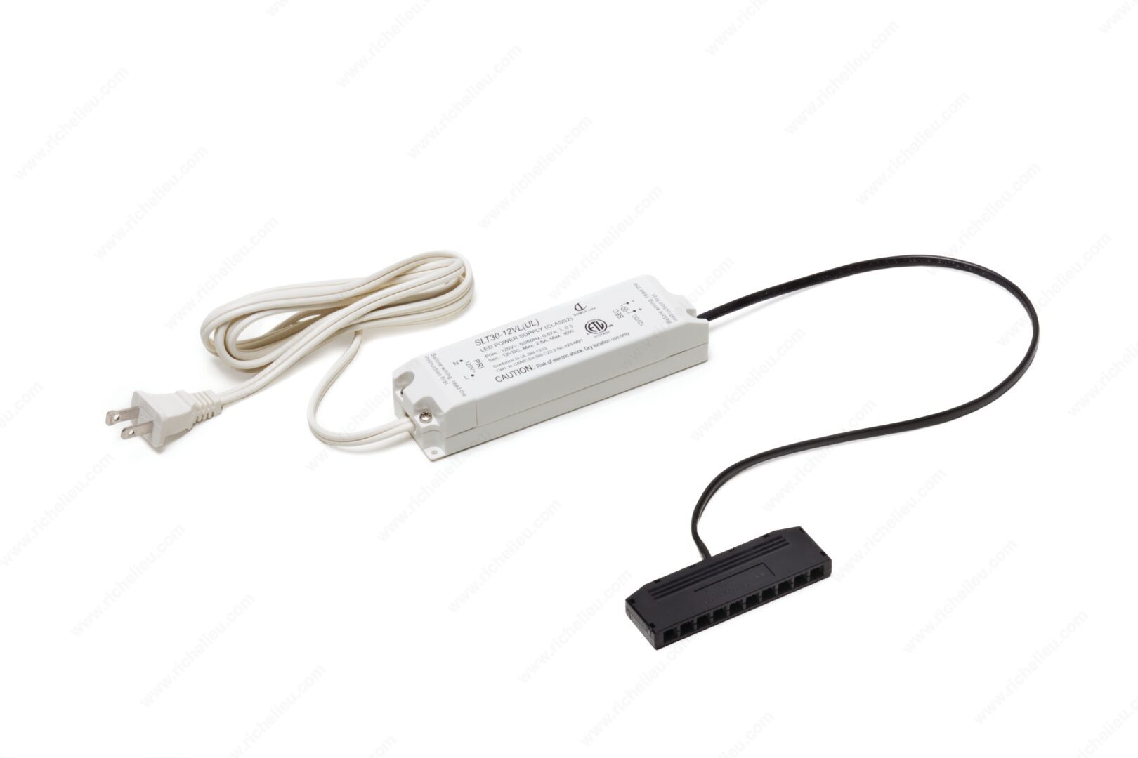 Richelieu 51230 Power Supplies 12V are essential LED drivers designed to meet a variety of lighting needs with efficiency and reliability. Available in four different watt maximums, these power supplies are versatile enough to accommodate different project requirements. Each unit features a distributor with 10 connections, streamlining the installation process, and comes with a generous 78 3/4 in (2 m) power cord for added convenience. Operating on a 100-120 V AC input, the Richelieu 51230 offers a stable 12 V output, providing a total of 30 watts of power. Its surface mounting capability ensures easy integration into various settings. The unit is constructed with a sleek white finish, making it a discreet addition to any environment. With an IP20 rating, this power supply is suitable for indoor use, while its ETL and cETLus certifications guarantee compliance with safety standards. Measuring 5 15/16 in in length, 1 5/8 in in width, and 1 1/4 in in height, it fits seamlessly in confined spaces. The Richelieu 51230 Power Supplies are the ideal choice for professionals seeking reliable, high-performance LED lighting solutions.