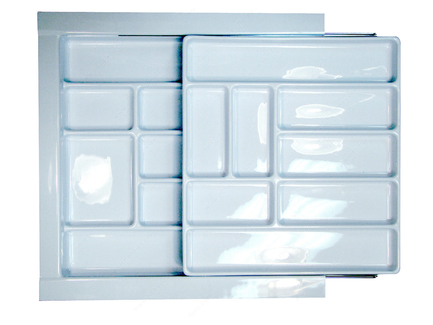 Richelieu 6030 Double-Tiered Cutlery Tray offers a sophisticated solution for organizing your kitchen essentials. This set of two trays features a convenient sliding top tray, allowing for easy access to cutlery and kitchen tools while maximizing storage efficiency. Designed for professionals and discerning homeowners alike, this tray is an essential addition to any kitchen space focused on functionality and aesthetics. To ensure a perfect fit, the Richelieu 6030 requires an interior height of at least 85 mm (3-3/8") and interior dimensions of 19 1/2 to 21 3/4 inches in width and 18 to 21 1/2 inches in depth. Made from durable polymer, this cutlery tray features a clean white finish that complements a variety of kitchen styles. Ideal for areas of activity such as storage, cleaning, preparation, and cooking, this product enhances drawer organization while keeping your utensils neatly arranged. With the ability to ship via UPS, upgrading your kitchen organization has never been easier. Choose the Richelieu 6030 Double-Tiered Cutlery Tray for a blend of practicality and elegance, ensuring that your kitchen remains a well-organized and efficient space.