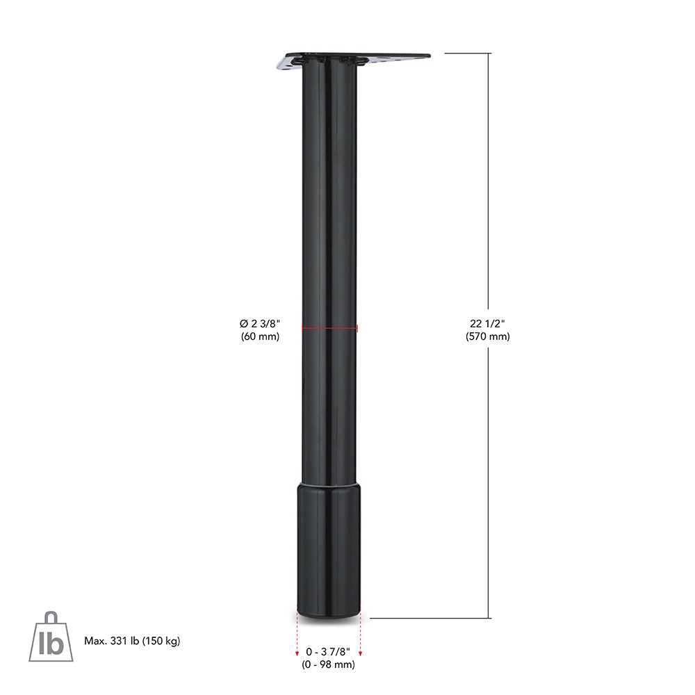 Richelieu 61457090 570 mm (22-5/8'') - Adjustable Table Leg is the ideal solution for both dining and work tables, combining practicality with style. This adjustable leg features a concealed height adjustment mechanism, allowing you to easily customize the height from 22 1/2 inches up to an additional 3 7/8 inches, ensuring a perfect fit for your table needs. Crafted from durable steel, the leg not only provides stability but also supports a maximum load capacity of 331 pounds, making it suitable for various table types, including kids' tables. The round leg design, with a diameter of 2 3/8 inches and a base diameter of 2 3/4 inches, offers a sleek appearance while ensuring robust support. Finished in a classic black, this table leg seamlessly blends with various decors and is straightforward to install, making it a practical choice for builders and DIY enthusiasts alike. Whether you're creating a new workspace or upgrading your dining area, the Richelieu adjustable table leg combines functionality with aesthetic appeal, ensuring your tables are both sturdy and stylish. Plus, it ships conveniently via UPS, adding to its appeal for busy professionals.