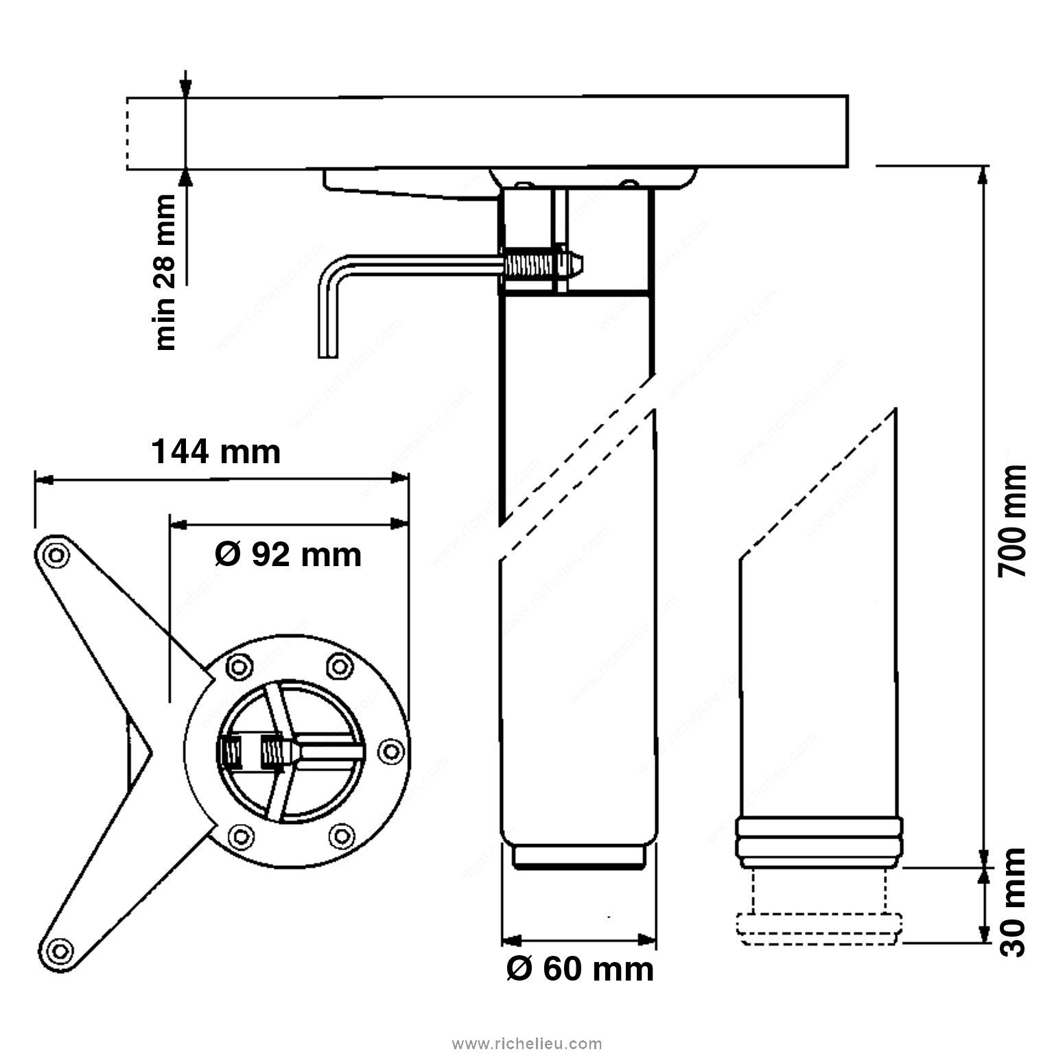 Richelieu 61571030 700 mm (27-1/2'') - Adjustable Table Leg offers a robust solution for both dining and work tables. Crafted from durable metal, this adjustable table leg combines functionality with elegance, ensuring your furniture maintains its aesthetic appeal while providing reliable support. Standing at a height of 27-1/2 inches, this table leg features a round design with a base diameter of 2 3/8 inches, making it a versatile addition to any space. The adjustable height capability allows for an extension of up to 1 3/16 inches, accommodating various table heights and preferences. With a maximum load capacity of 331 lbs per leg, you can trust this leg to support even the heaviest of table setups. Available in five stylish finishes, including a classic white option, the Richelieu adjustable table leg seamlessly blends with your decor. Installation is straightforward, ensuring you can set up your table quickly and efficiently. Designed for dining tables but adaptable for various applications, this table leg is an essential component for any professional or discerning homeowner looking to enhance their living or working environment.