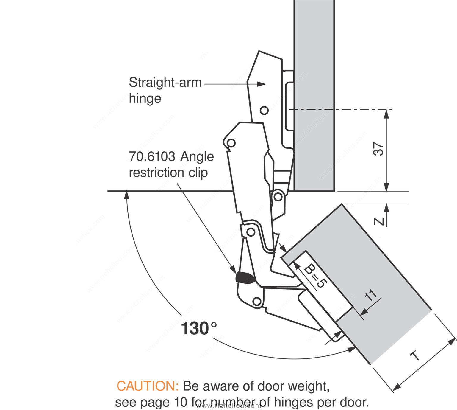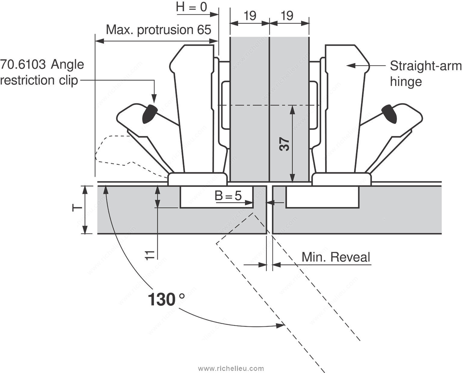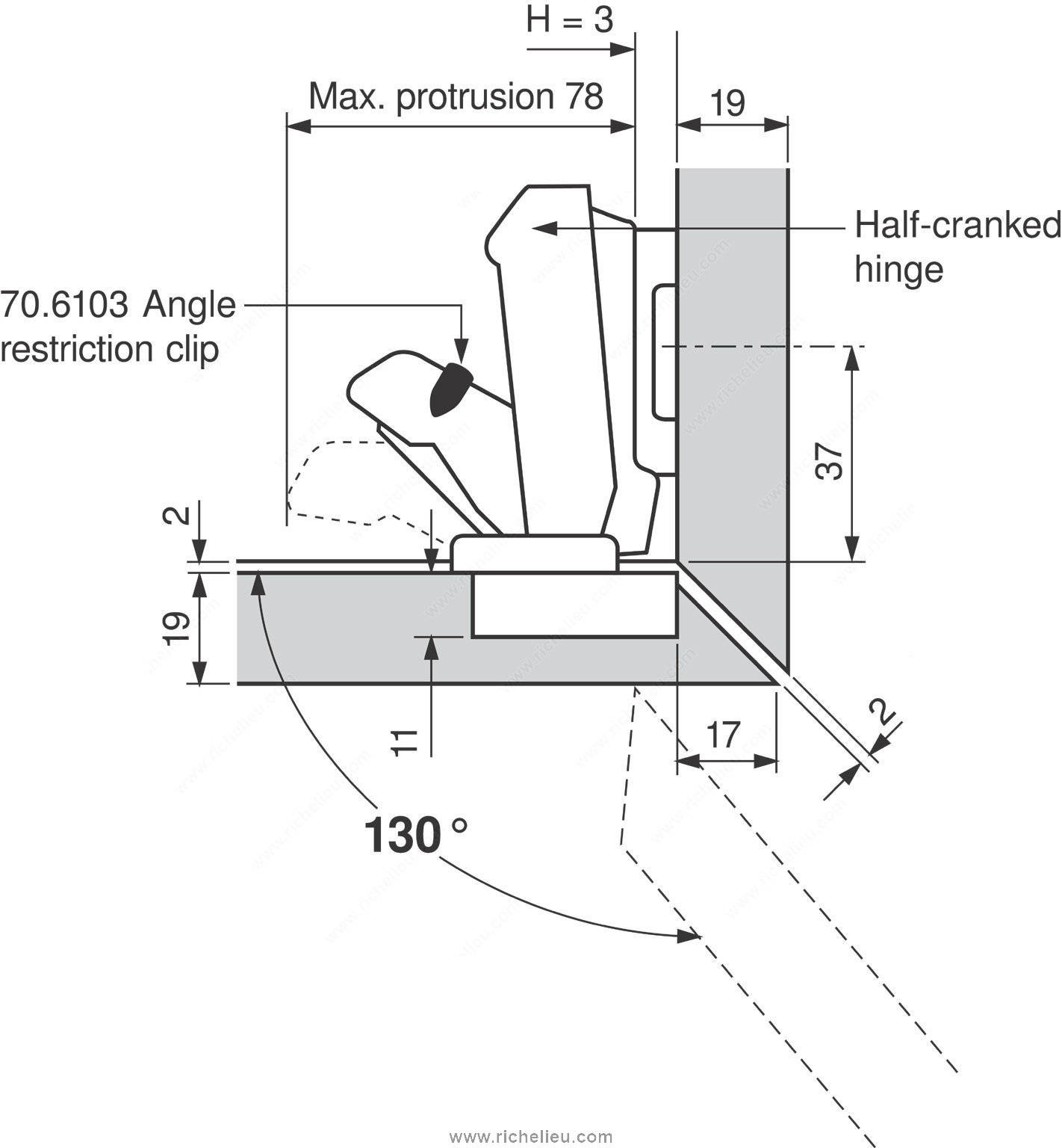 Richelieu 70610390 130 Angle Stop for 170 CLIP Top Hinge is a vital accessory designed to enhance the functionality of your hinge system. This angle stop effectively reduces the CLIP top opening angle from 170° to a more manageable 130°, making it ideal for specialized applications that require precise angle restriction. Its innovative design ensures a secure and reliable performance that meets the demands of various projects. The installation process is remarkably simple and can be completed with ease-no tools are necessary, allowing for quick adjustments to your existing setup. This feature not only saves time but also enhances efficiency on the job site. Manufactured by Blum, a trusted name in the industry, the Richelieu 70610390 is built to withstand the rigors of daily use while maintaining its high performance. Designed specifically for angle restriction, this product is an essential addition for professionals seeking to optimize their cabinetry and furniture applications. Shipping is straightforward, as it can be sent via UPS, ensuring that you receive your order promptly. With the Richelieu 70610390, you are choosing a reliable solution for your angle stop needs, ensuring precision and ease of use in every project.