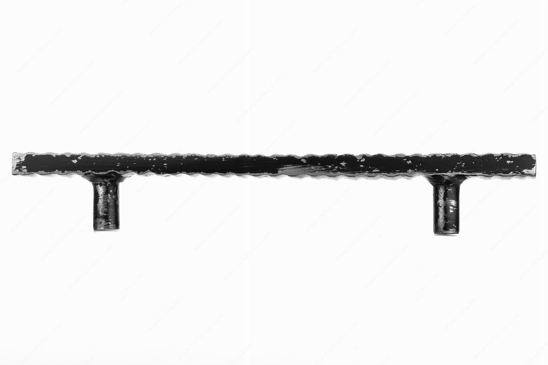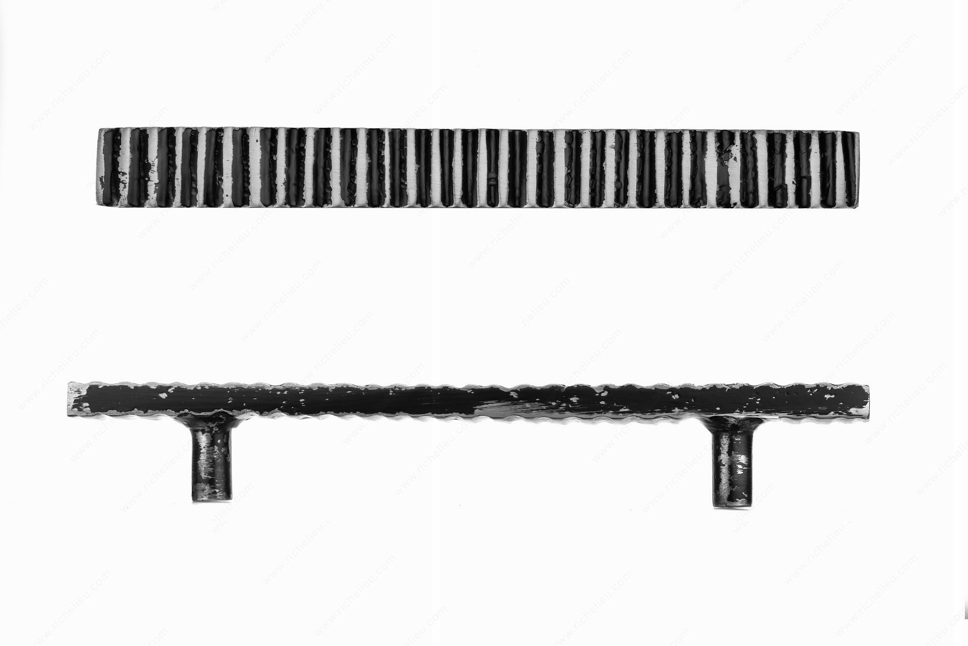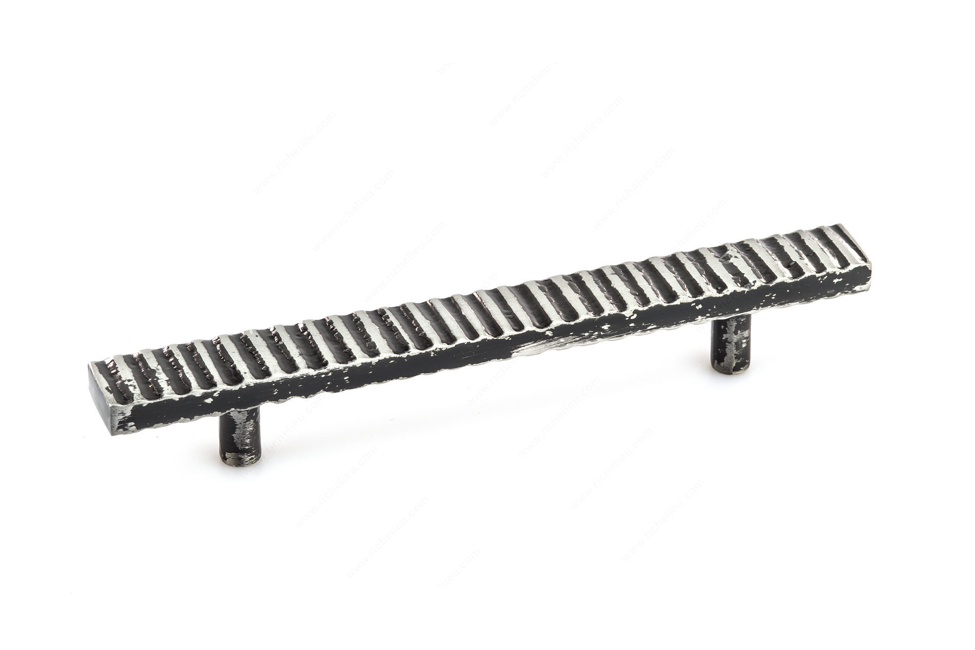 Richelieu 7440128903 Traditional Forged Iron Pull - 7441 offers a striking blend of style and durability, perfect for enhancing both furniture and cabinetry. This rectangular pull features a distinctive ridged surface, complemented by an antique iron finish that adds a bold statement to any space. Measuring 7 11/16 inches in length, with a center-to-center distance of 5 1/32 inches, it provides a comfortable grip while maintaining an elegant aesthetic. Crafted from high-quality forged iron, the pull is designed for lasting performance, making it an ideal choice for modern and industrial-themed interiors alike. The gray and chrome color palette ensures versatility, allowing it to seamlessly integrate with a variety of design schemes. With a projection of 1 7/32 inches and a width of 13/16 inches, this pull is not only functional but also visually impactful. Included with the pull are M4 screws for easy installation, ensuring a hassle-free upgrade to your cabinetry or furniture. As part of the complete 7441/8070 collection, the Richelieu 7440128903 pull is an excellent choice for professionals and homeowners looking to enhance their spaces with distinctive hardware that embodies quality and craftsmanship.