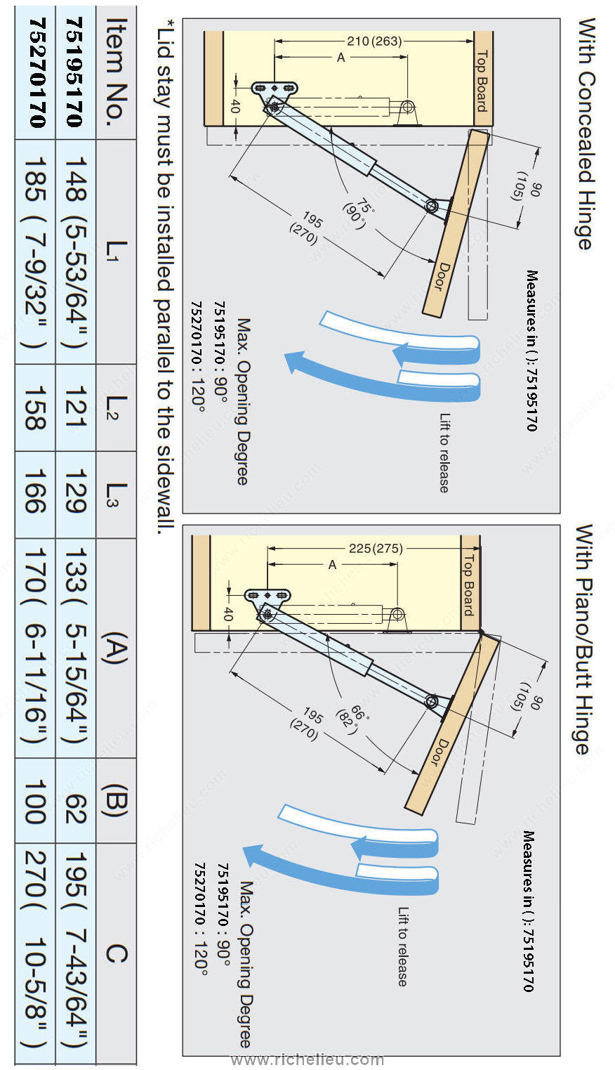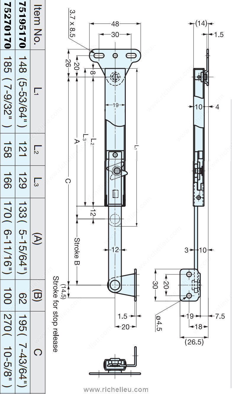 Richelieu 75195170 Stainless Steel Lid Stay offers a practical solution for securing lids or panels in a fully open position, enhancing accessibility and convenience in any space. Designed for ease of use, simply lift the lid to release, allowing for smooth operation without hassle. This versatile lid stay can be installed individually or in pairs, providing flexibility for various applications. Crafted from durable 304 stainless steel, this lid stay features a sleek satin finish that complements modern interiors while ensuring long-lasting performance. With a robust load capacity of 15 kg (33 lbs) each, it is capable of supporting heavier lids or panels, making it a reliable choice for both residential and commercial use. The non-handed design allows for installation on either the left or right side, accommodating different configurations effortlessly. Ideal for doors with heights ranging from 9 27/32 to 13 3/4 inches, the Richelieu 75195170 is compliant with RoHS standards, ensuring that it meets environmental safety criteria. Whether you're working on cabinetry, furniture, or custom builds, this lid stay enhances functionality while maintaining a polished appearance. Elevate your projects with the practicality and elegance of Richelieu's stainless steel lid stay.