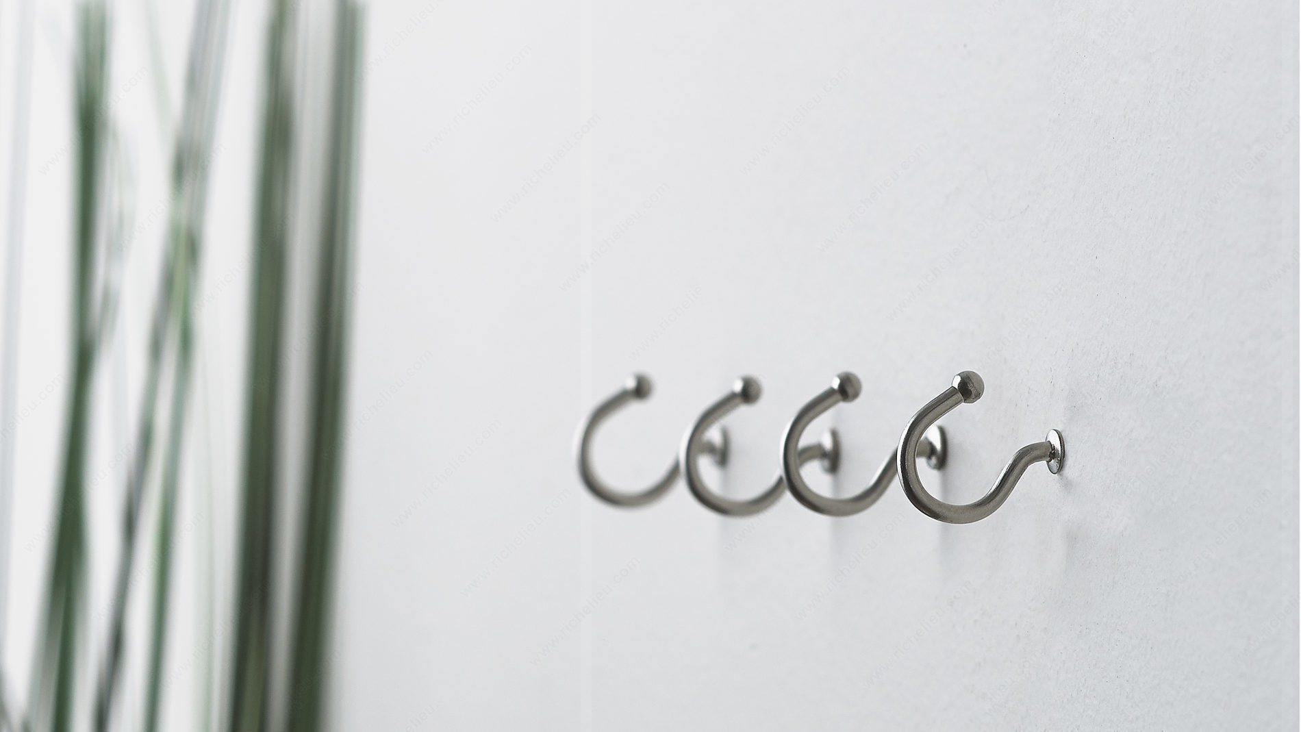 Richelieu 75706171 Stainless Steel Utility Hook - 7570 is designed for light use, offering a practical solution for organizing your space. Crafted from durable 304 stainless steel, this utility hook features a polished finish that combines functionality with a sleek aesthetic, making it an excellent addition to any home or commercial environment. With a load capacity of 11 lbs, this hook is perfect for hanging purses, mugs, or other lightweight items. Its overall dimensions are compact, measuring 23/32 inches in height, 3/16 inches in width, and 29/32 inches in projection, ensuring it fits seamlessly into your existing décor. The innovative design includes an integrated thread that simplifies installation, eliminating the need for screws or nails. The Richelieu utility hook is available in a stylish gray and chrome color scheme, enhancing its versatility for various applications. It adheres to RoHS standards, ensuring it meets environmental safety regulations. Shipped individually via UPS, this utility hook is a reliable choice for building professionals and knowledgeable homeowners alike, seeking ease of use and modern design in their organizational solutions. Choose the Richelieu 75706171 for a blend of style and convenience in your space.