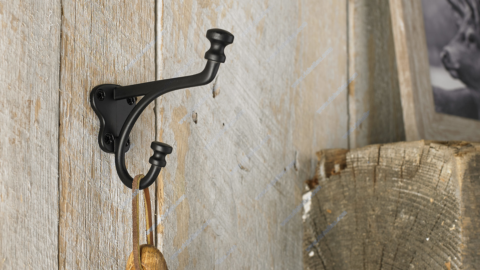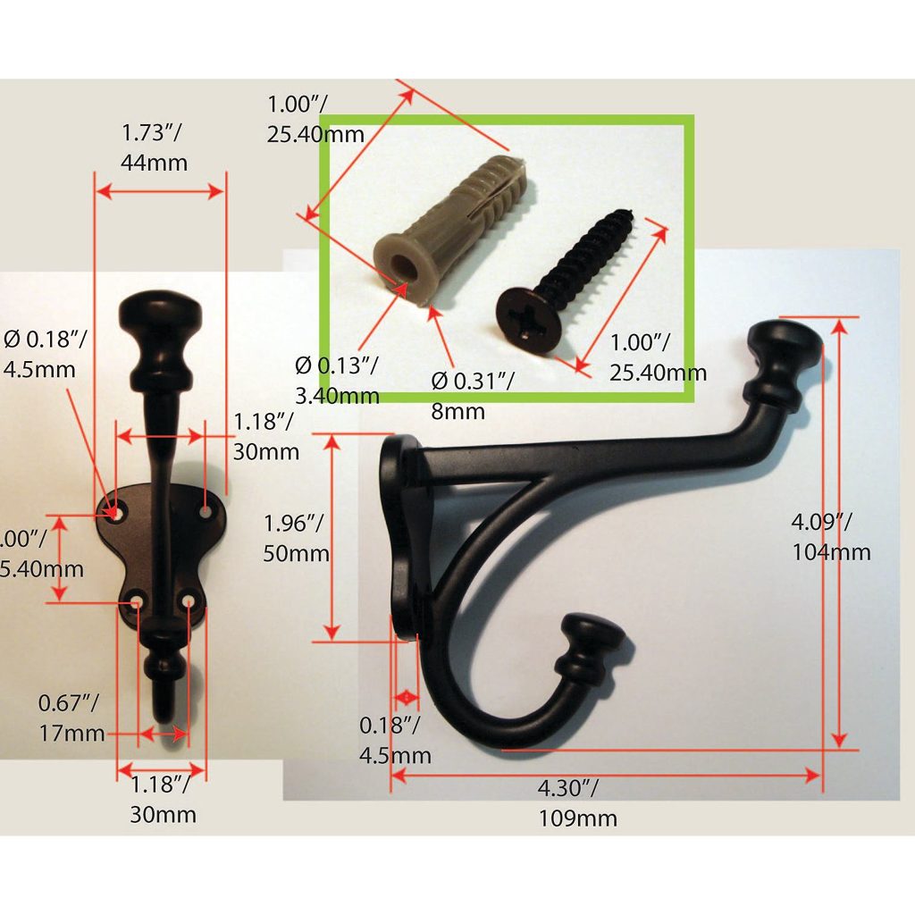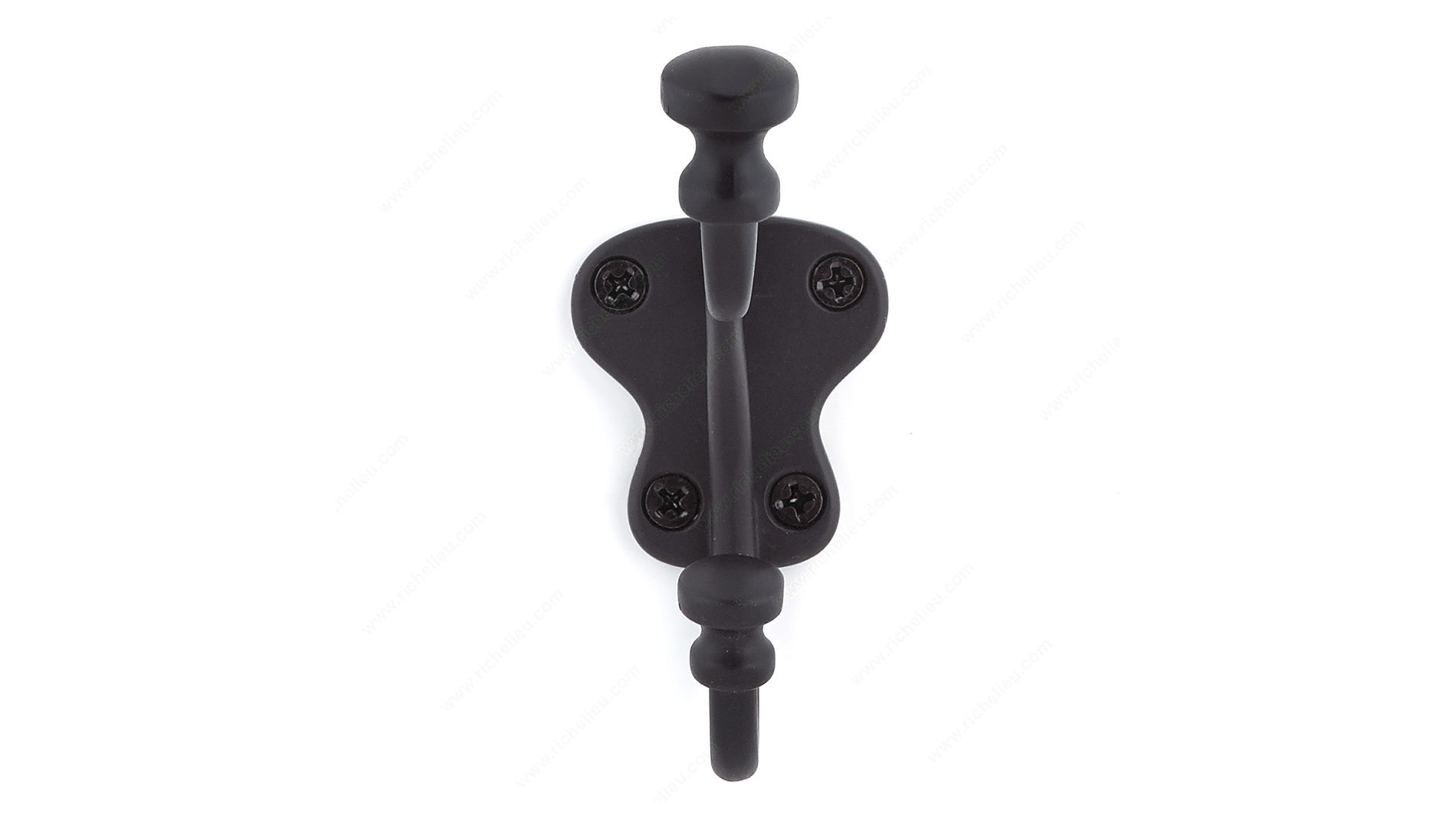 Richelieu 77129BAG Classic Metal Hook - 771 combines functionality with timeless elegance, making it an ideal addition to any home. This double hook features a classic design that enhances the aesthetic of bedrooms, bathrooms, entryways, mudrooms, and closets, providing style without sacrificing utility. Available in a sophisticated matte black finish, it complements a variety of decors while adding a touch of traditional charm. With a height of 4 7/32 inches and a projection of 4 9/32 inches, this hook offers ample space for hanging items. The dual arm design effectively doubles your storage potential, accommodating up to 22 pounds of weight-perfect for coats, bags, and towels. The hook's overall width measures 1 23/32 inches, making it compact yet sturdy. Installation is straightforward, as the necessary screws are included, allowing you to mount it on walls or doors with ease. The hook’s center-to-center measurement is 1 5/32 inches, ensuring a stable fit. Whether you’re looking to organize your space or enhance your decor, the Richelieu Classic Metal Hook is a practical and stylish choice for any environment.