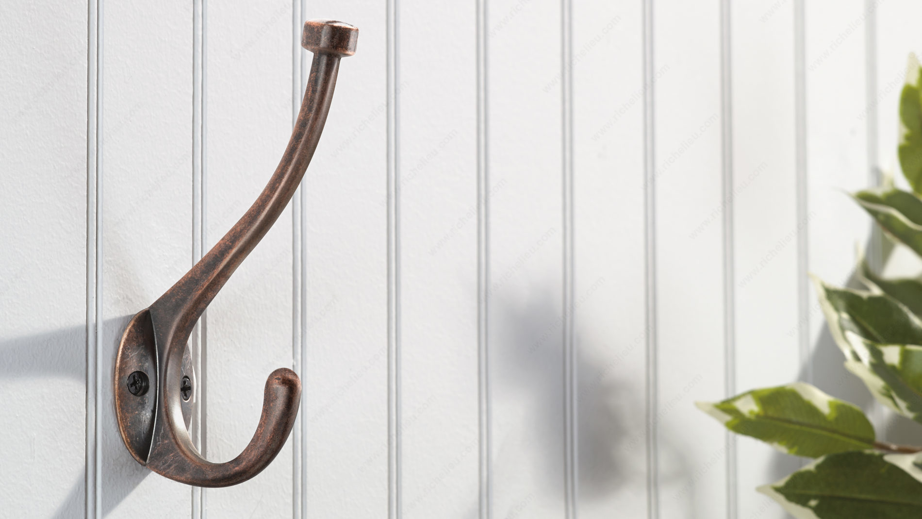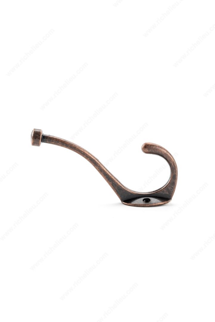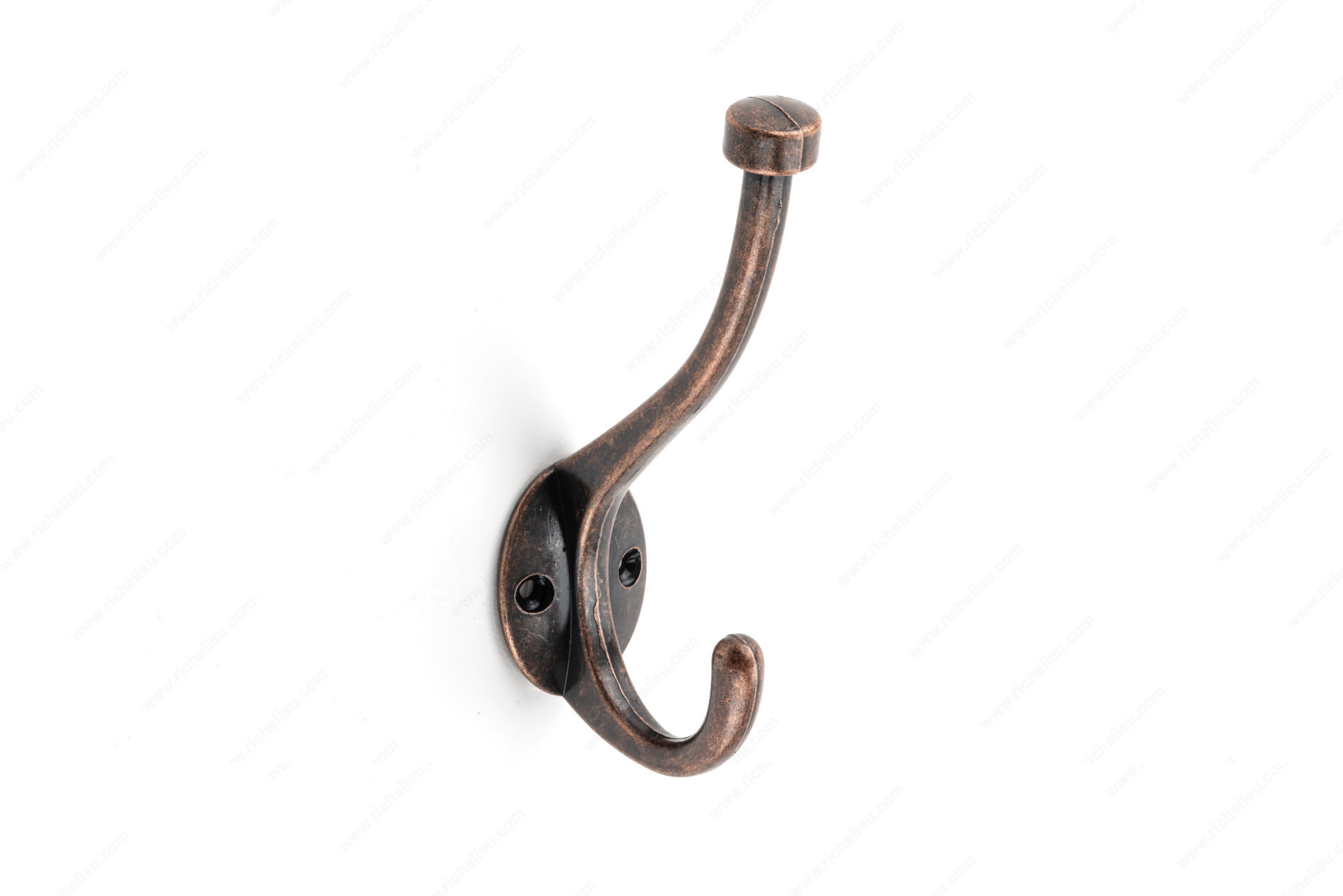 Richelieu 79046BAG Transitional Metal Hook is a stylish and functional solution designed to enhance any space while providing ample storage. Featuring a dual arm design, this coat hook maximizes your hanging potential, allowing for efficient organization of clothing and accessories. The ball end on the top hook ensures that your garments hang securely, preventing slipping and adding to the overall functionality. Finished in an elegant Florentine Bronze, this hook seamlessly integrates into various styles, making it ideal for bedrooms, bathrooms, entryways, mudrooms, closets, and more. With an overall height of 5 13/16 inches, a projection of 3 7/32 inches, and a width of 1 7/16 inches, it fits comfortably in tight spaces without sacrificing style. The hook is constructed from durable metal and has an impressive load capacity of 22 pounds, ensuring it can handle your everyday needs. Installation is straightforward, as the hook comes with wood screws included for easy mounting on walls or doors. The Richelieu 79046BAG not only improves organization but also adds a touch of sophistication to your home environment, making it a perfect choice for building professionals and discerning homeowners alike.