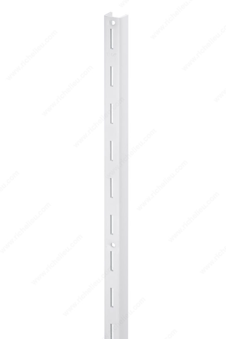 Richelieu 879630 Heavy-Duty Standard, Series 87 offers an exceptional solution for commercial shelving needs, boasting superior carrying strength to support a variety of applications, including paint, grocery, and hardware storage. Constructed from durable galvanized steel, this heavy-duty standard is designed for resilience and reliability, making it an ideal choice for demanding environments. With a length of 96 inches and a robust gauge of 12, the Richelieu 879630 ensures a sturdy installation that can withstand significant weight. Its well-engineered design features 2-inch vertical intervals and 1-inch long slots, allowing for flexible adjustment to accommodate various shelf heights. The simple mounting process further enhances its appeal for both professional builders and knowledgeable homeowners. This standard comes in a clean white finish, seamlessly integrating into any aesthetic. It is compatible with bracket series #186 and #187, providing versatility for diverse shelving systems. The standard's projection of 11/16 inch and a width of 7/8 inch make it a space-efficient option for commercial setups. Please note that shipping is via common carrier only, ensuring safe delivery of this essential shelving component. Choose the Richelieu 879630 for your next project to experience the perfect blend of strength and functionality.