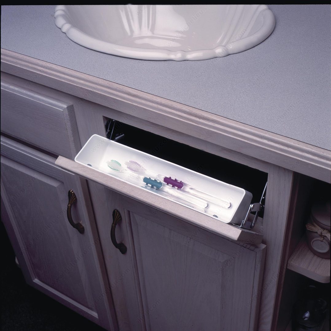Richelieu 8811130 Moulded false-drawer trays provide an innovative and practical solution for under-sink cabinets and drawer organization. Crafted from durable polymer, these trays are designed with a sleek white finish that seamlessly integrates into any cabinetry style, enhancing both aesthetics and functionality. Measuring 11 inches in width, 3 inches in height, and 2 inches in depth, the trays fit perfectly into standard-sized drawers, allowing for efficient use of space. The interior dimensions (11 1/2 inches wide, 3 inches high, and 2 inches deep) ensure ample room for storing a variety of items, making them ideal for organizing cleaning supplies or kitchen utensils. Equipped with ring hooks, the trays offer versatile hanging options, enhancing accessibility and ensuring that everything has its place. While hinges are not included, the straightforward design makes installation easy for both professionals and DIY enthusiasts. These moulded false-drawer trays ship conveniently via UPS, making them a practical choice for contractors and homeowners alike. With Richelieu's commitment to quality, you can trust that these trays will provide long-lasting performance while maintaining a polished look in your storage spaces.