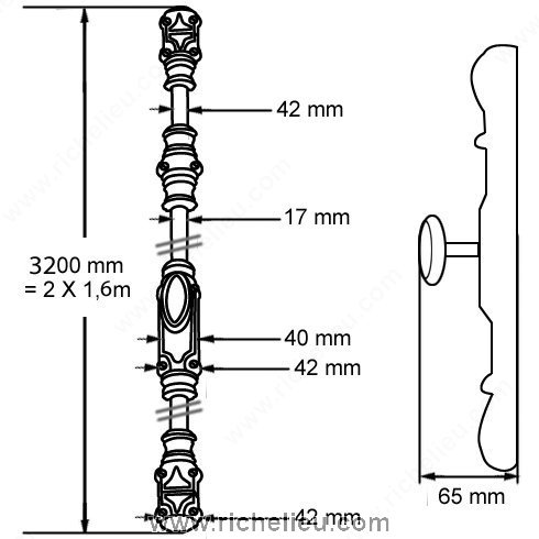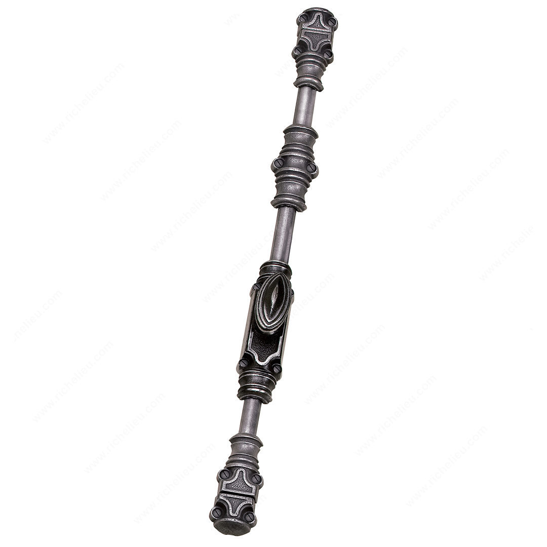 Richelieu 88843908 Traditional Metal Crmone Bolt - 888 offers a timeless solution for securing French doors, particularly in designs featuring very narrow stile conditions. This classic piece can be utilized as pairs to create a symmetrical look or combined with an entrance lock set or dead latch/deadbolt for enhanced security. Crafted from durable steel, it combines functionality with an elegant aesthetic, making it a perfect addition to any traditional setting. The overall dimensions of the bolt measure 10 ft 5 in in length, 1 21/32 in in width, and a projection of 2 9/16 in, ensuring it fits seamlessly into your door design. The natural iron finish, presented in a sophisticated gray and chrome palette, adds a touch of refinement while complementing various decor styles. Included with the bolt are rods/bars, allowing for easy installation-please consult the technical drawing for precise lengths. Wood screws are provided for secure fastening, ensuring a robust and reliable installation. Ideal for professionals and discerning homeowners alike, the Richelieu Traditional Metal Crmone Bolt is an excellent choice for enhancing both the security and visual appeal of your doors.