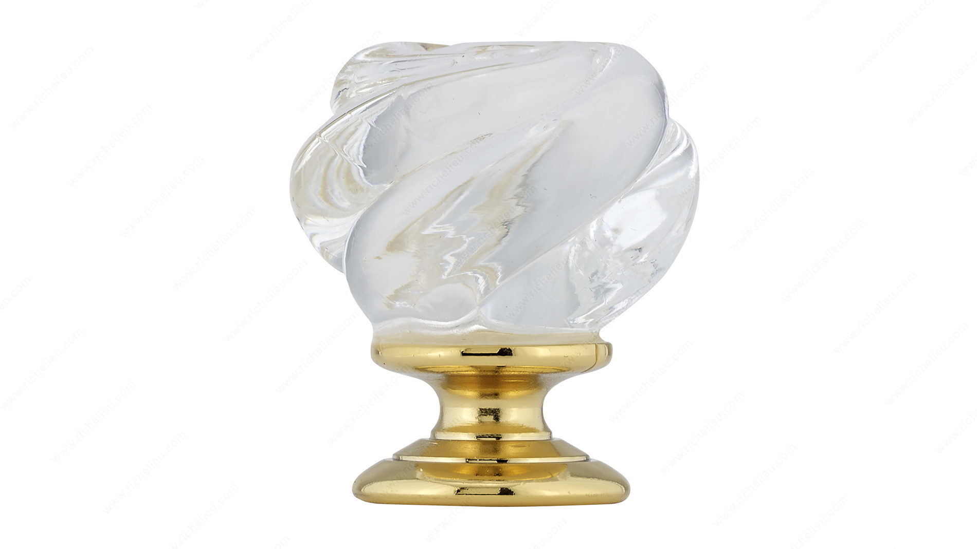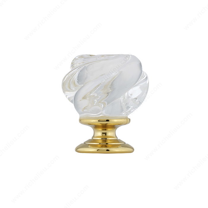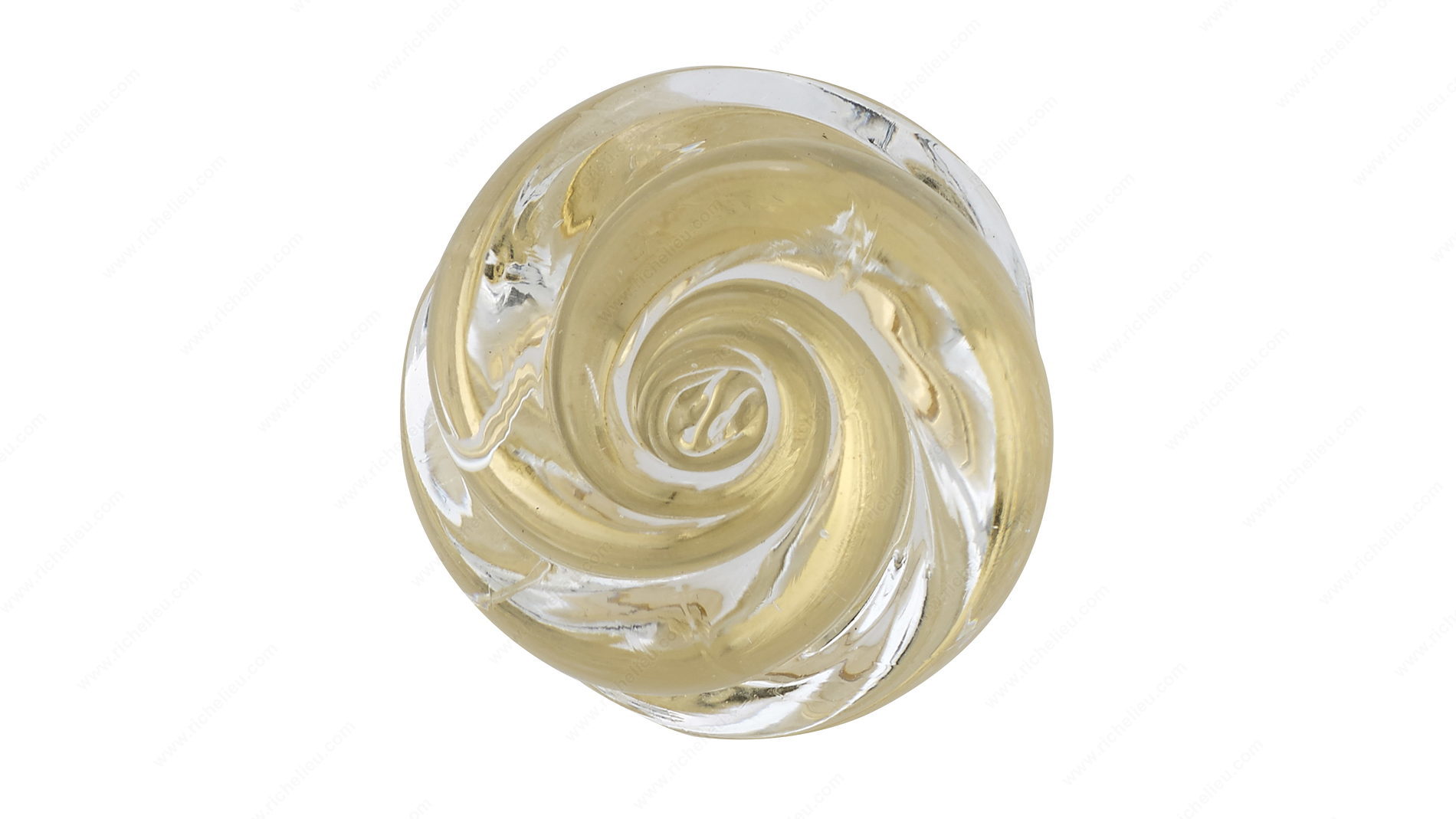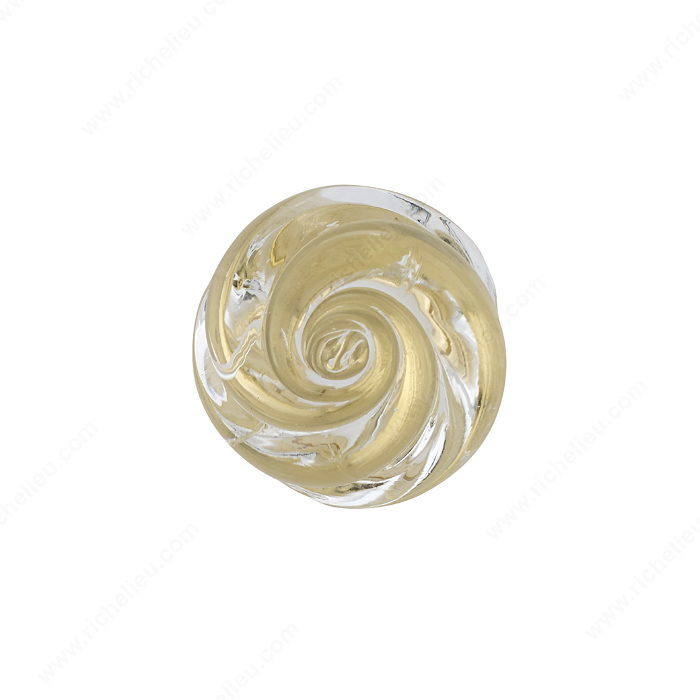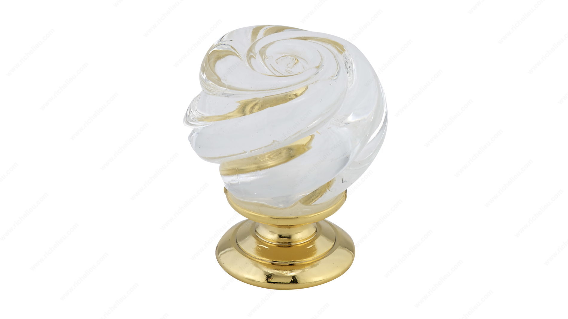 Richelieu 903013011 Traditional Murano Glass and Metal Knob - 9030 elegantly combines timeless design with modern functionality. This exquisite knob features a unique swirled shape inspired by the delicate form of a rose, making it an ideal enhancement for both bedroom and bathroom decor. The transparent Murano glass and brass finish create a soft yet striking aesthetic, adding a touch of sophistication to any space. With a diameter of 1 3/16 inches and a projection of 1 3/8 inches, this knob is designed to fit comfortably in hand while providing excellent usability. The knob is constructed from high-quality crystal and Murano glass, ensuring durability alongside its beautiful appearance. It offers a load capacity of 2.2 pounds, making it suitable for various applications. Installation is straightforward, as it comes with an M4 screw included for your convenience. The stunning color combination of yellow and brass, along with clear glass, enhances its appeal, allowing it to seamlessly integrate into a range of interior styles. Elevate your cabinetry and furniture with the Richelieu 903013011 Traditional Murano Glass and Metal Knob, where elegance meets practicality.