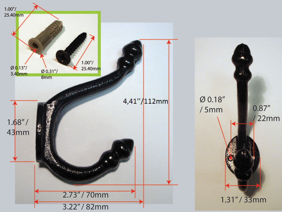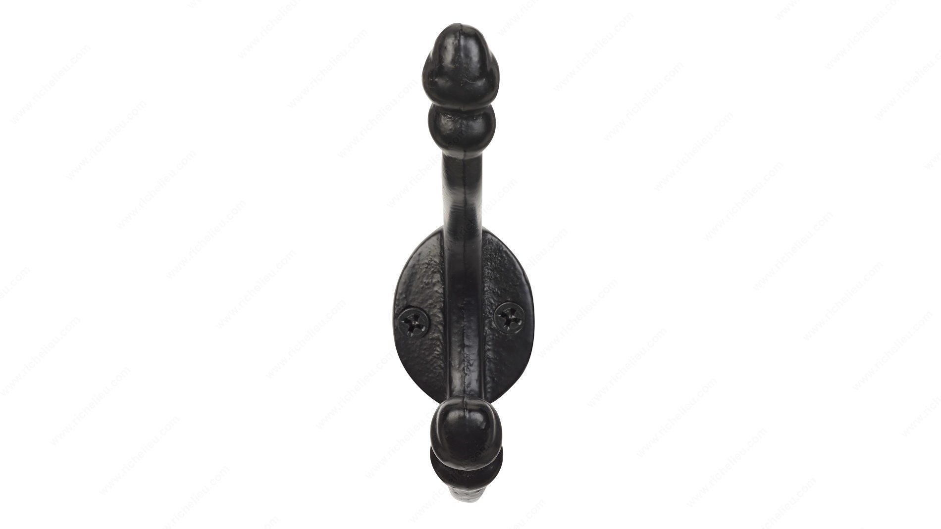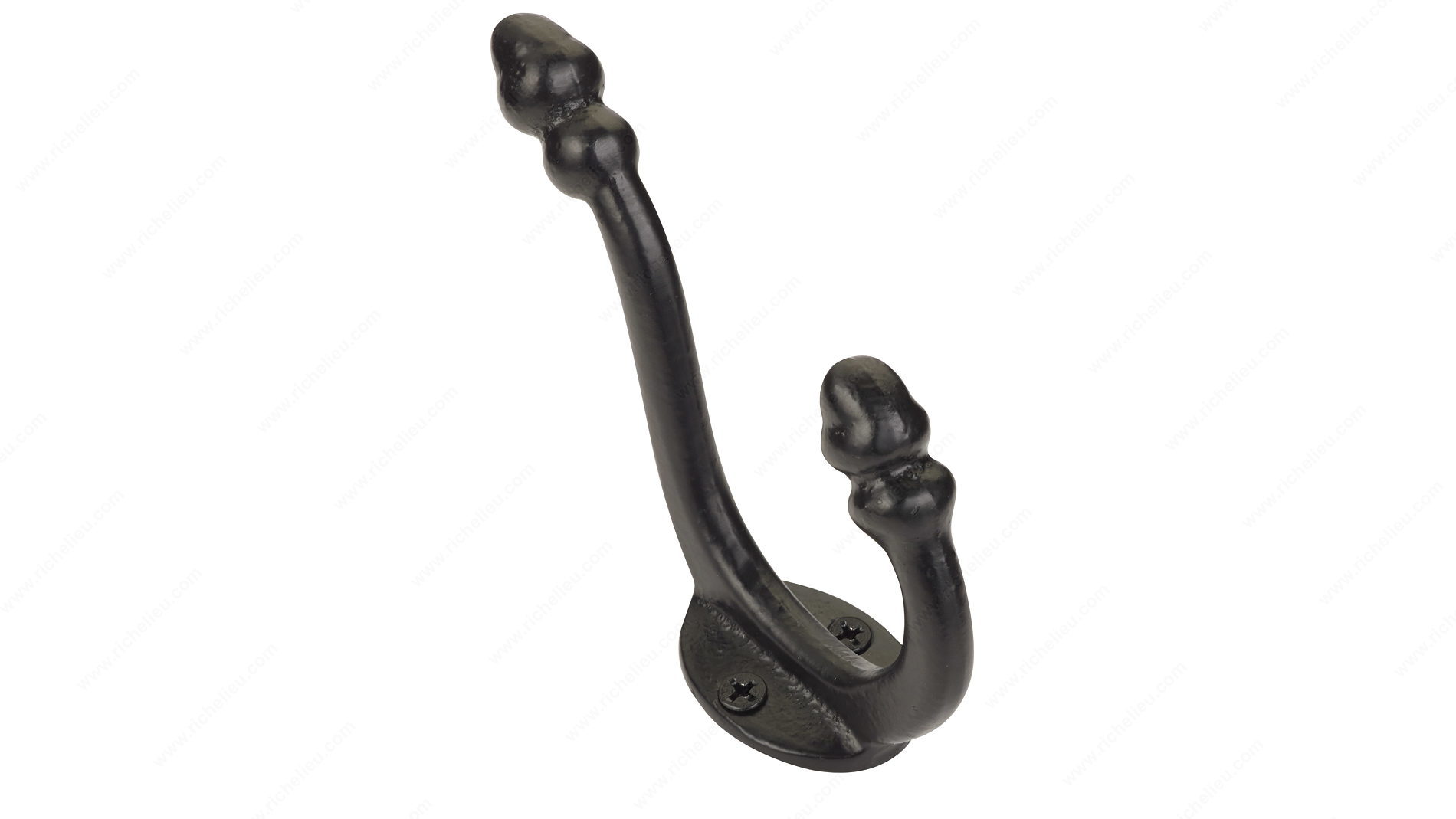 Richelieu 92347BAG Classic Wrought Iron Hook - 823/923 offers a blend of functionality and timeless design, perfect for enhancing any space with a rustic touch. This antique iron hook features a striking black finish that seamlessly integrates into traditional-themed rooms, providing a sophisticated accent. The innovative dual arm design significantly increases your storage potential, making it an ideal solution for various settings, including bedrooms, bathrooms, entryways, mudrooms, and closets. With a load capacity of up to 22 lbs, this robust metal hook ensures reliable support for coats, bags, and other essentials. Measuring 4 13/32 inches in height, 1 5/16 inches in width, and projecting 3 7/32 inches from the wall, it is compact enough to fit comfortably in tight spaces. The hook comes packaged in a convenient bag and includes necessary screws for easy installation on walls or doors. Enhance your interior decor while maximizing storage with the Richelieu Classic Wrought Iron Hook. This versatile piece is not just a practical addition but also a stylish detail that elevates the overall ambiance of your home.