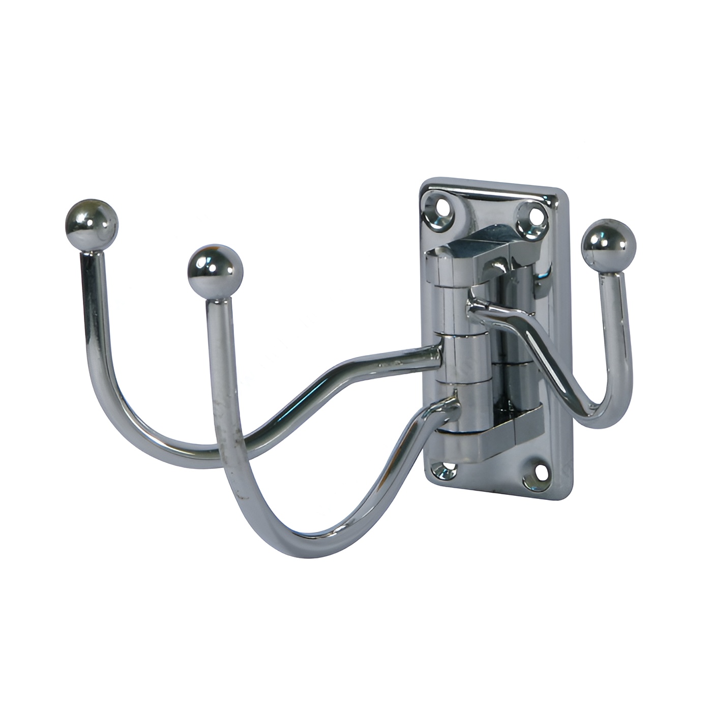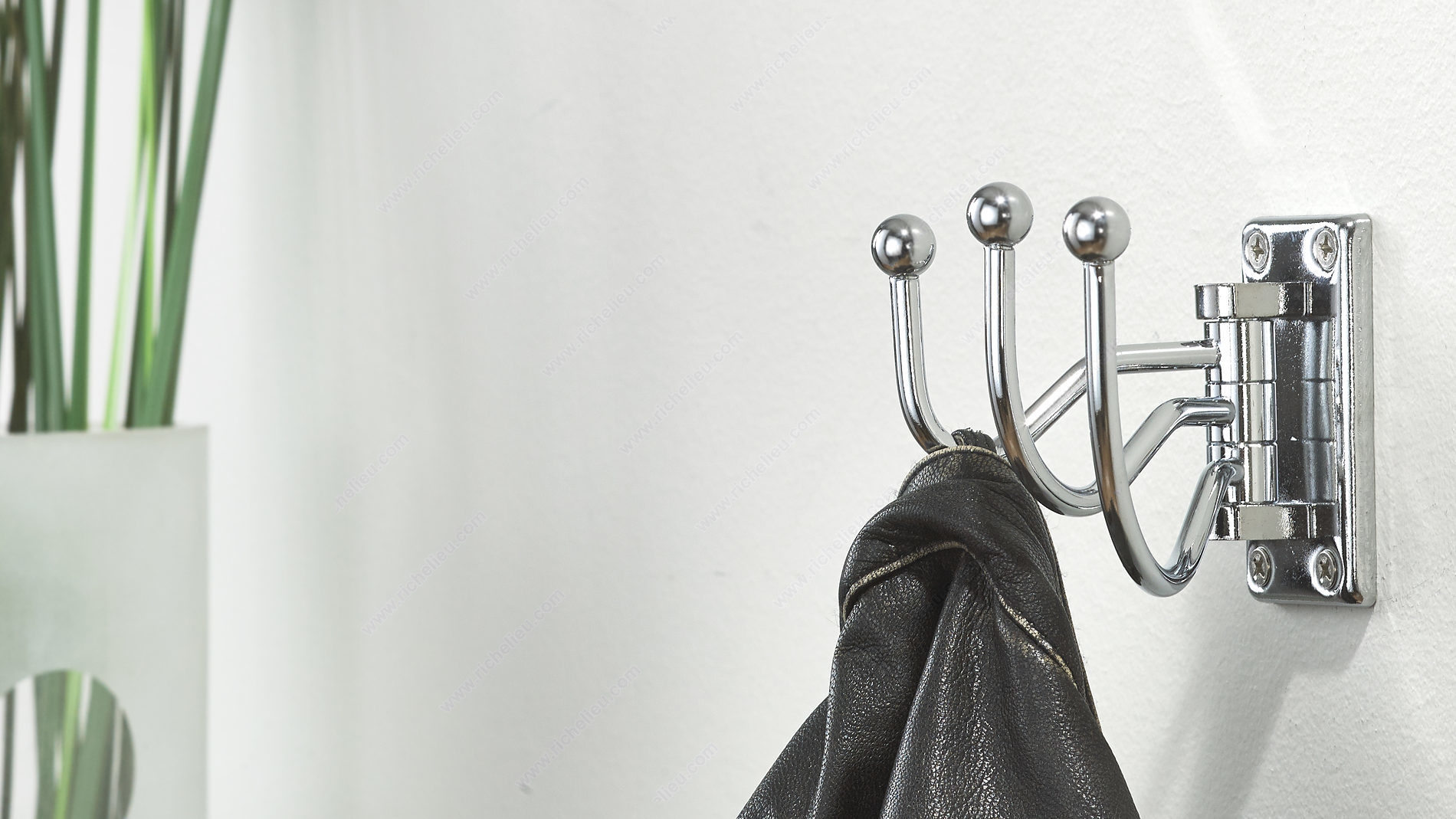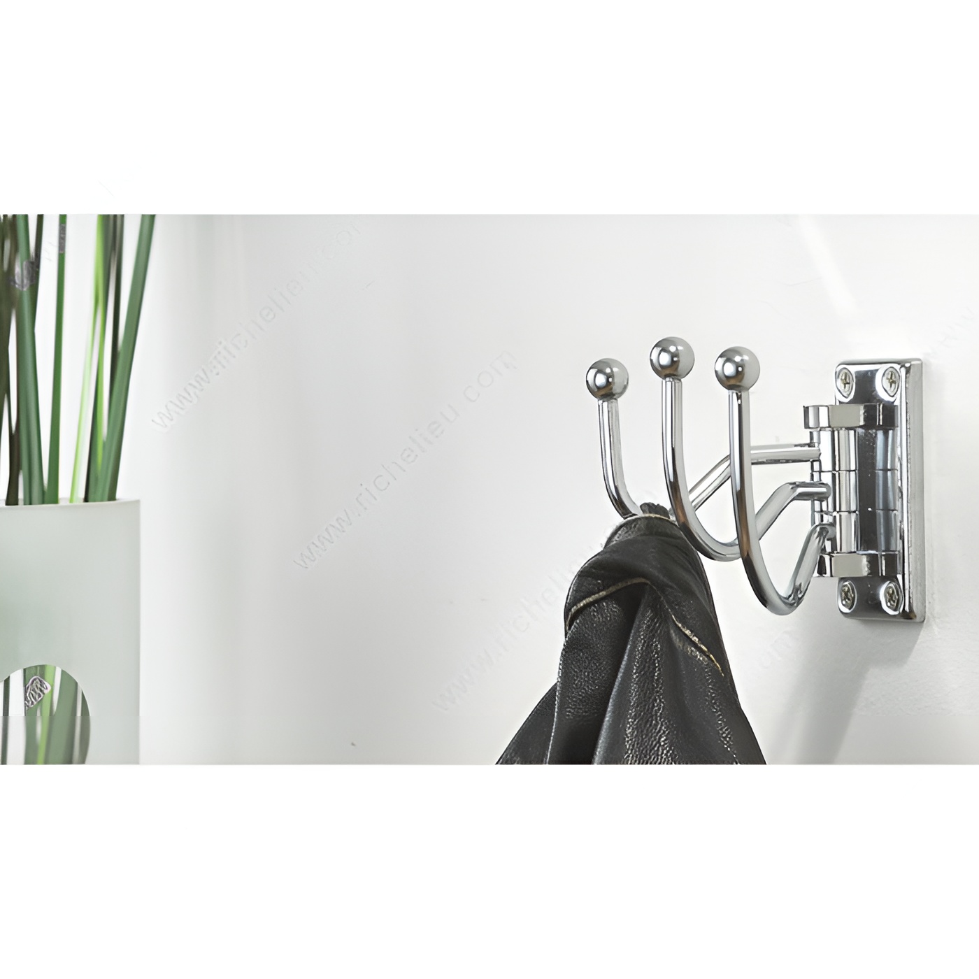 Richelieu 97843BAG Utility Swivel Hook - 978 is designed to enhance both functionality and style in any space. This triple swivel hook features a sleek chrome finish that effortlessly complements various decor styles, making it a versatile addition to your home. Each of the three arms folds back with ease when not in use, allowing for efficient space management in areas like bedrooms, bathrooms, entryways, mudrooms, and closets. Crafted from durable metal, this utility hook boasts a load capacity of 22 lb, ensuring it can support your everyday items without compromise. Its compact dimensions-3 1/32 inches in height, 4 13/32 inches in projection, and 1 11/16 inches in width-make it perfect for tight spaces while providing ample hanging options. Installation is straightforward, as the required screws are included, allowing you to mount the hook on walls or doors with minimal effort. The contemporary gray and chrome color combination adds a modern touch, making it not just a functional accessory but also a stylish one. Whether for organizing coats, bags, or towels, the Richelieu Utility Swivel Hook is a practical solution that combines quality and aesthetic appeal.