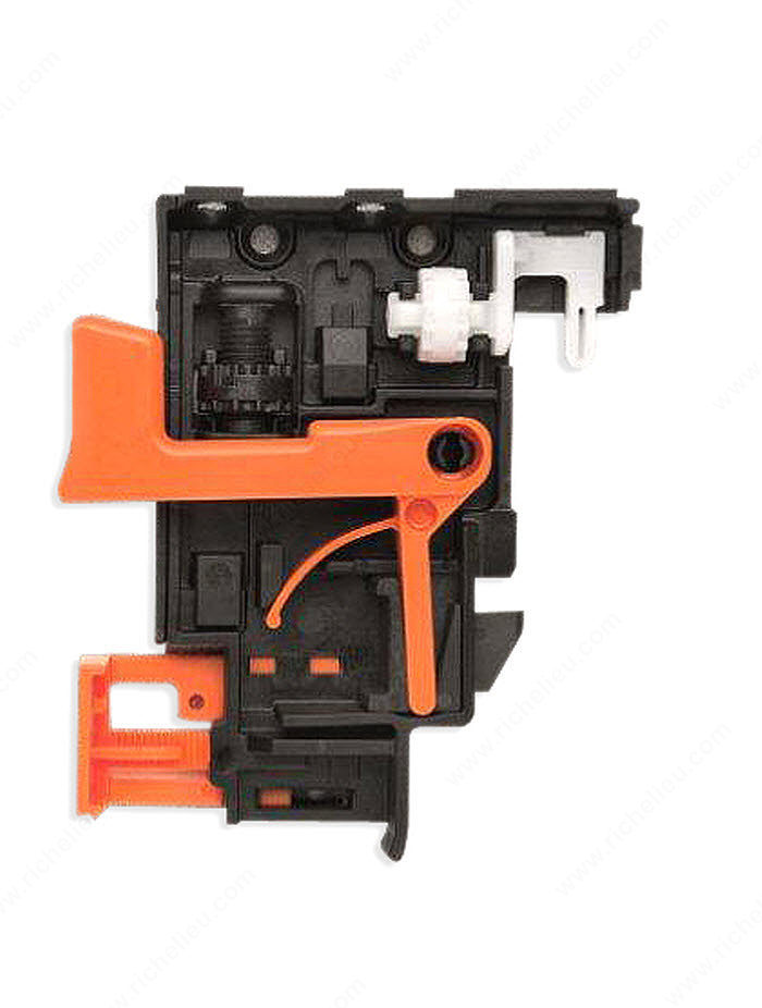 Richelieu A750011 Locking Device for Futura Slides offers a reliable front locking solution designed specifically for Futura PUSH and SMOVE slides. This device enhances the functionality of standard drawers, ensuring they remain securely closed while allowing for easy access when needed. Crafted from durable plastic, the locking device features an appealing black and orange finish, seamlessly blending with modern cabinetry. The A750011 provides exceptional versatility with its six-direction adjustment capabilities, allowing for precise height, depth, and lateral modifications. This adaptability ensures a perfect fit in various installations, making it an ideal choice for both building professionals and knowledgeable homeowners. It is specifically designed for right-side application and is mounted undermounted for a clean, unobtrusive look. Packaged individually for convenience, this locking device is part of the Futura product line, which includes Futura SMOVE, FUTURA PUSH, and FUTURA SELF CLOSING systems. The ease of installation and adjustment makes it a valuable addition to any cabinetry project, providing peace of mind and enhanced functionality. With the Richelieu A750011 Locking Device, you can elevate your drawer systems to a new level of reliability and user-friendliness.