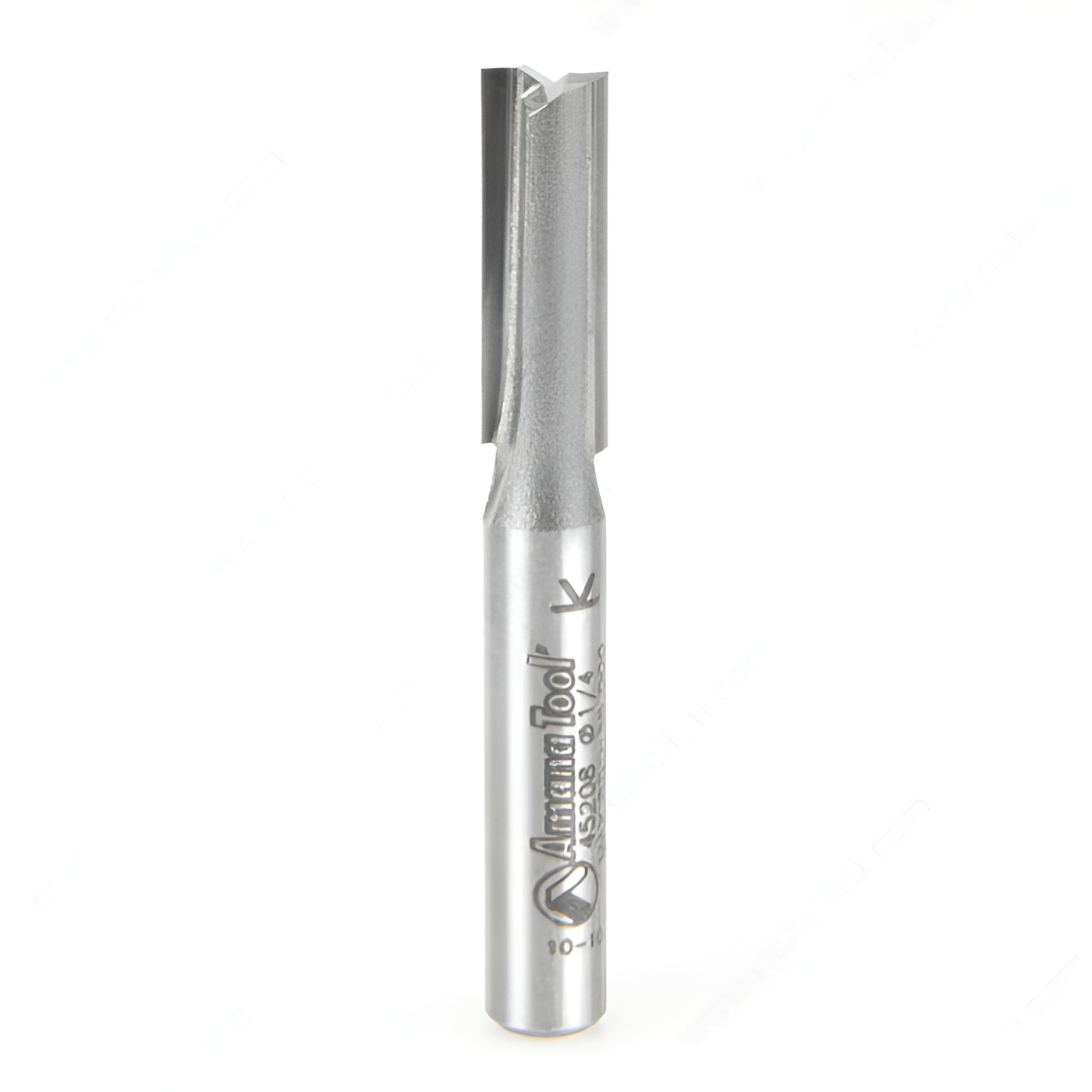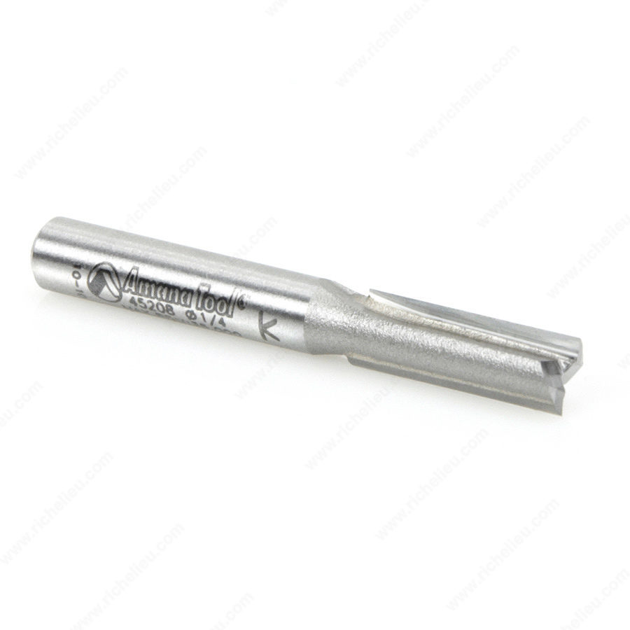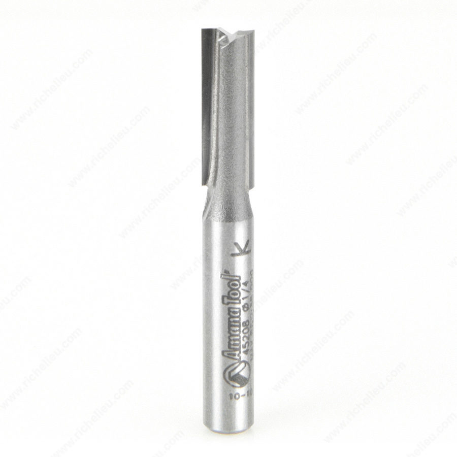 Richelieu AT45208 A-Max Extended Life Straight Plunge Bit delivers exceptional performance for woodworking professionals and skilled DIY enthusiasts alike. Engineered with a two-flute design, this bit minimizes vibration, ensuring a precise and smooth finish, which is essential for high-quality projects. Each revolution results in two cuts, offering a refined surface, although it may slightly reduce feed rate, making it ideal for applications where detail is paramount. This versatile bit excels at cutting through various materials, including wood, MDF, and plywood, making it a valuable addition to your toolkit. Its solid carbide construction provides durability and longevity, allowing for extended use without compromising performance. With a cut diameter of 1/4 inch and an overall length of 2 inches, it is compatible with CNC (Numerical Control) machines and routers, making it suitable for a wide range of tasks. The Richelieu AT45208 is shipped via UPS, ensuring prompt delivery to your location. It features a 1/4-inch shank, making it easy to fit into standard router collets. Invest in this quality plunge bit for a reliable tool that enhances your woodworking projects with precision and finesse.