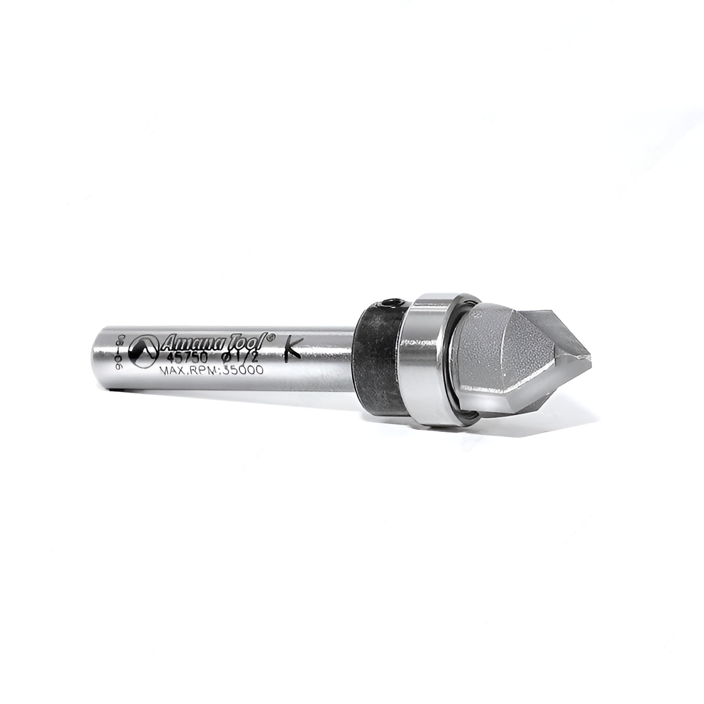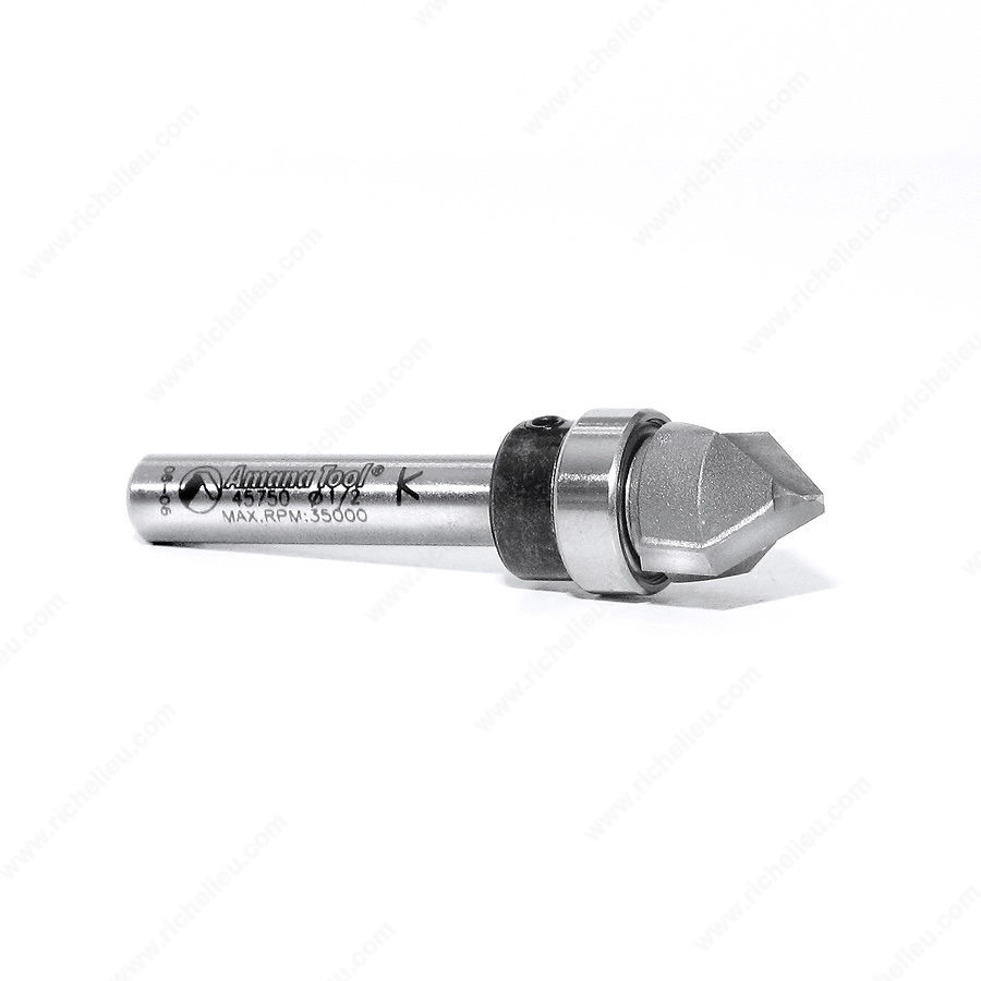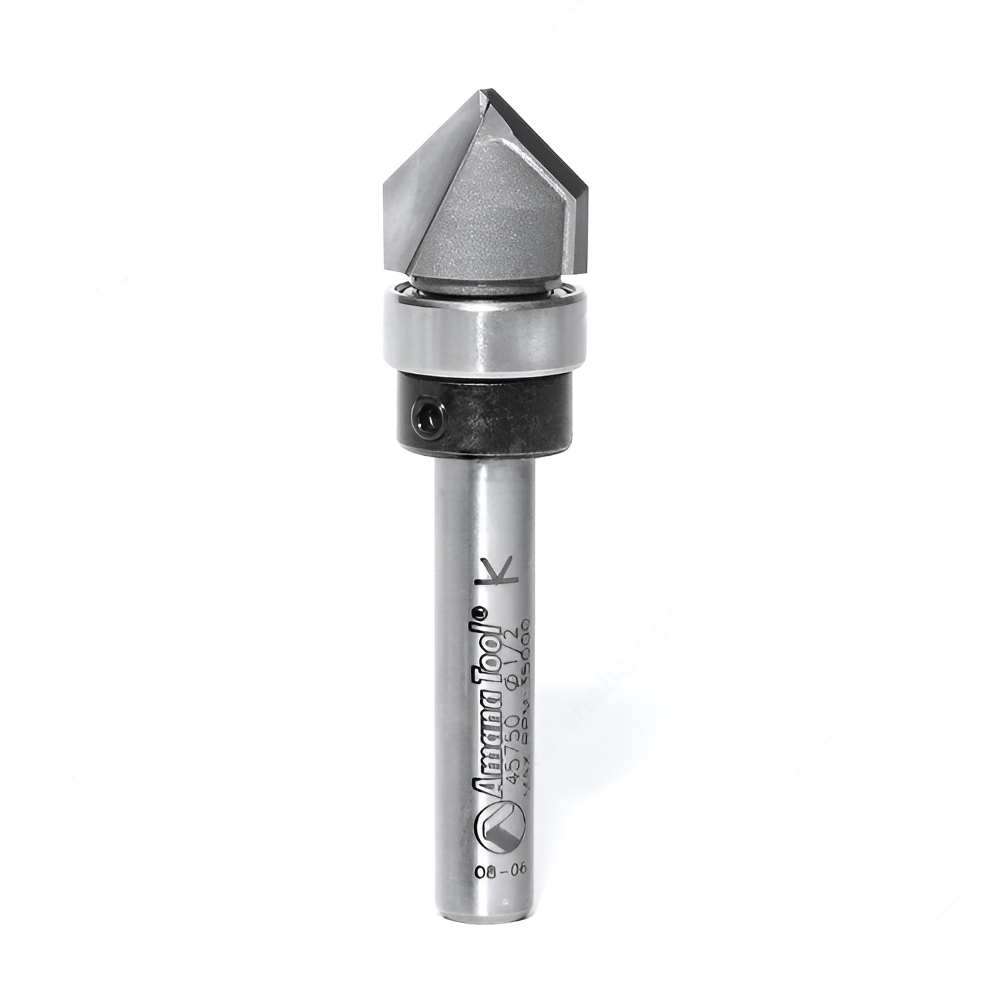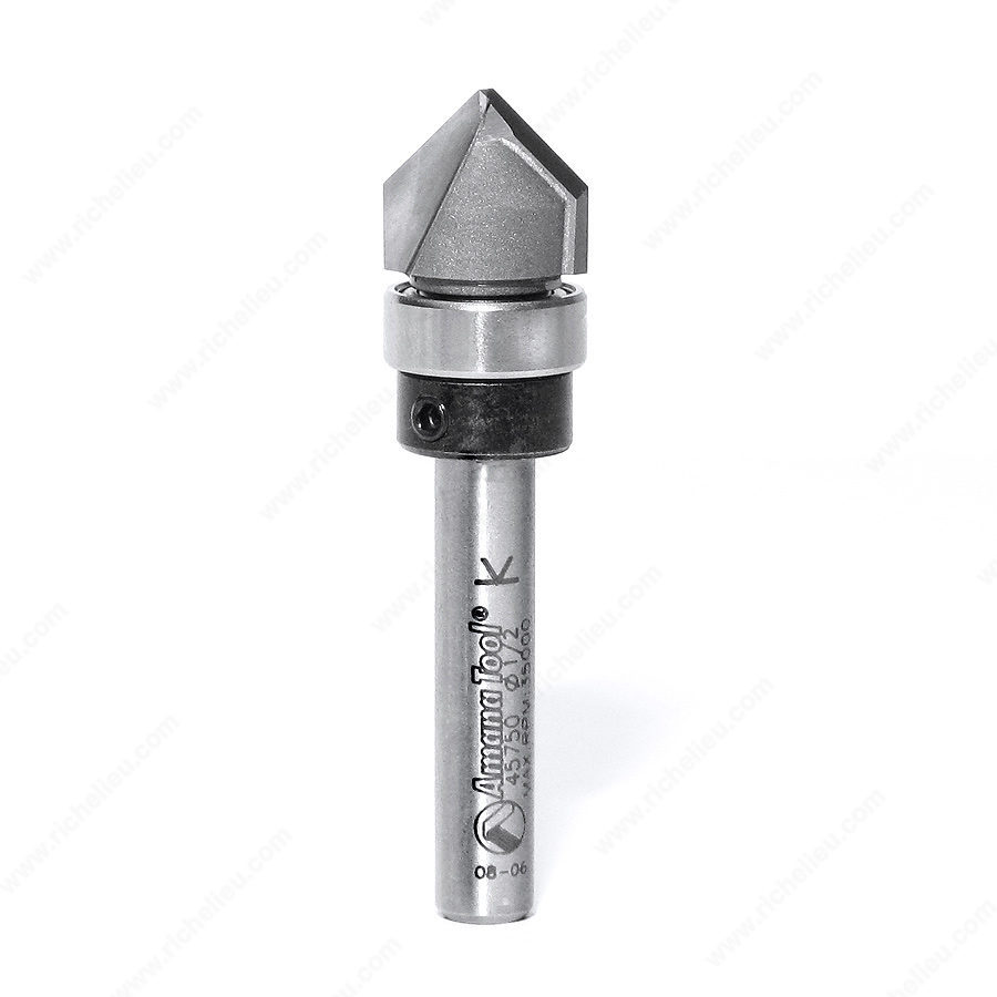 Richelieu AT45750 V-Groove Template Bit is expertly crafted for precision fluting and 'V' grooving cuts, providing exceptional results when guided by a template or pattern. Designed with a shank-mounted ball-bearing pilot, this bit effortlessly rides along the template edge, ensuring that the cutter accurately duplicates the template contour in your workpiece. This feature is crucial for achieving consistent and professional-quality finishes in your projects. The 90° 'V' groove design is ideal for decorative applications, making it a valuable addition to your signmaking, grooving, and carving tasks. It's important to note that this bit is not intended for miter-folding, focusing instead on enhancing the aesthetic appeal of your woodworking projects. With a cut diameter of 1/2 inch and an overall length of 2 inches, the AT45750 is made from durable carbide-tipped material, ensuring longevity and reliable performance. The 1/4 inch shank fits most routers, allowing for versatility in your tool collection. For optimal results, use the template on top of the workpiece with a handheld router or on the bottom when using a table-mounted router. Elevate your craftsmanship with the precision and quality of Richelieu’s V-Groove Template Bit.