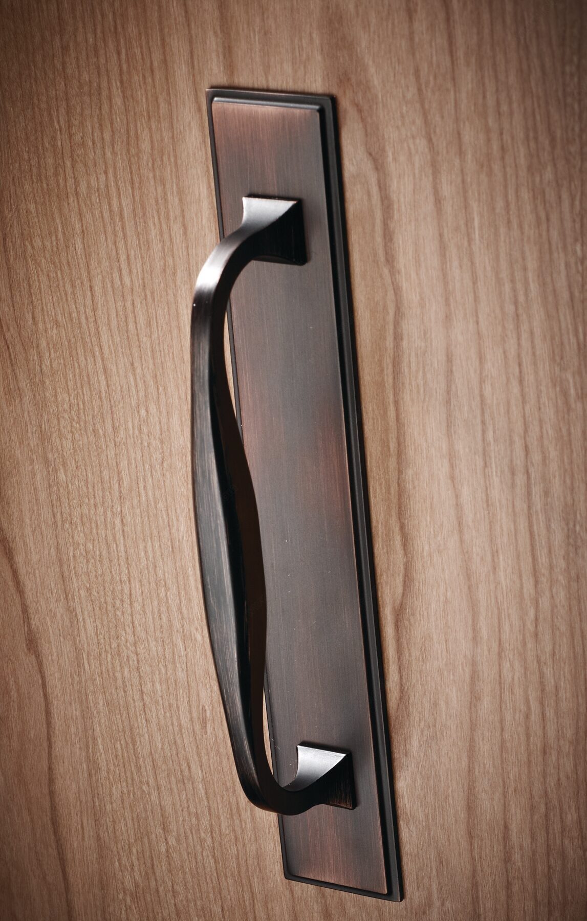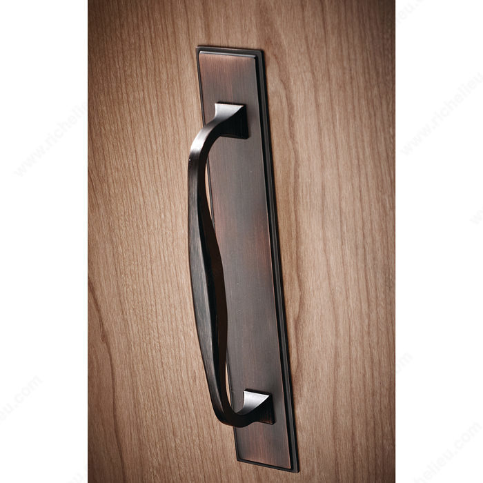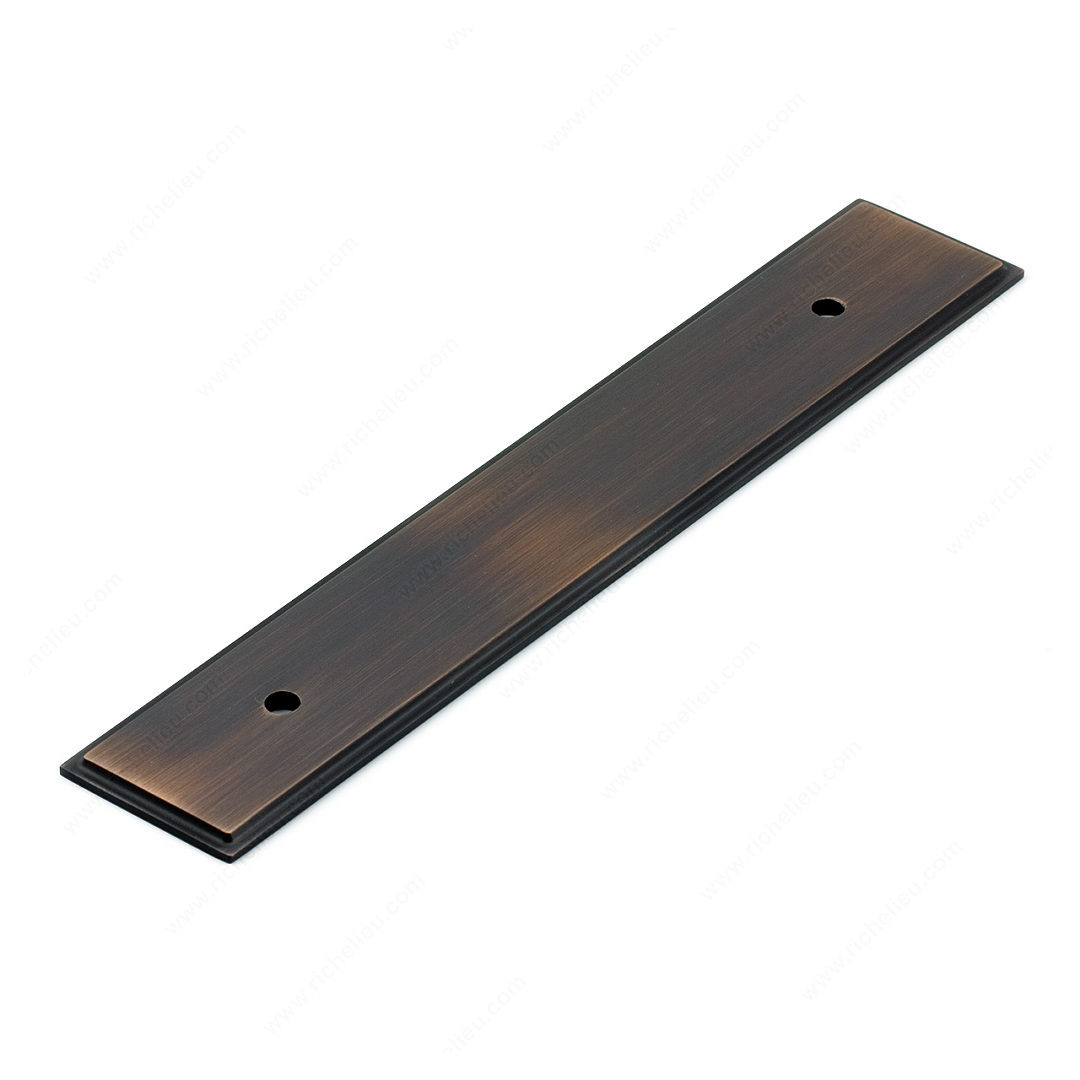 Richelieu BP1045128BORB Transitional Metal Backplate for Pull - 1045 offers a refined touch to kitchen and bathroom cabinetry. This decorative backplate is crafted from durable metal and features an elegant oil-rubbed bronze finish that beautifully combines shades of brown and bronze, enhancing the overall aesthetic of your space. With an overall length of 7 13/32 inches and a width of 1 1/4 inches, this backplate is designed for pulls with a center-to-center measurement of 5 1/32 inches, making it an ideal choice for transitional style hardware. Its slim projection of just 3/16 inches ensures a sleek profile that fits seamlessly in any décor. The Richelieu BP1045128BORB not only elevates the visual appeal of your cabinetry but also provides a practical solution, as it helps to cover any imperfections left by previous hardware. Please note that screws or nails are not included, allowing for customization depending on your installation needs. Whether you're renovating your home or simply looking to update your cabinets, this backplate is an excellent choice for both building professionals and discerning homeowners alike. Upgrade your space with the timeless elegance of Richelieu.