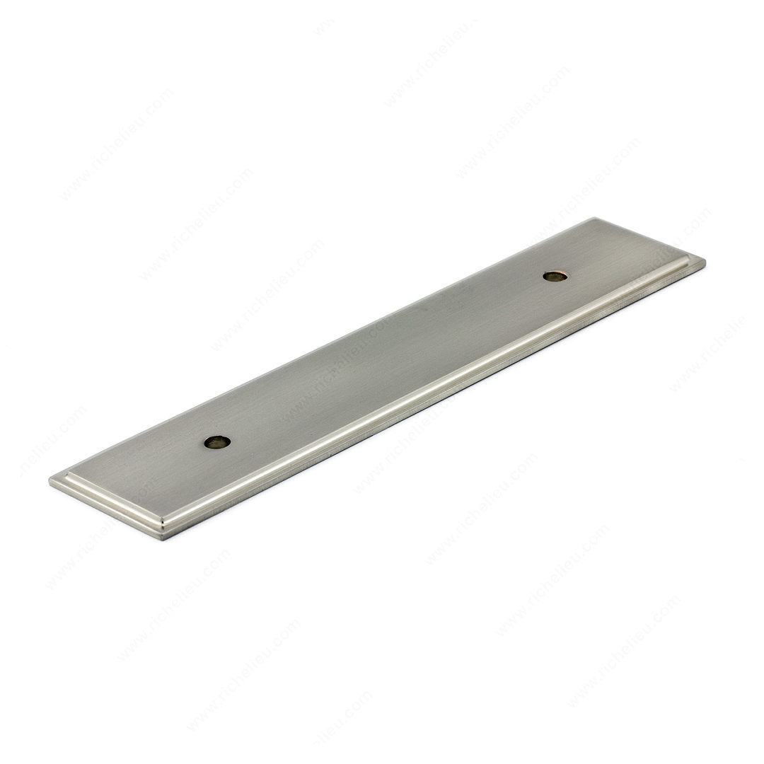 Richelieu BP104596195 Transitional Metal Backplate for Pulls offers a sophisticated upgrade for kitchen and bathroom cabinetry. Designed with a modern transitional style, this metal backplate seamlessly complements various décor, enhancing the overall aesthetic of your space. Available in two elegant color combinations-Gray and Chrome, and Brown and Bronze-this backplate adds a touch of refinement to any interior. With an overall length of 6 5/32 inches and a width of 1 1/4 inches, the BP104596195 is perfectly sized to create a striking visual impact while maintaining functionality. The brushed nickel finish (Finish Number: 195) not only provides durability but also ensures a sleek appearance that resists tarnishing over time. The center-to-center measurement of 3 25/32 inches allows it to fit standard pulls effortlessly. Constructed from high-quality metal, the backplate features a subtle projection of 3/16 inches, making it an unobtrusive yet effective addition to your cabinetry. Please note that screws or nails are not included, allowing for customization during installation. Elevate your cabinetry with the Richelieu BP104596195, where style meets practicality.