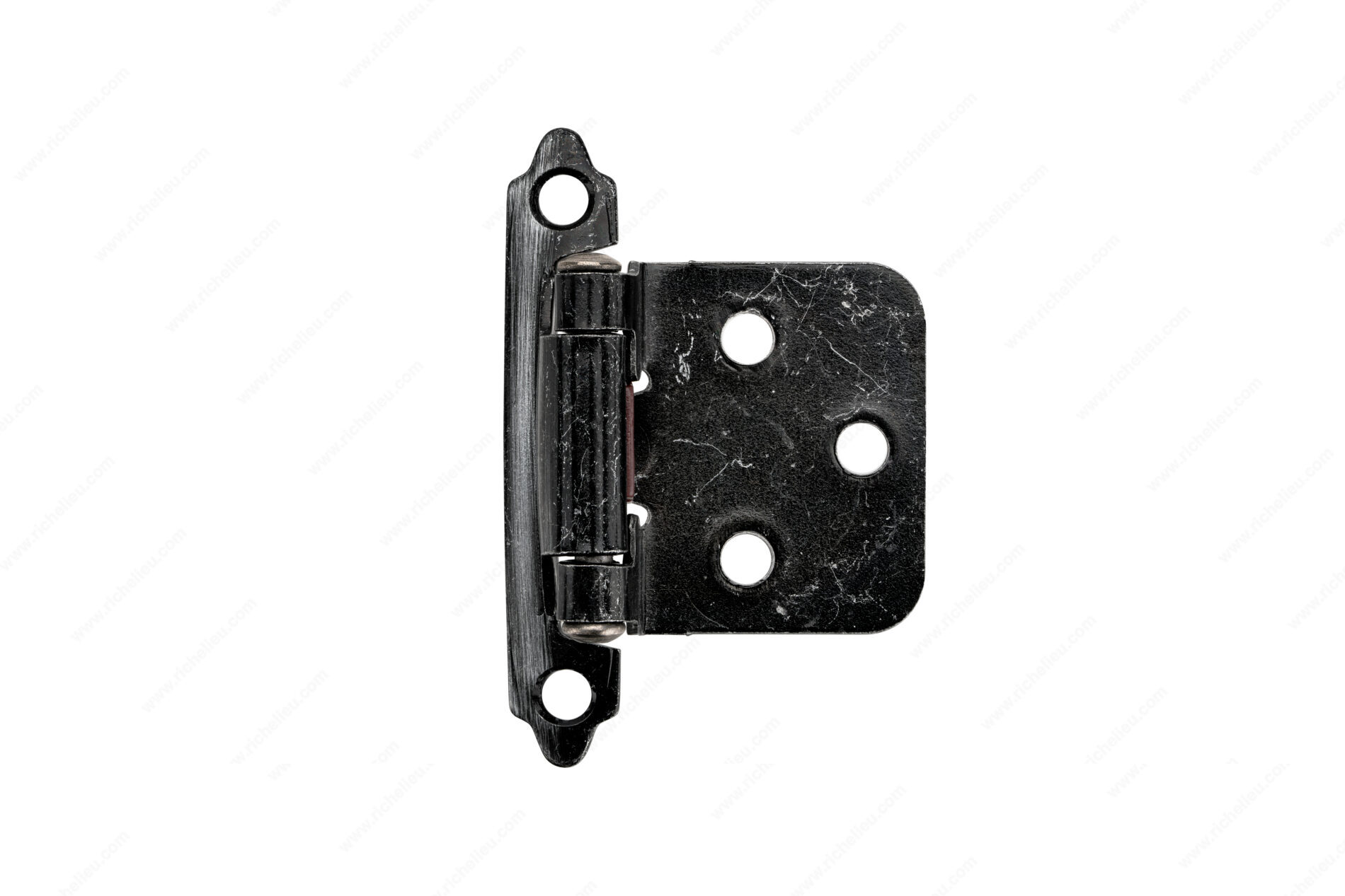 Richelieu BP134242 Semi-Concealed Self-Closing Hinge - 134 offers a seamless blend of functionality and style, making it an excellent choice for a variety of applications. Crafted from durable steel, this hinge is designed to withstand the demands of daily use while providing a sophisticated finish. The brushed pewter finish not only enhances its aesthetic appeal but also ensures compatibility with a wide range of decor styles in kitchens, bathrooms, and furniture. Measuring 2.76 inches in height, 1.86 inches in width, and with a projection of 25/32 inches, this hinge is compact yet robust. It features a traditional surface design that allows for easy installation with the included #5 screws, making it a practical addition to any project. The semi-concealed design ensures that the hinge blends seamlessly into cabinetry, providing a clean look while maintaining the self-closing functionality that keeps doors securely shut. Packaged in a convenient bag of two units, the BP134242 hinge is an efficient choice for both professionals and DIY enthusiasts. Whether you are updating your kitchen or enhancing bathroom cabinetry, this hinge is the perfect finishing touch that combines reliability with elegant design.