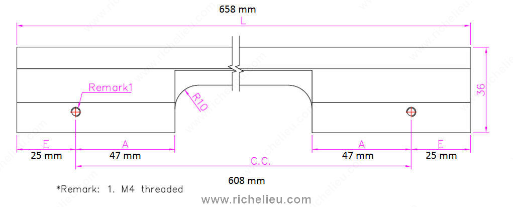Richelieu BP1390160810 Modern Aluminum Pull - 1390 is an excellent choice for enhancing contemporary spaces with its sleek design and refined aluminum finish. Designed to seamlessly blend into modern décor, this pull features clean lines that add an elegant touch to cabinet doors and drawer fronts. Measuring 26 inches in overall length, this pull provides a comfortable grip and a striking visual appeal. The center-to-center measurement of 23 7/8 inches ensures compatibility with a variety of installations, while the overall projection of 1 7/32 inches offers a practical design that does not protrude excessively. Crafted from durable aluminum, the pull boasts a sophisticated gray and chrome color scheme, making it versatile enough to complement any cabinetry style. The included M4 screws simplify the installation process, allowing you to quickly elevate your space. With a width of 1 13/32 inches, this extra-long pull is not only functional but also a statement piece that can transform your furniture. Ideal for both building professionals and discerning homeowners, the Richelieu BP1390160810 is a perfect choice for those looking to marry style with practicality in their interior designs.