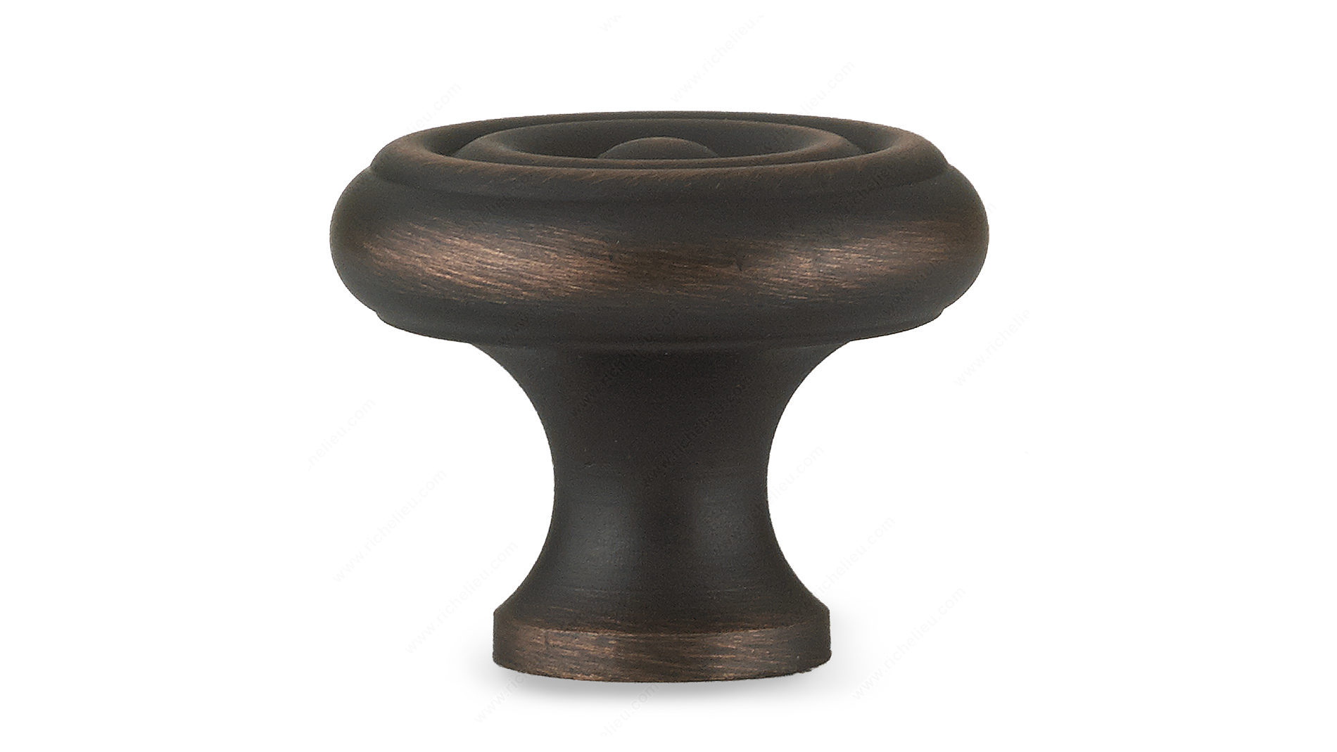 Richelieu BP1430BORB Traditional Brass Knob - 1430 enhances your kitchen or bathroom with its timeless allure. This round knob, featuring a classic circular design, is perfect for those looking to infuse their spaces with a touch of elegance. Crafted from durable brass, its construction ensures longevity while adding a sophisticated aesthetic to your cabinetry. The knob's brushed oil-rubbed bronze finish, characterized by rich brown and bronze tones, complements a variety of décor styles, making it a versatile choice for any renovation or upgrade. With an overall diameter of 1 1/4 inches and a projection of 1 3/16 inches, this knob is designed for comfortable grip and easy handling. Each knob comes with an 8/32 inch screw included, facilitating a straightforward installation process. The traditional style of the Richelieu BP1430BORB is not just about looks; it also offers functionality that meets the needs of both building professionals and discerning homeowners alike. Whether you're refreshing your kitchen cabinets or updating bathroom fixtures, this knob stands out as a reliable and stylish choice. Trust Richelieu to deliver quality and charm that elevates your space effortlessly.