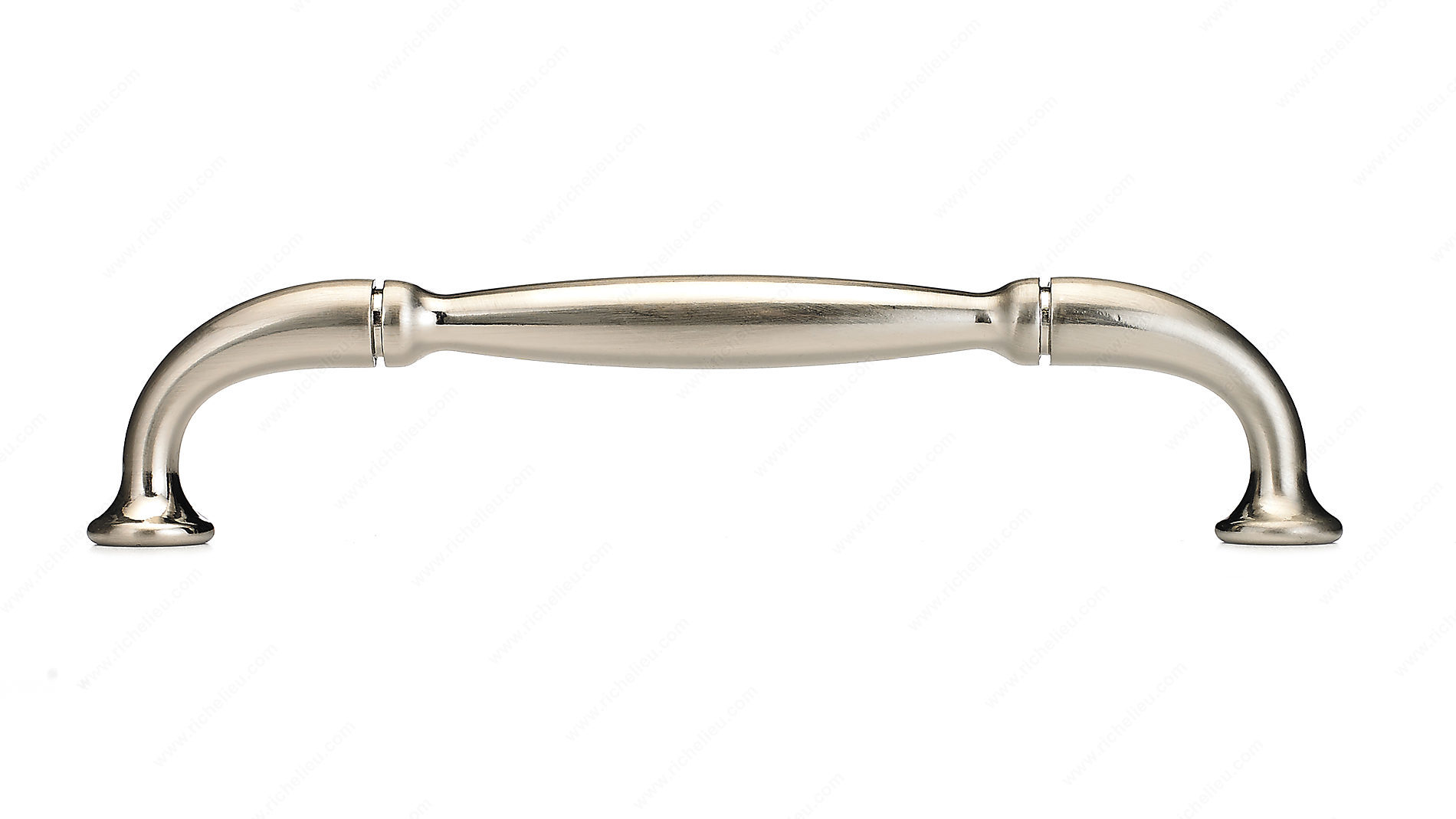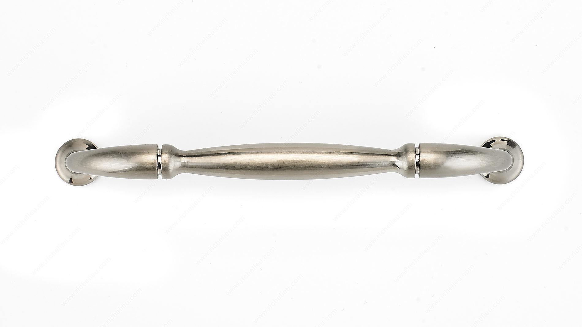 Richelieu BP23737128195 Traditional Metal Pull - 237 is an exquisite addition to any cabinetry or furniture, offering a classic design that complements a variety of decors. Crafted from durable zamak, this metal pull features a delicately arched handle with sturdy flared ends, enhancing both functionality and aesthetic appeal. The brushed nickel finish (Finish Number: 195) provides a sleek, modern touch while ensuring lasting durability. With an overall length of 5 5/8 inches and a projection of 1 3/16 inches, this pull is not only stylish but also practical. The base diameter of 19/32 inches and a center-to-center measurement of 5 1/32 inches make installation straightforward, and the included 8/32 inch screws simplify the process further. Available in a sophisticated gray and chrome color scheme, the Richelieu Traditional Metal Pull is designed for those who appreciate the finer details in their home or project. Its traditional style is perfect for enhancing kitchen cabinetry, bathroom vanities, or furniture pieces. Whether you're a building professional or a discerning homeowner, this pull offers a seamless blend of style and quality that will elevate your interior design.