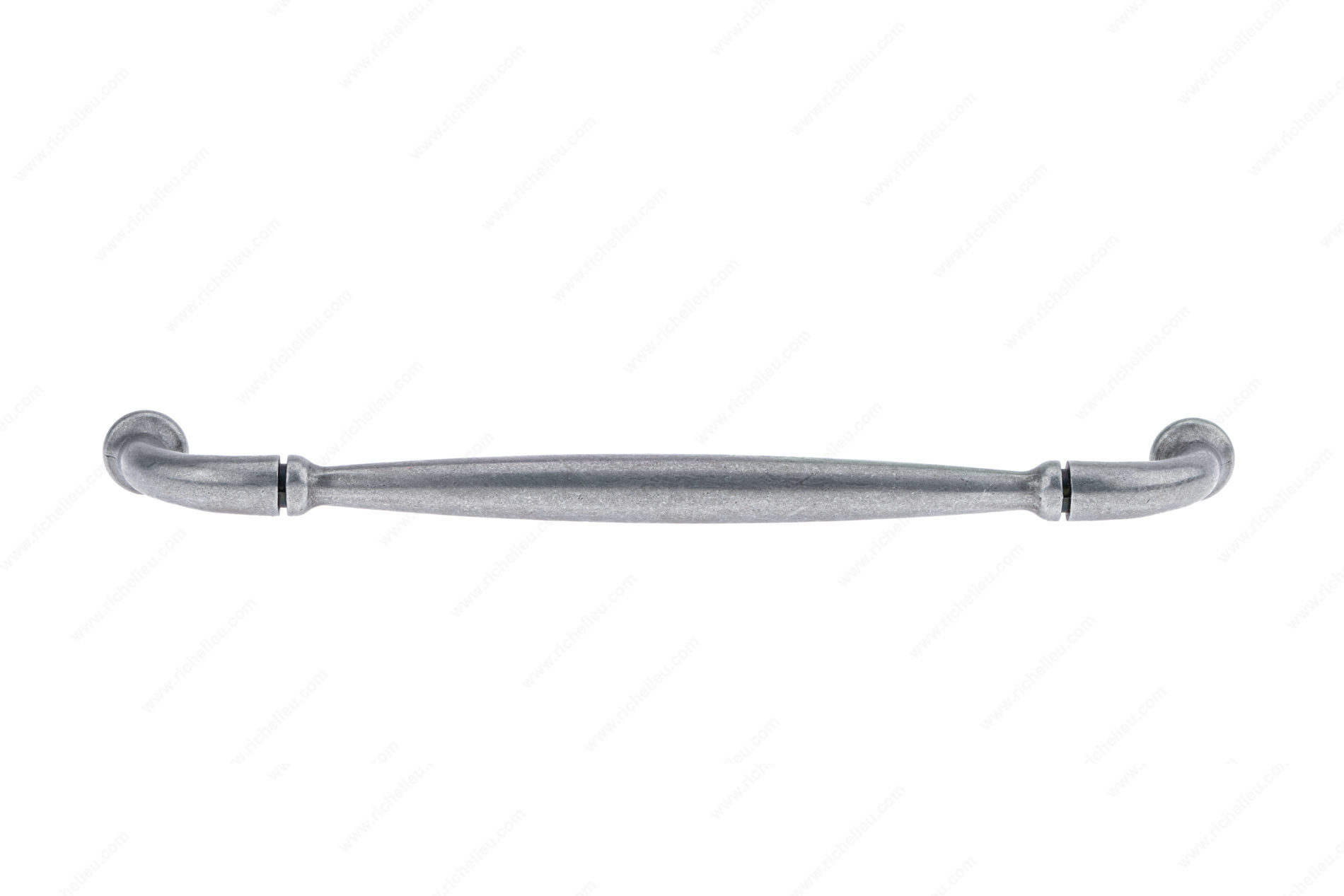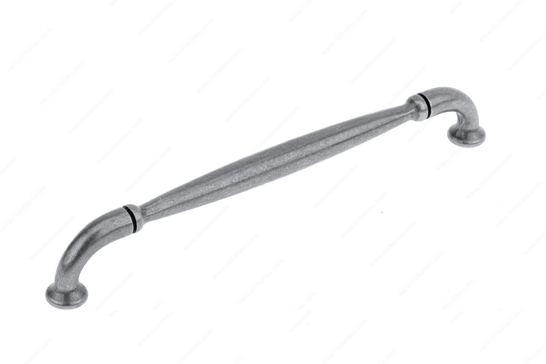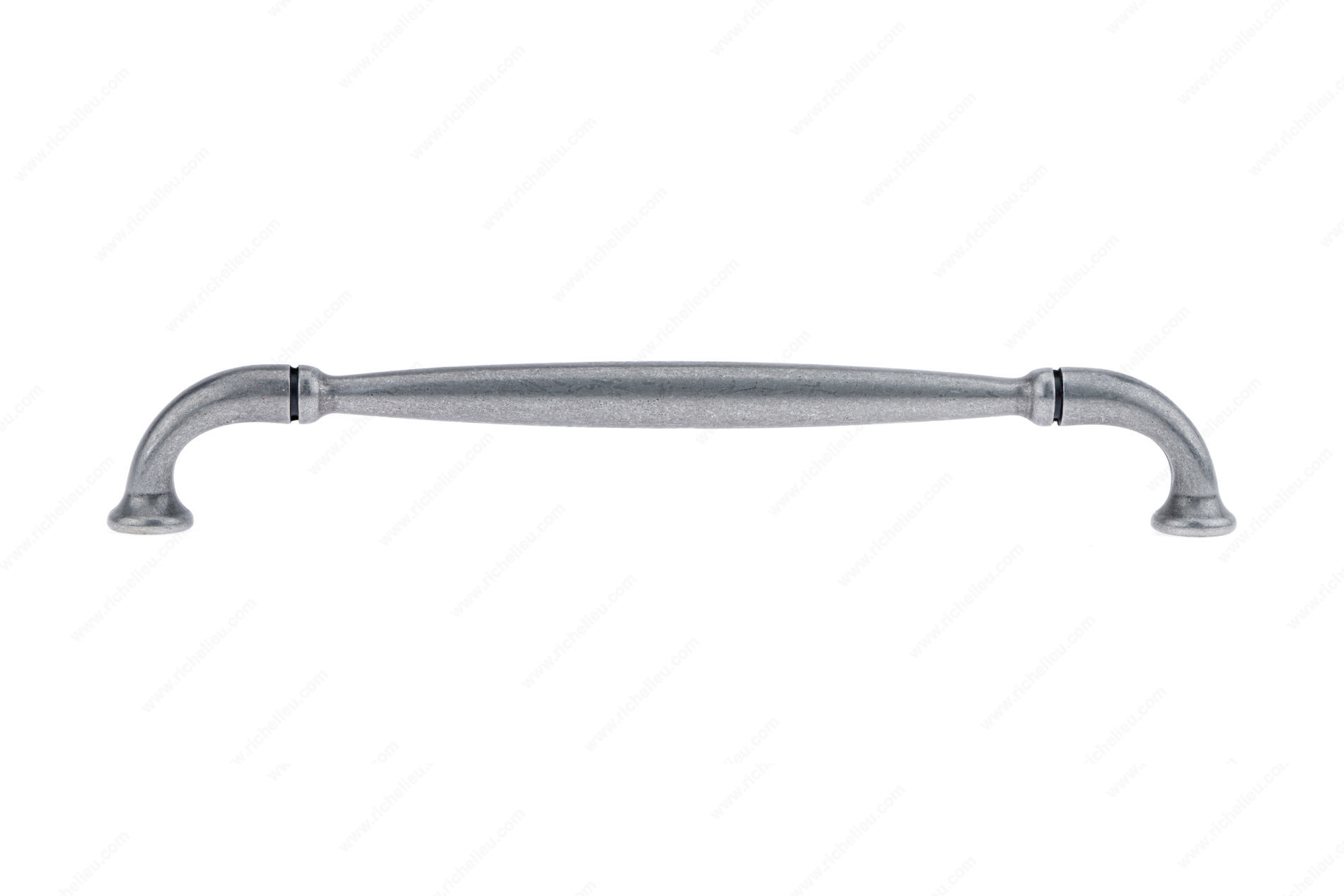 Richelieu BP23737192907 Traditional Metal Pull - 237 offers a classic touch to your cabinetry with its elegantly designed metal pull. This distinguished handle features a delicately arched shape and sturdy flared ends, making it the perfect embellishment for a variety of décor styles, especially those leaning towards traditional aesthetics. Crafted from durable zamak, this pull comes in a sophisticated gray and chrome color scheme, complemented by a wrought iron finish that enhances its timeless appeal. With an overall length of 8 9/32 inches and a center-to-center measurement of 7 9/16 inches, it is designed to provide an optimal grip while maintaining an understated elegance. The pull projects out 1 3/8 inches, ensuring it is easy to grasp, while its width of 9/16 inch adds to its sleek profile. Installation is straightforward, as it includes an 8/32 inch screw for easy mounting. This model falls under the Country Style category, making it an excellent choice for kitchens, bathrooms, or furniture pieces seeking a refined yet functional hardware solution. Elevate your space with Richelieu’s Traditional Metal Pull, where style meets practicality.